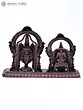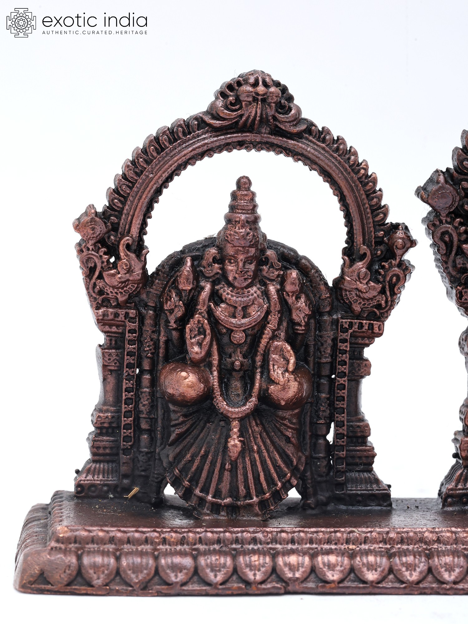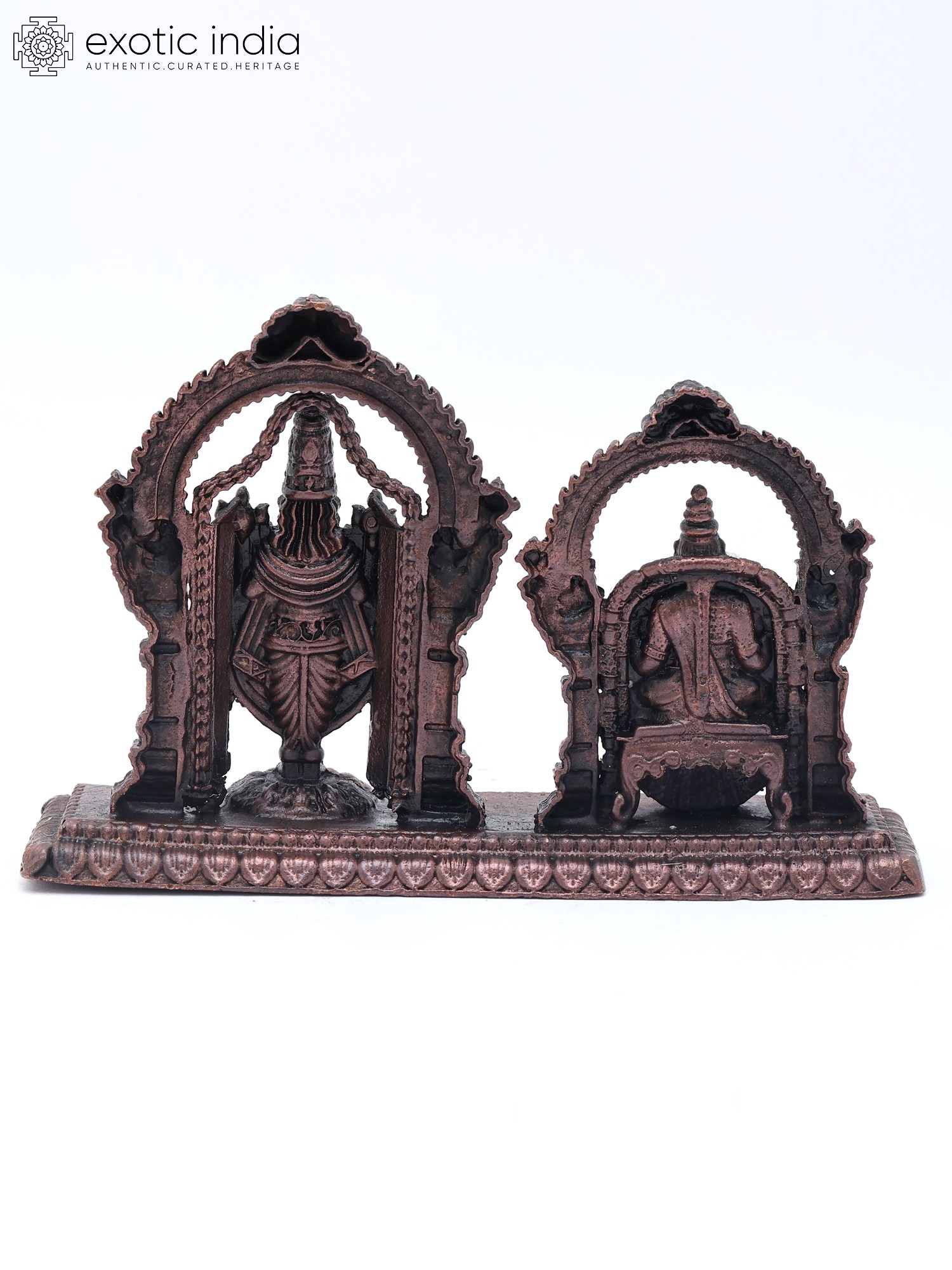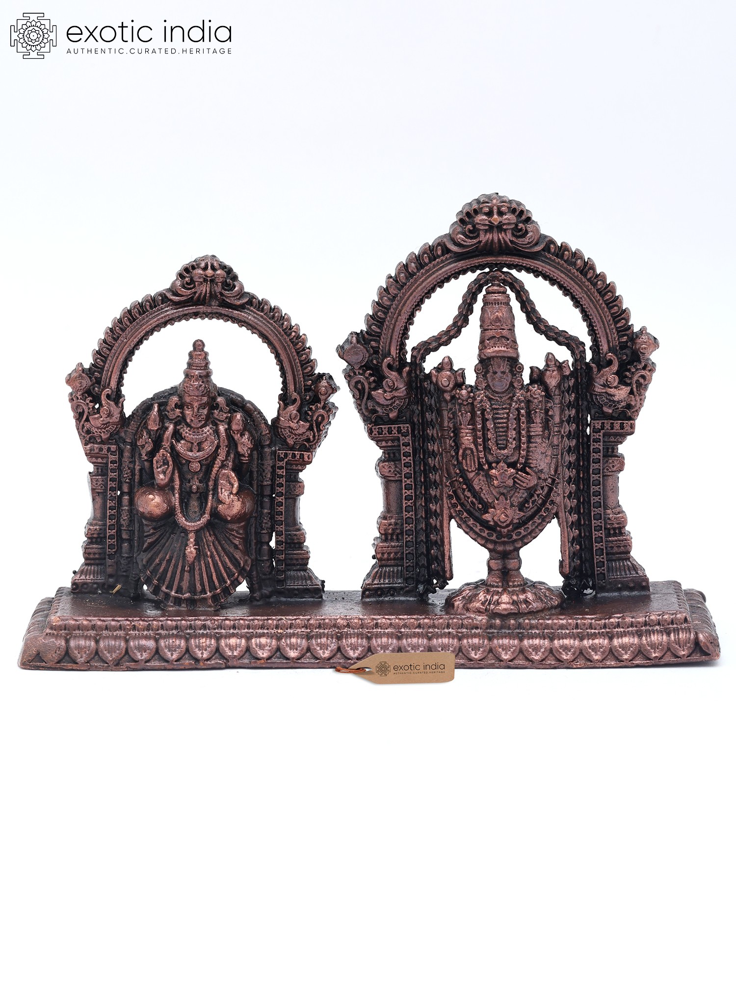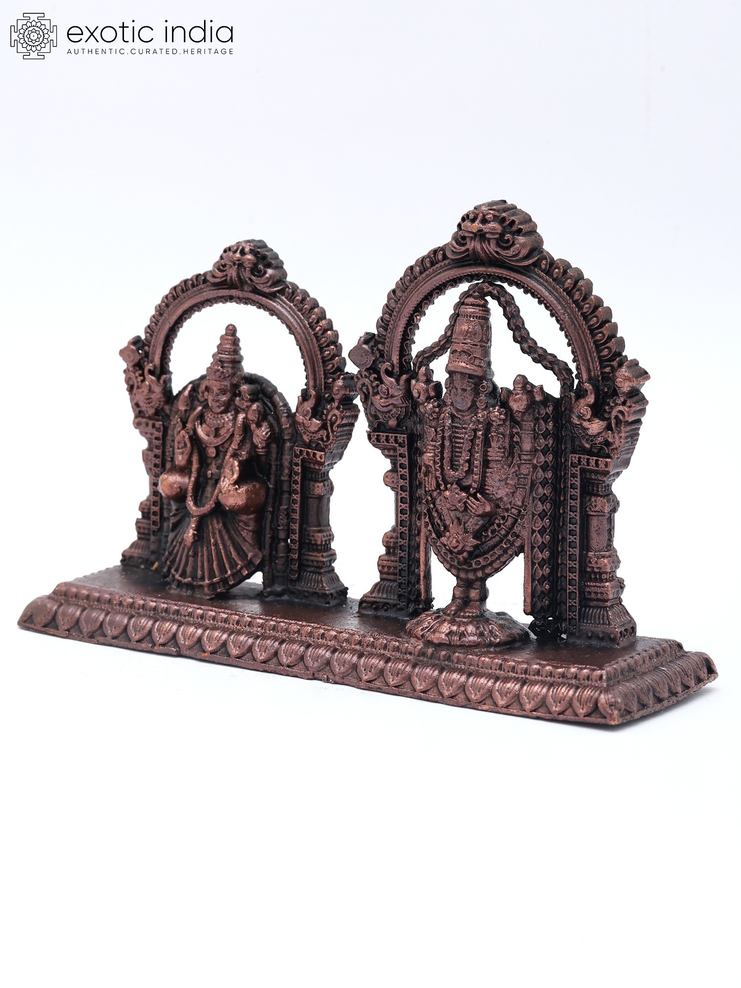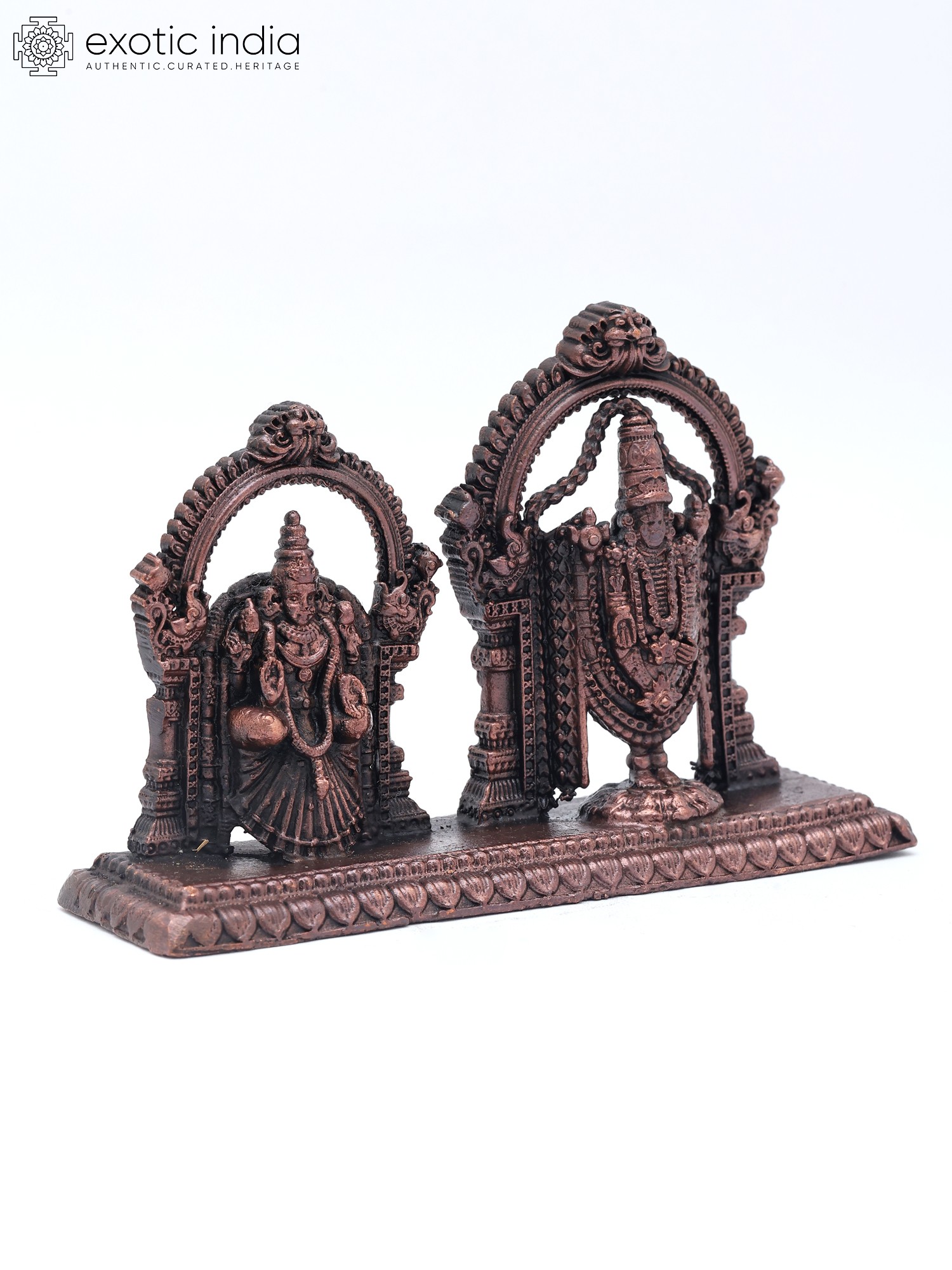 According to Tamil Bhakti tradition, Sri Tirupati Balaji is the pinnacle of divine manifestation and the cosmic parent who, along with Devi Padmavathi (Lakshmi), protects and nurtures his children. Presented as Puja Murti, Balaji, and Padmavati, depicted in this beautiful copper statue exude vitality, majesty, and bliss with their very presence. Each emblem is set icon a separate aureole and is adorned with elaborate jewelry and regal clothing. The intricacy of the details on the idols is alluring, which lends the miniature composition a regalia beyond words.