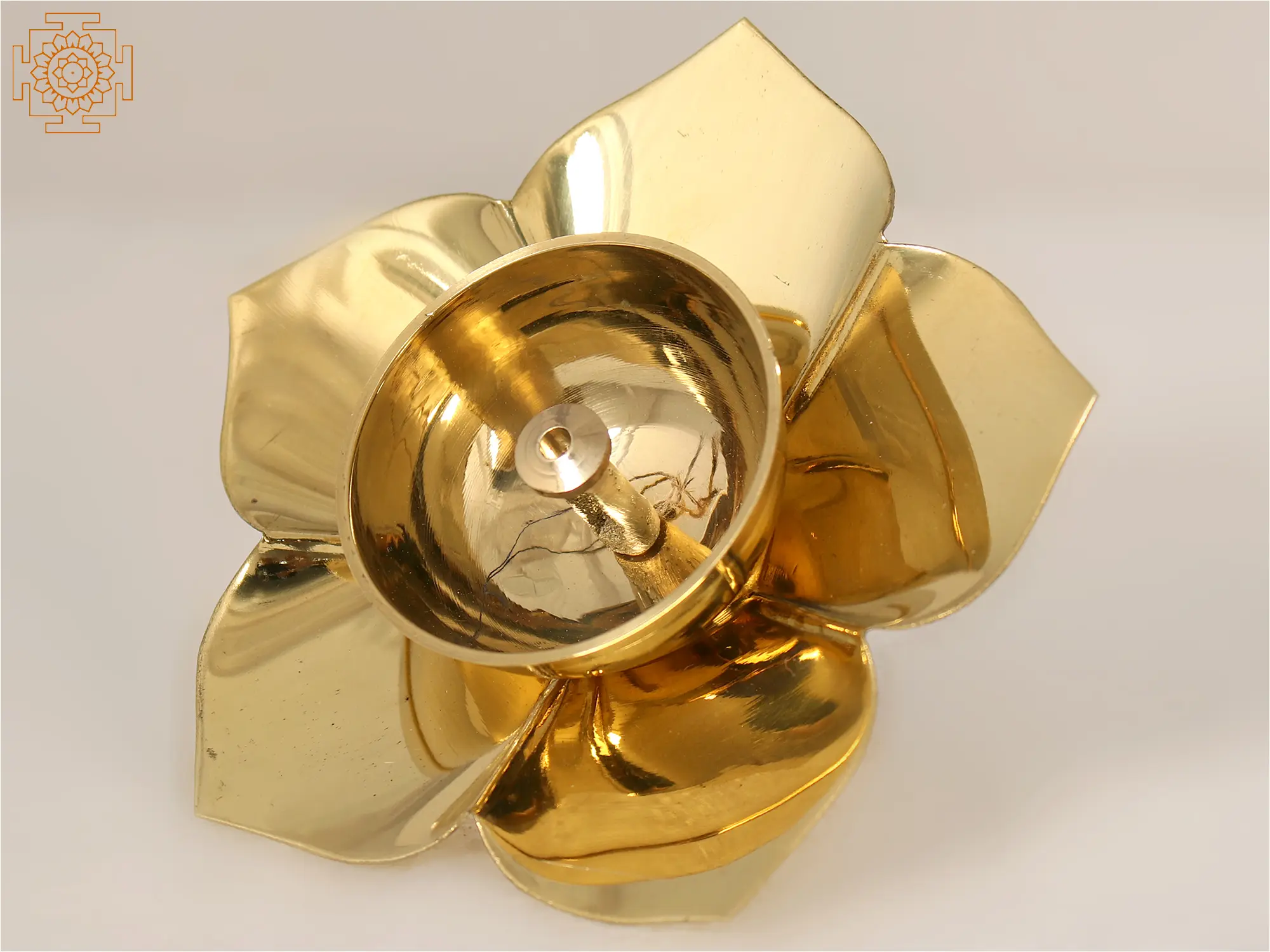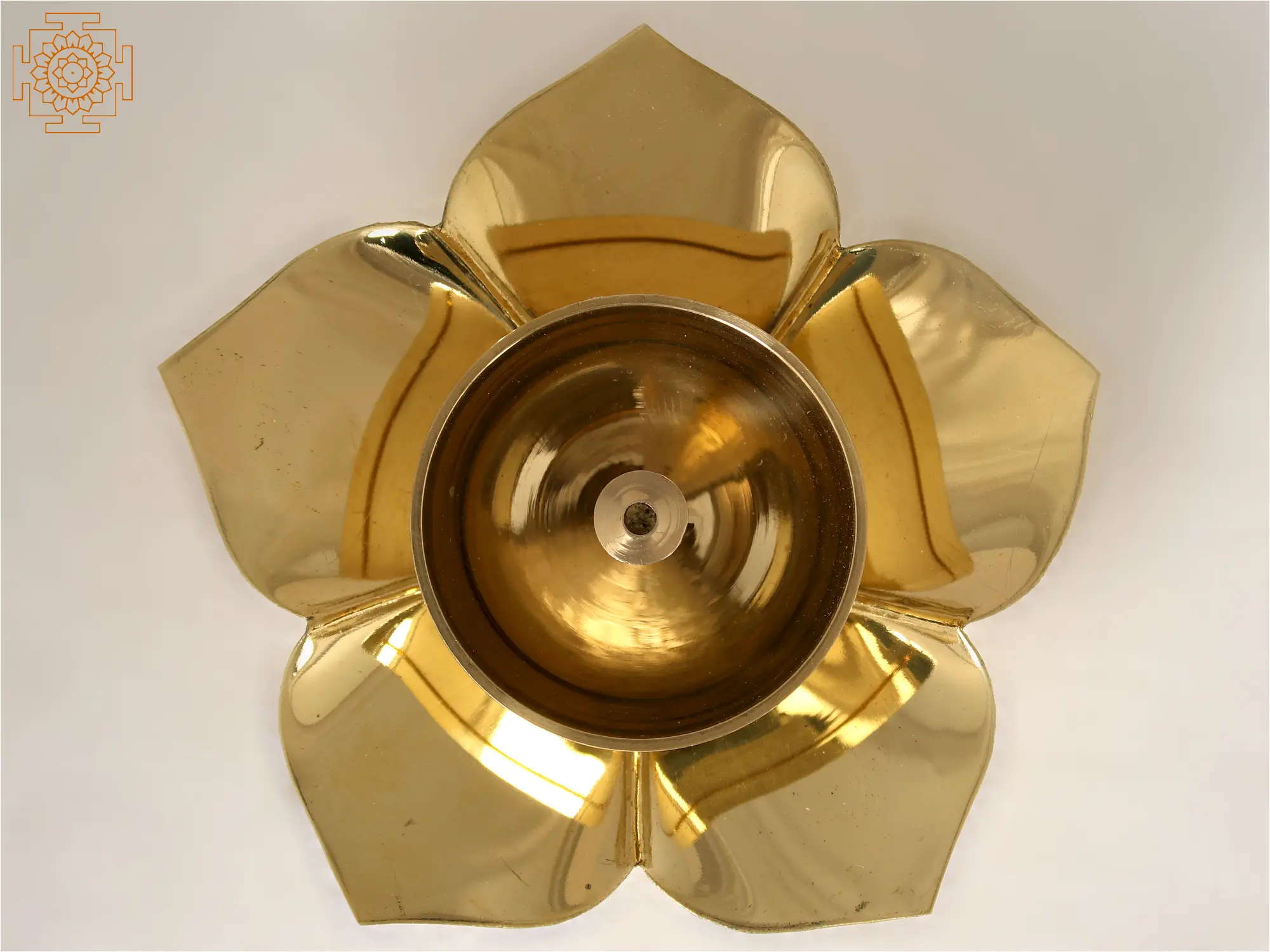 Kalidasa in his Ritusamhara gave special importance to the beauty of the Lotus. His verses explain how the delicate petals of rose get soiled or fall after aggressive droplets of rain touch them. This brass lamp with a central vessel of wick, looks like the manifestation of Kalidasa poems. The delicate petals of Lotus made of brass surround the oil basin. When lit the lamp looks like a lotus lit with the light of the soul.
