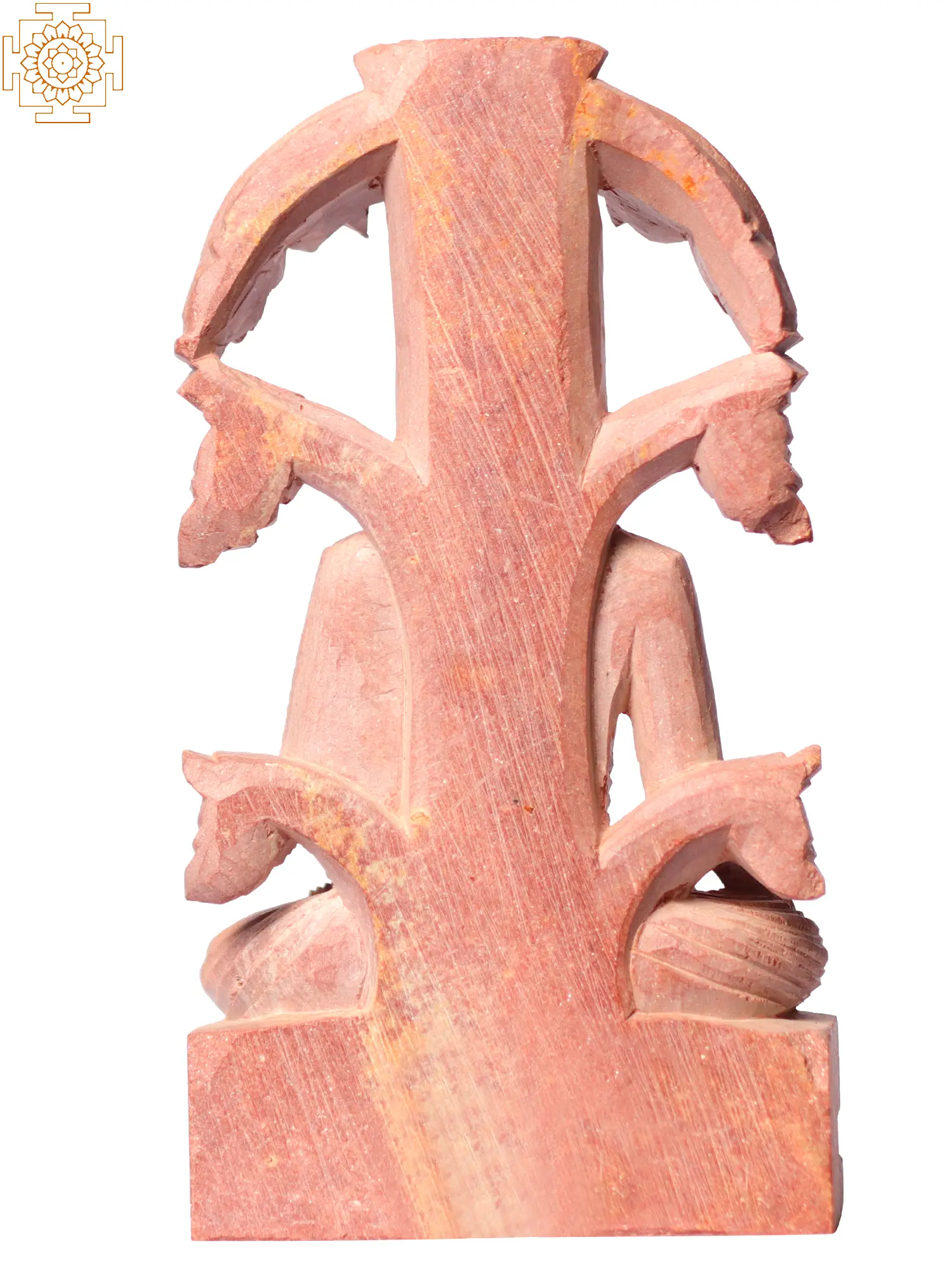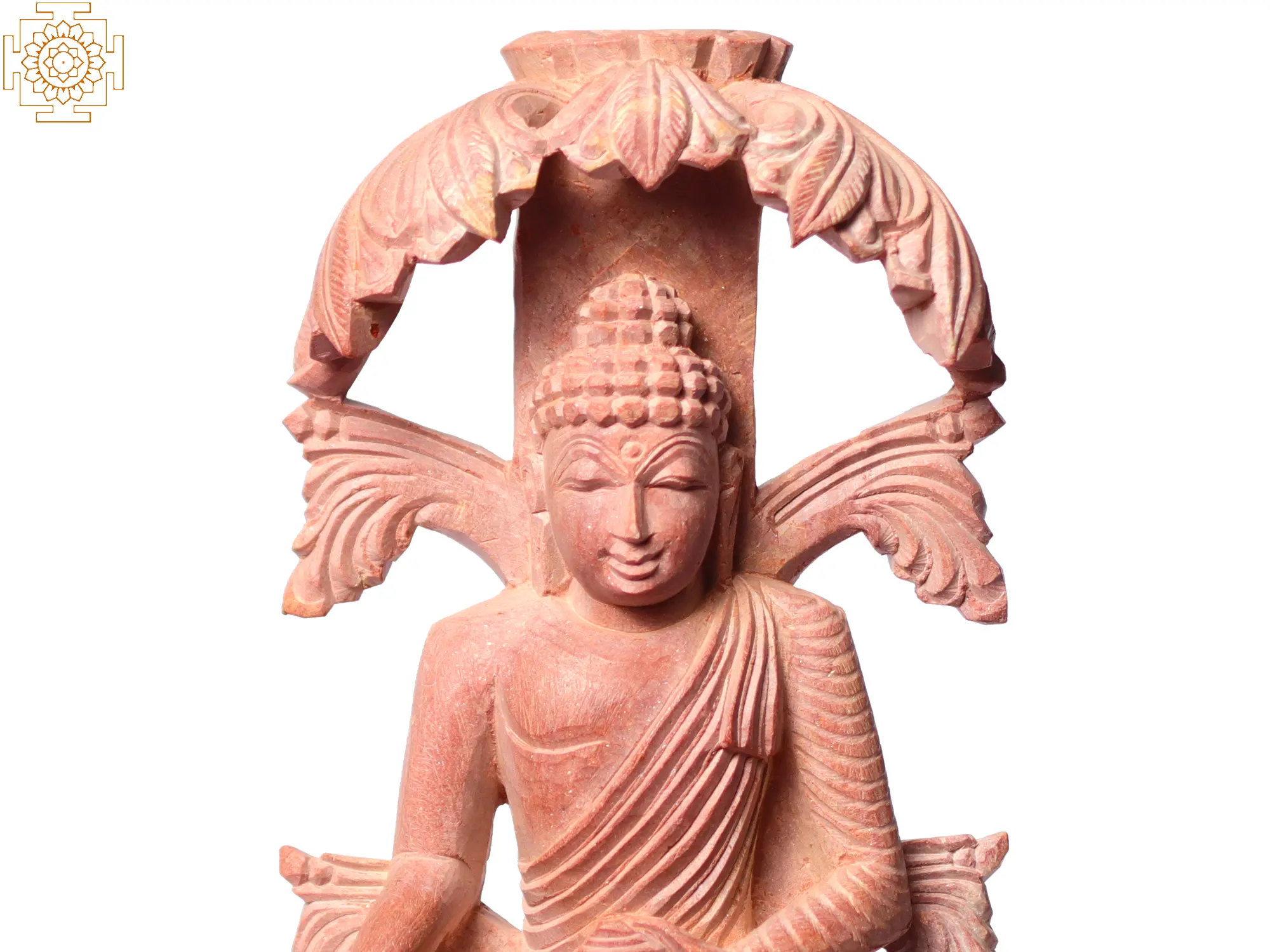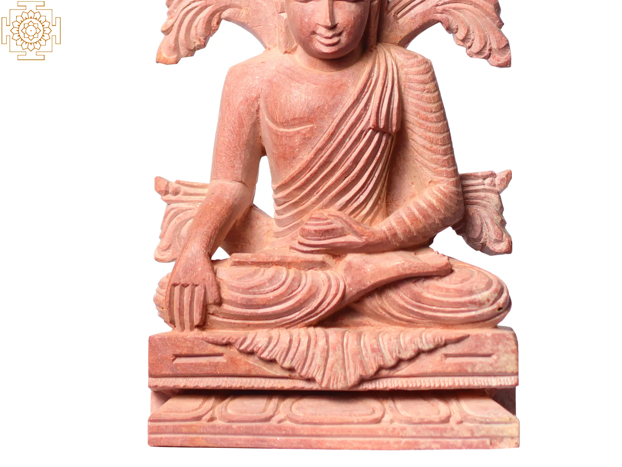 Depicted in the seated meditation posture, known as the Dhyana mudra, Buddha with his right-hand touches the ground as the left-hand rests on the lap. This mudra symbolizes the pivotal moment when the Buddha called upon the Earth as his witness to his enlightenment and his ultimate triumph over ignorance and delusion. Crafted from beautiful pink stone, this sculpture exudes gentle and serene energy. The soft, pastel hue of the stone adds an element of tranquility and serenity to the artwork, enhancing its spiritual essence. The delicate detailing and smooth contours of the sculpture reflect the craftsmanship and dedication of the artisans who brought it to life.