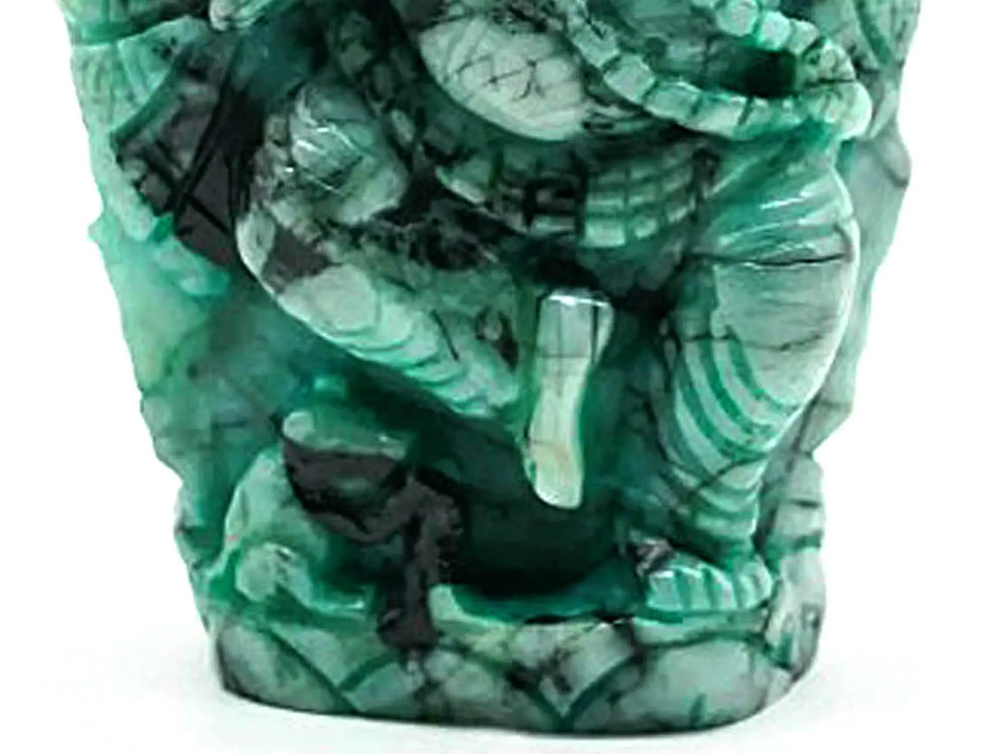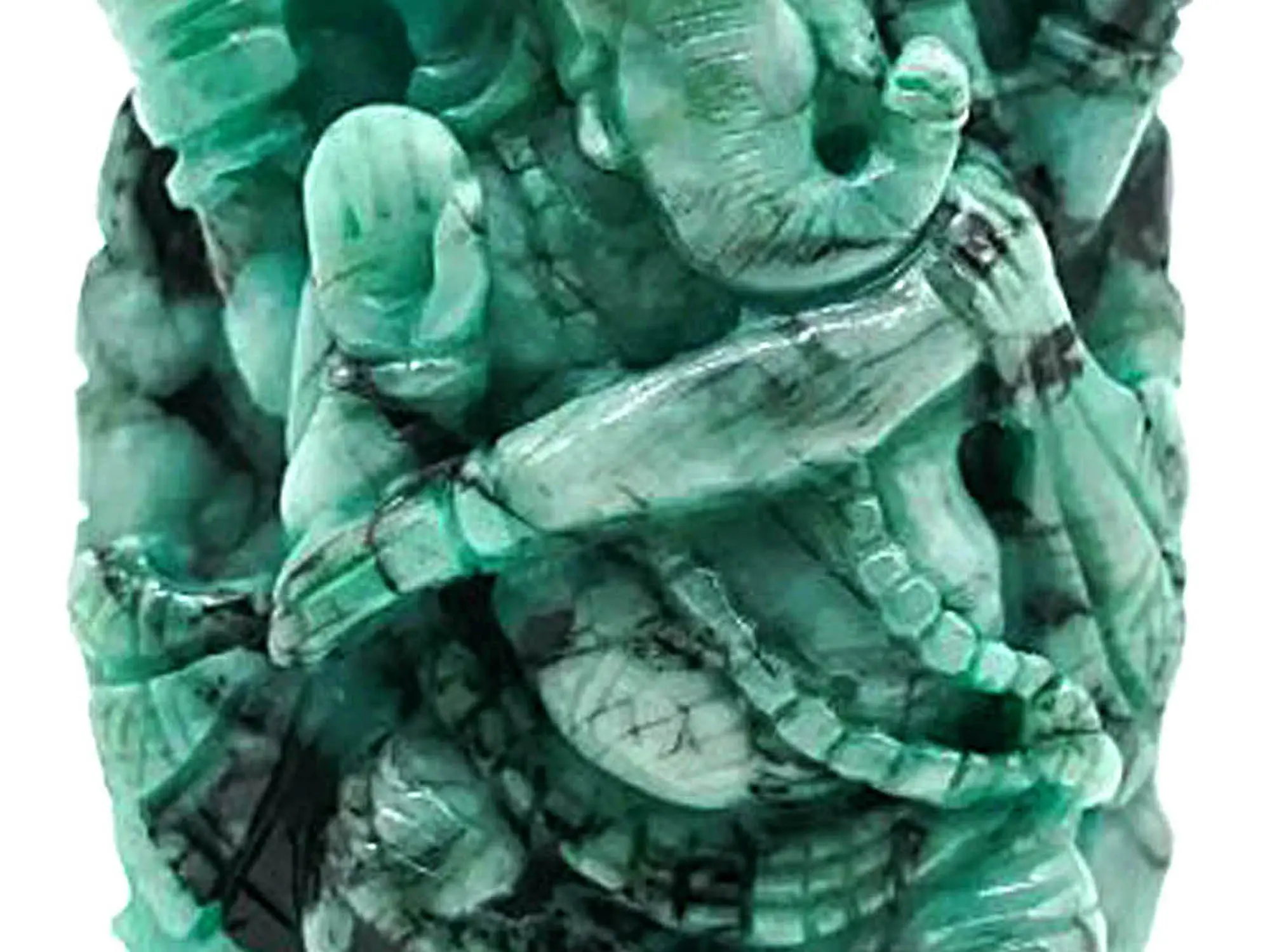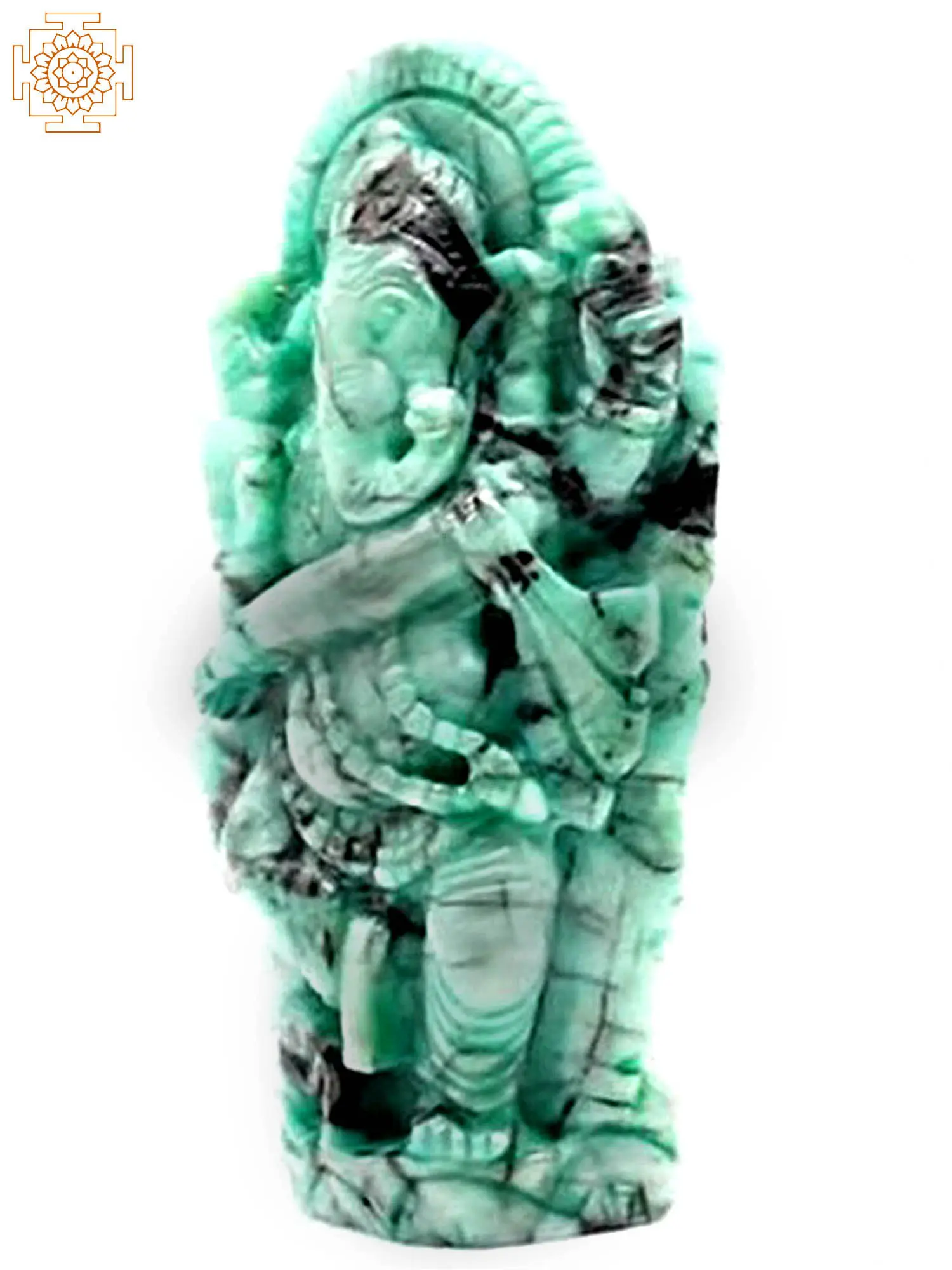 The Small Emerald Dancing Ganesha is a divine presentation of Lord Ganesha, the revered deity in Hindu Scriptures. Carved with precision and adorned with a scarf, this four-armed dancing Ganesha statue holds immense significance. The emerald, a precious gemstone, is the symbol of abundance and prosperity. Combining the auspiciousness of Ganesha with the vibrancy of emerald, this statue becomes a potent talisman. Ganesha, known as the remover of obstacles, brings blessings of success and harmony. The emerald accentuates the divine energy, making this carving an auspicious addition to any sacred space.