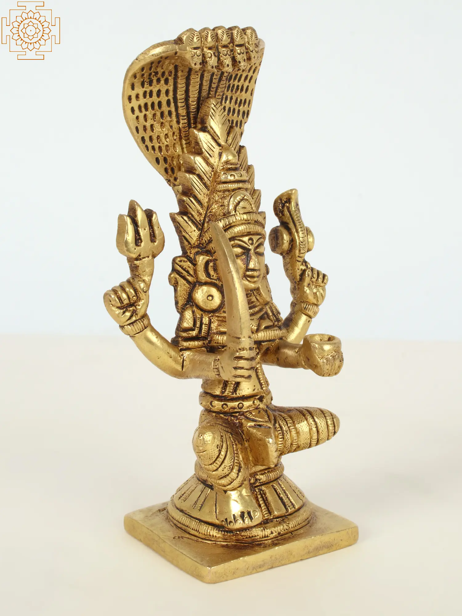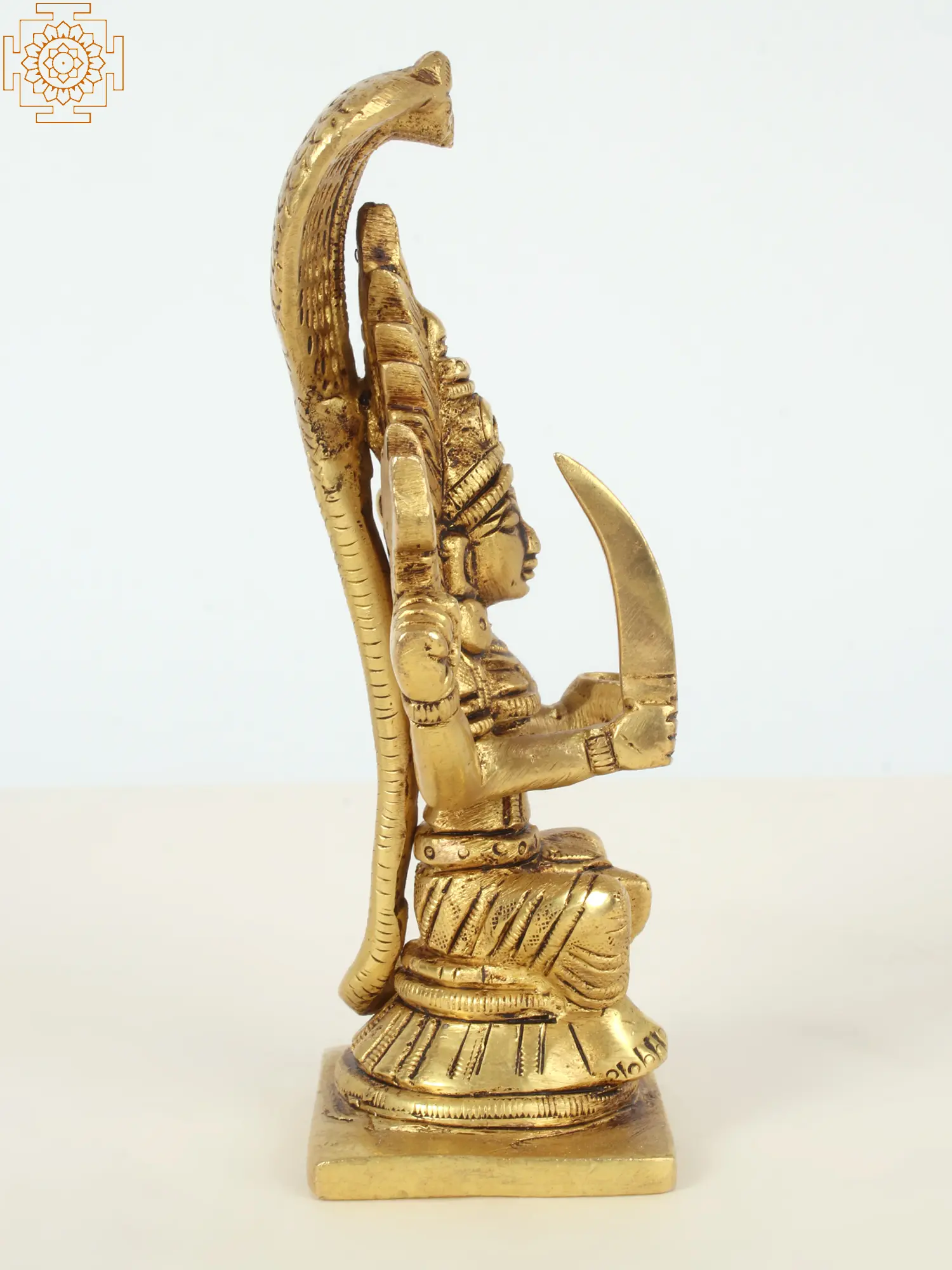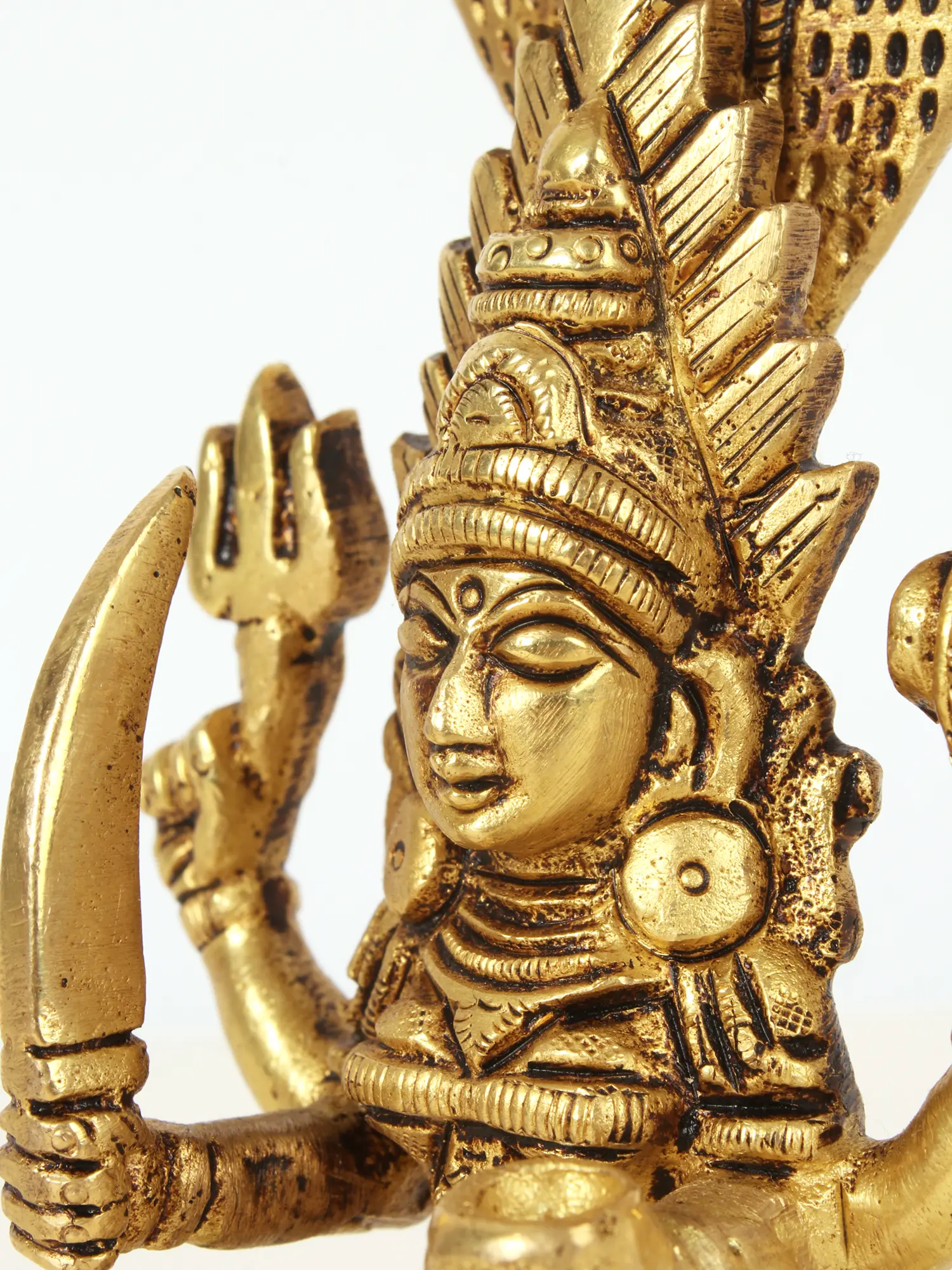 Goddess Mariamman, the South Indian equivalent of Adi-Shakti, the primordial goddess, whose form encapsulates the powers of all Devis, is presented in this fine small brass statue in her characteristic roopa- seated on an inverted lotus throne, with a Naga shading her, attired delicately and haloed by the flames of divine consciousness.
