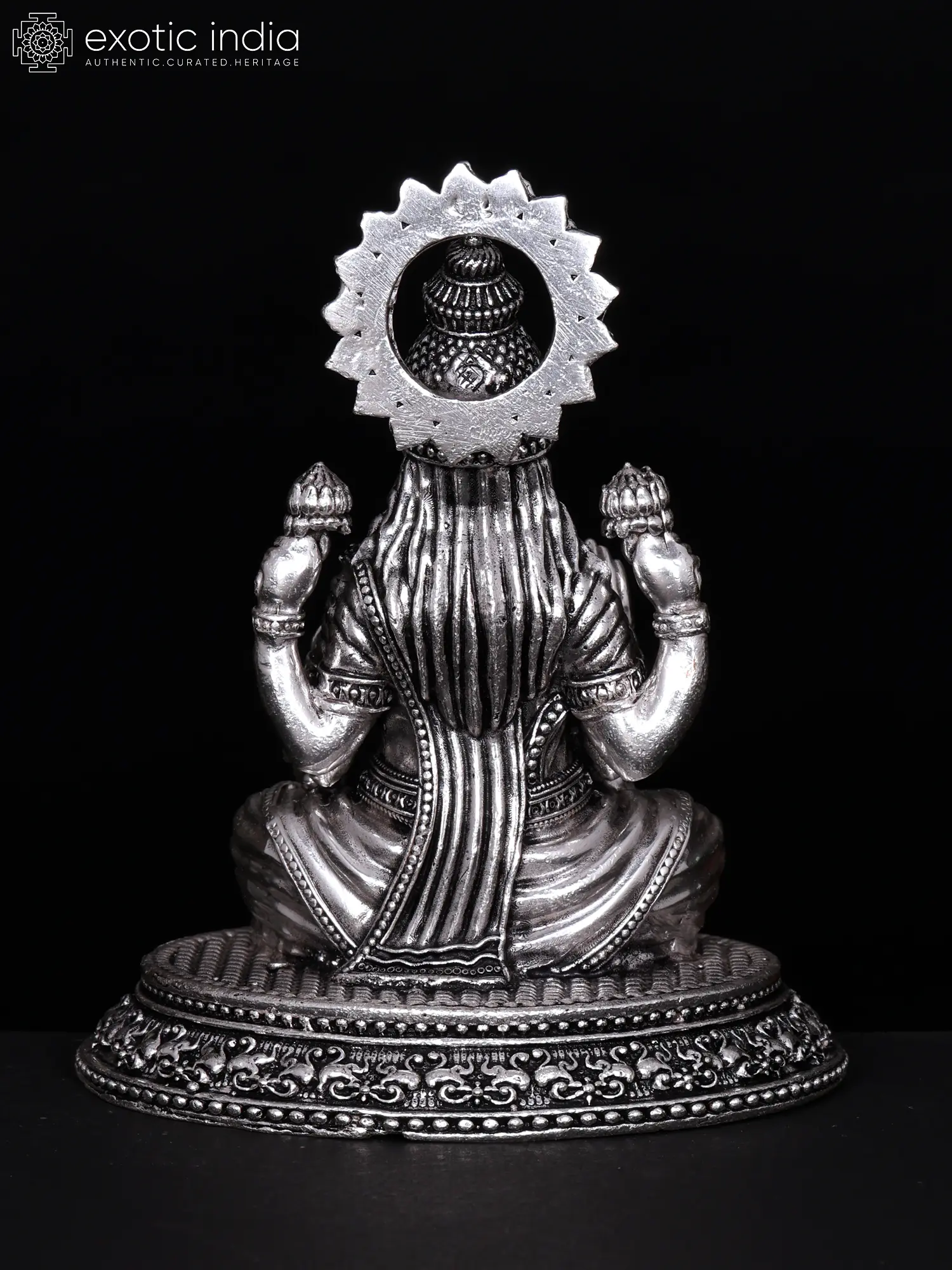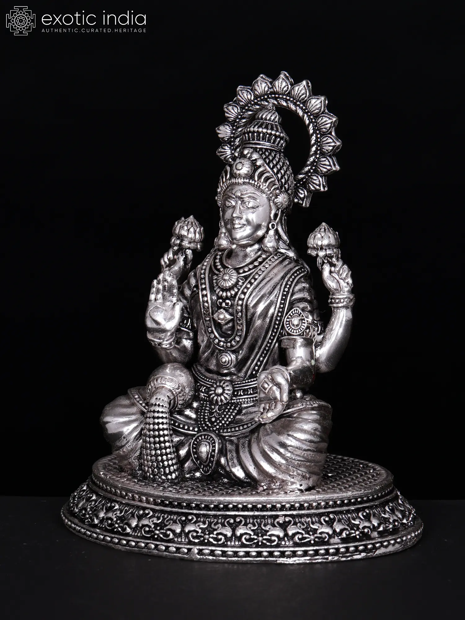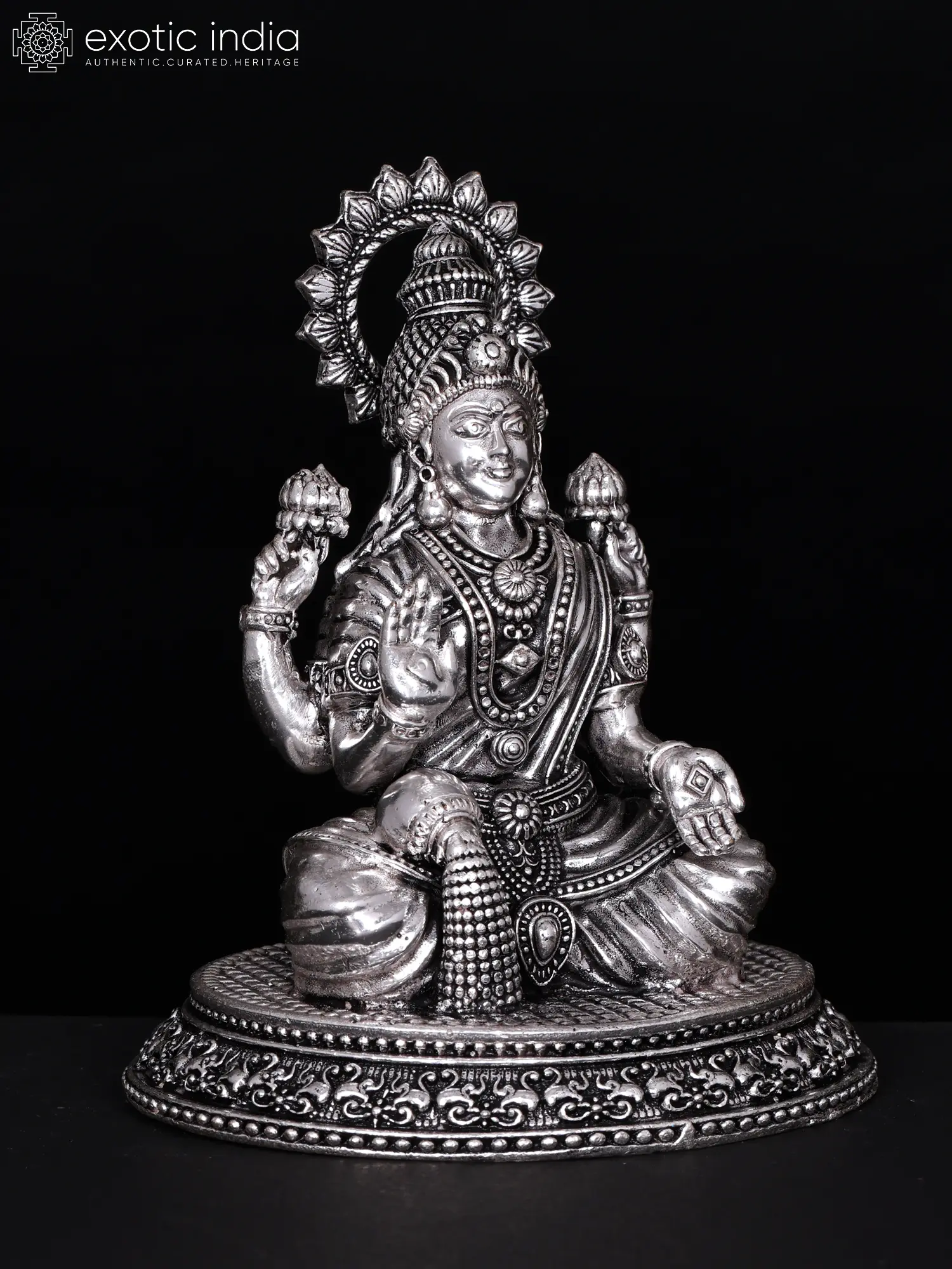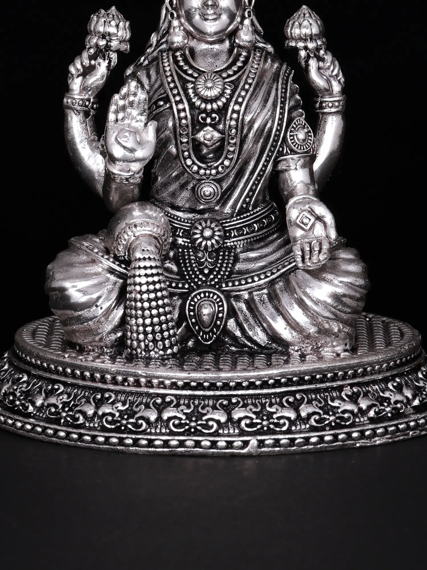 This statue is meticulously handcrafted using high-quality brass, a metal traditionally associated with strength, durability, and spiritual purity in many cultures. The silver finish enhances the statue's elegance, while the intricate detailing captures the goddess's divine beauty and the richness of Hindu iconography. Each element, from Lakshmi's serene expression to the ornate embellishments on her garments and the base, speaks to the dedication and artistry behind this creation. The compact size makes it a versatile addition to any space, allowing you to easily incorporate the goddess's blessings into your daily life. It's a testament to the rich artistic heritage and the timeless symbolism of Hindu goddesses.
