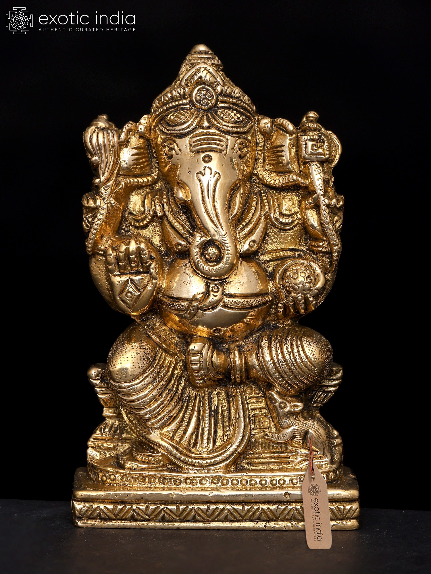 Bring home the divine presence of Lord Ganesha, the Vighnaharta – remover of obstacles and the bestower of good fortune. This exquisite brass statue captures the beloved deity in a serene and powerful pose, seated with an aura of wisdom and grace. Crafted from high-quality brass, this piece embodies the rich artistic traditions of India, where metalwork has been an integral part of devotional art for centuries. The inherent luster of brass adds a timeless elegance, making this statue a captivating centerpiece for any sacred space or home altar. The four-handed depiction of Ganesha is significant. In his upper right hand, he holds an axe, symbolizing the destruction of ignorance and attachment. His upper left hand cradles a noose, representing the entanglement of the world and the means to overcome worldly desires. The lower right hand is raised in Abhaya Mudra, offering blessings and protection to his devotees. In his lower left hand, he holds a sweet, often depicted as a Modak, a testament to his known fondness for this delicacy and his reputation as the god of appetite and nourishment. The Modak itself is a symbol of spiritual awakening, its outer shell representing the material world and the sweet filling representing inner bliss.