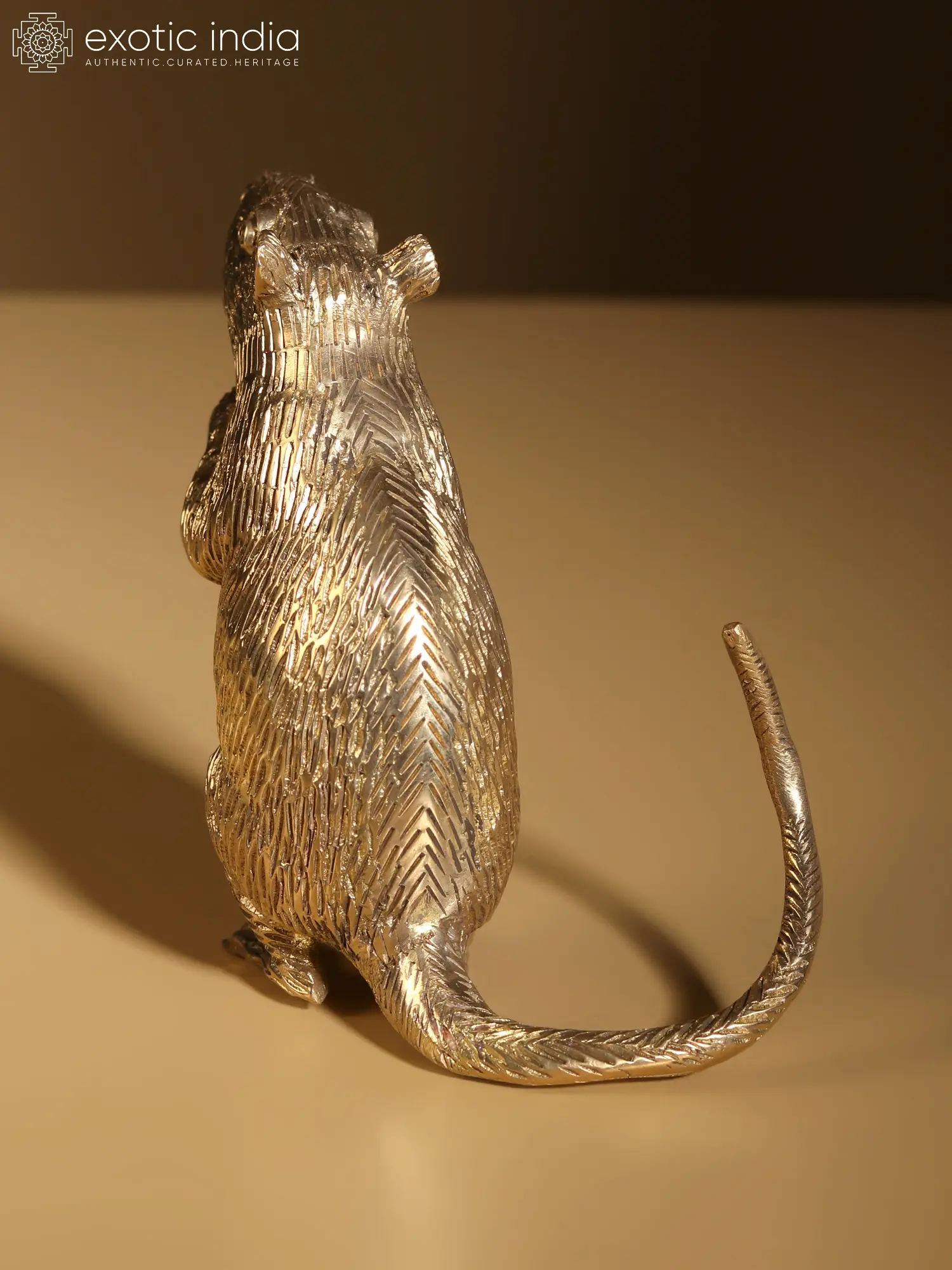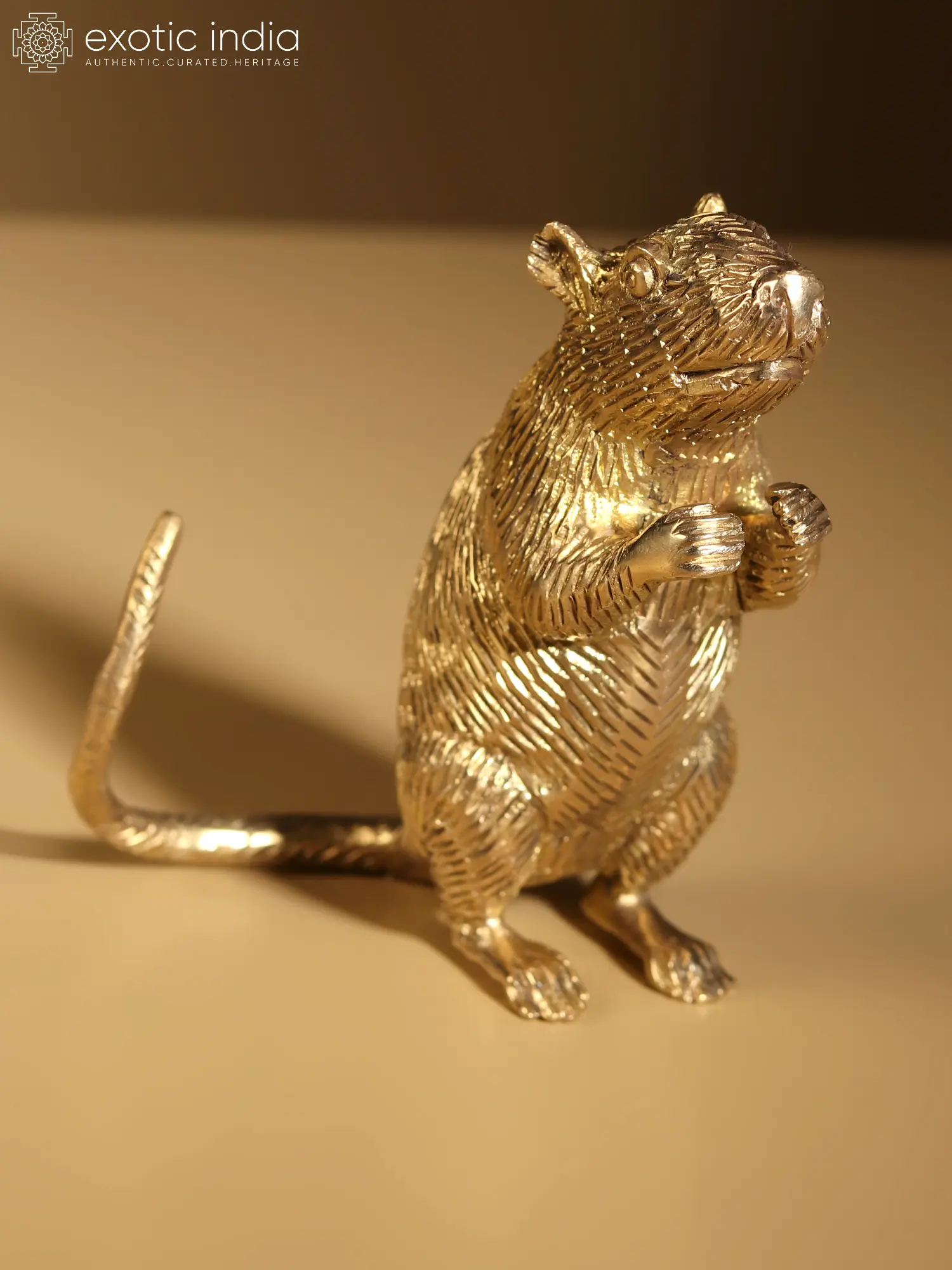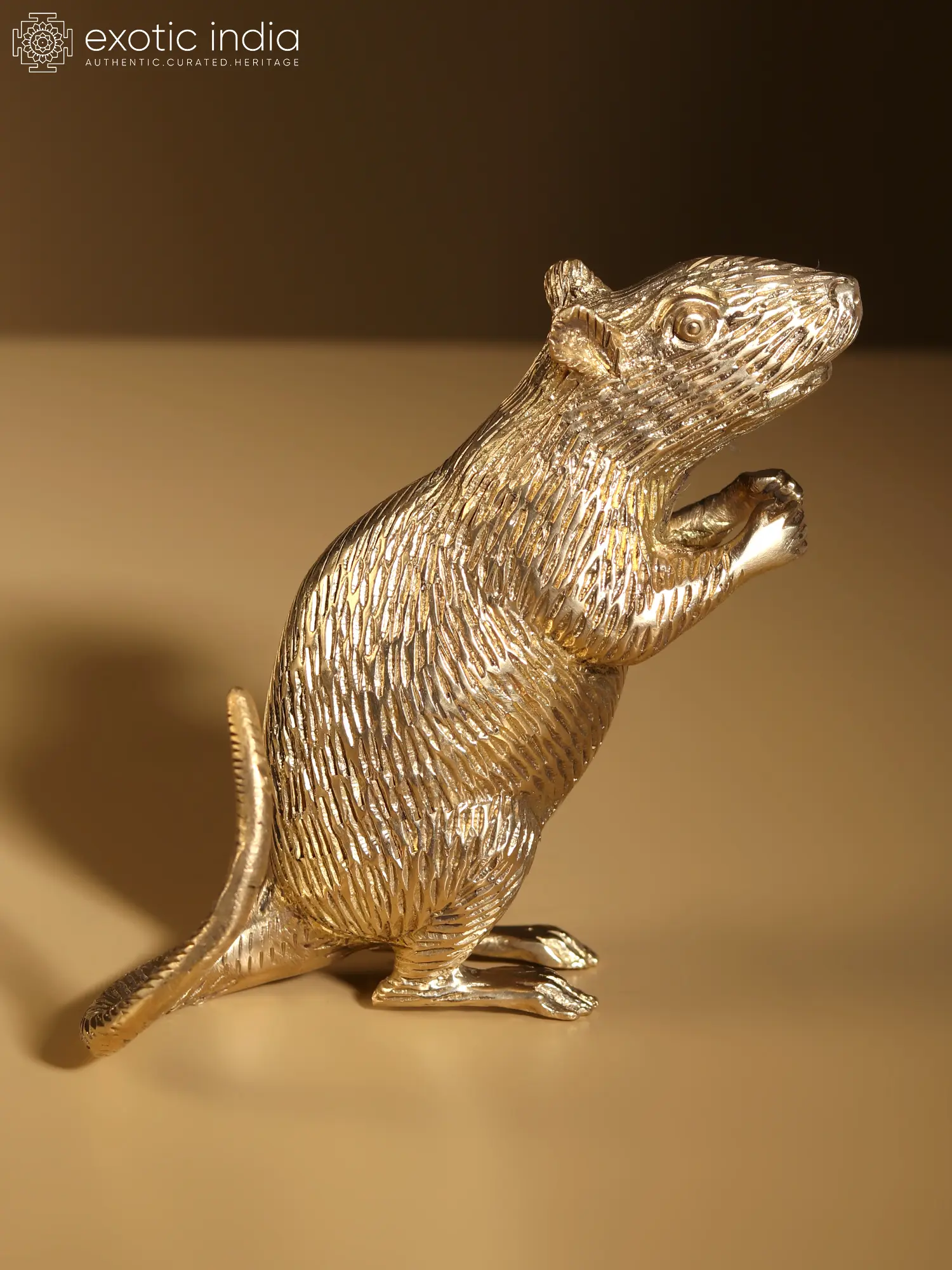 In this brass artwork, “Mushaka”, the beloved vehicle/mount of “Lord Ganesha”, embodies unwavering devotion and wisdom. With a demeanour that echoes ancient sagas, “Mushaka” becomes the silent storyteller of cosmic tales. “Mushaka” symbolises humility, carrying the weight of Ganesha’s eminence with grace.