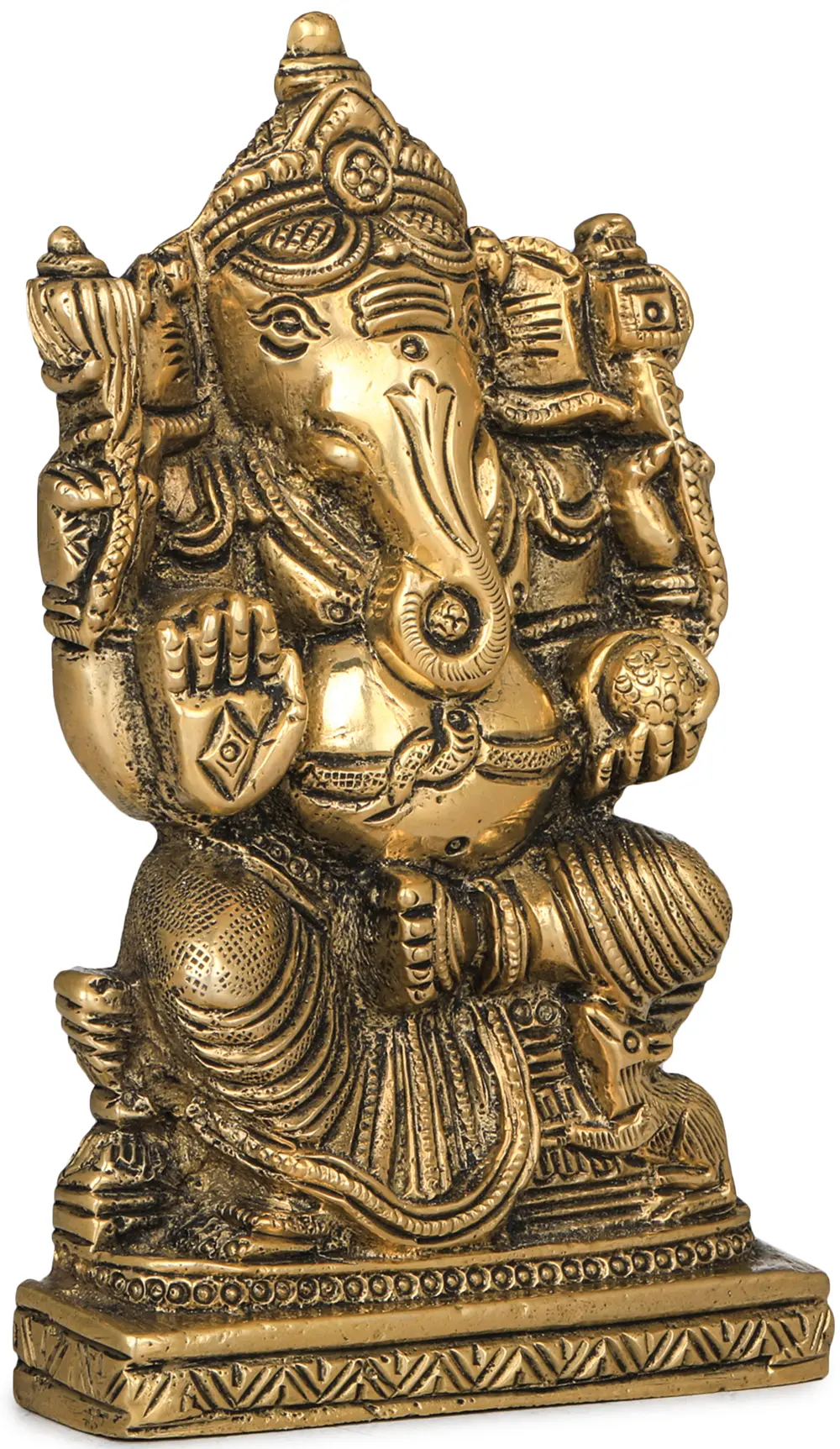 Ganesha, also known as “Vighnaharta” or “Ganpati”, is revered as the remover of obstacles and the harbinger of success. With his right hand raised in the “Ashirwad Mudra”, Ganesha bestows blessings upon devotees. His large trunk signifies adaptability and intellect, while his elephant head represents “Sagacity”. Adorned with a serpent coiled around his belly, symbolizing control over primal desires, Ganesha exudes serenity and his supreme authority. As the patron of intellect and beginnings, Lord Ganesha inspires you to overcome challenges and pursue knowledge with his benevolent guidance. Meticulously crafted in brass, this spectacular creation encapsulates devotion, inviting contemplation and invoking his benevolent energy.