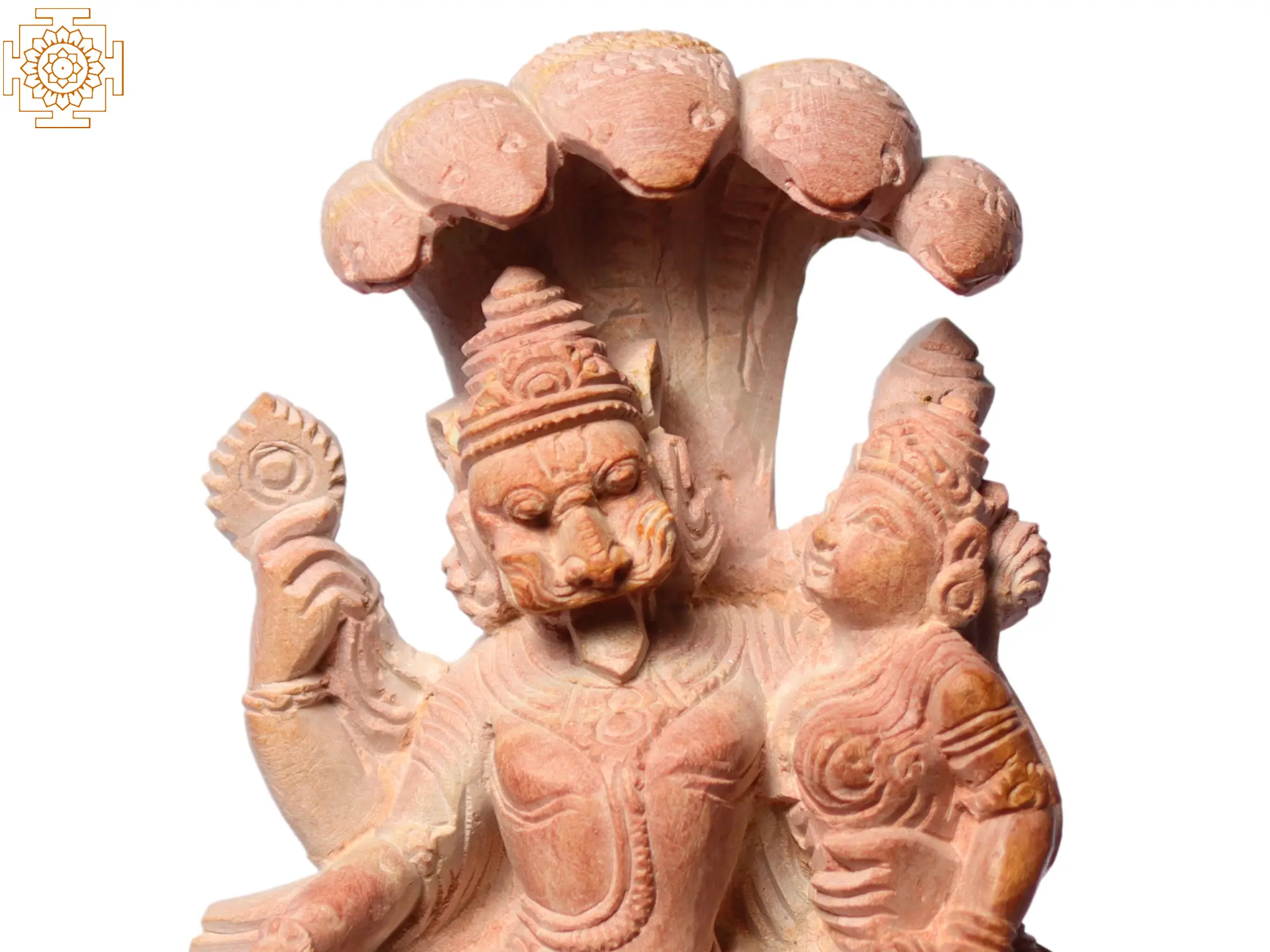 Cast in premium pink stone - this sculpture of Lord Narasimha embracing Goddess Lakshmi is a divine and spiritually significant depiction that symbolises the harmonious union of divine energies and the embodiment of love and protection within Hindu mythology - capturing the essence of Lord Narasimha, an incarnation of Lord Vishnu, expressing his divine love and devotion to Goddess Lakshmi, the consort of Lord Vishnu and the Goddess of Wealth and Prosperity.