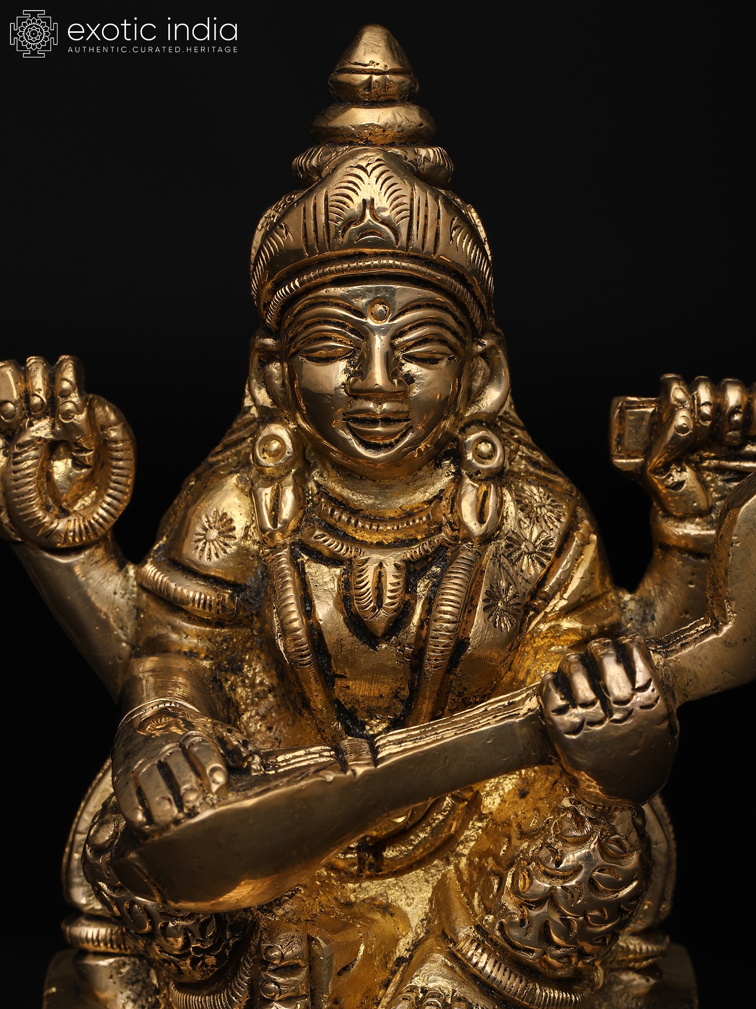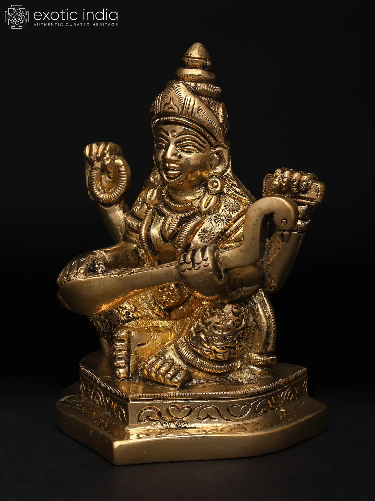 2" Small Superfine Devi Saraswati Playing Veena | Silver Plated Brass Statue
