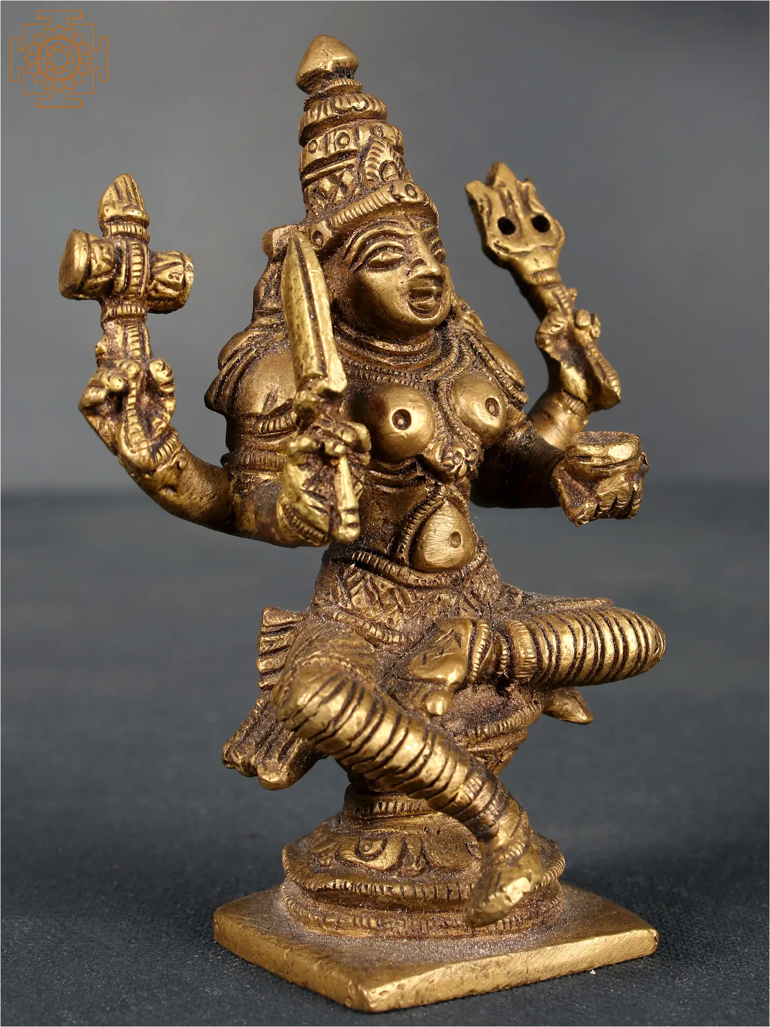 This brass statue portrays Mariamman, a South Indian protective deity. Often depicted with fierce features and adorned with vibrant colours (represented here by the natural patina of the brass), Mariamman embodies Shakti's fierce aspect, warding off illness and negativity. She is associated with the concept of grama devata, a guardian spirit of the village, ensuring the well-being of the community.