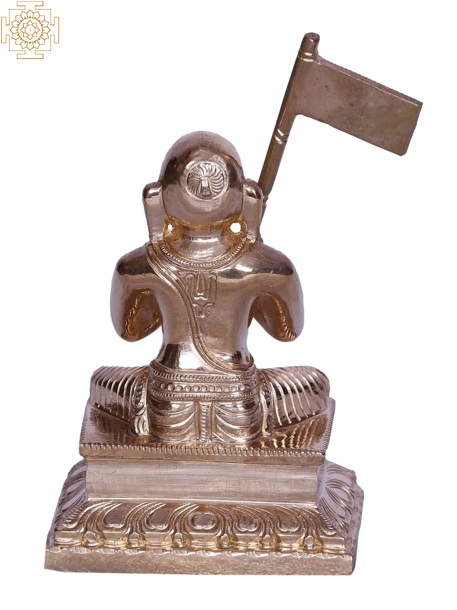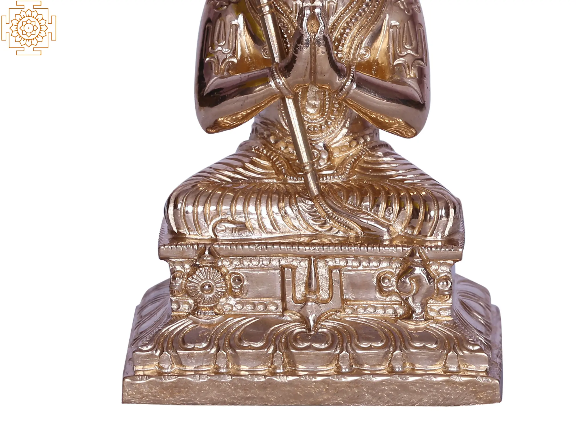 In Panchaloha bronze, this is Ramajanucharya - amused in remembrance of Narayana. His baldness represents the renunciation of material pleasures as he joins his hand together for his Swami - Vainkatha. A Pataka (flag) rests on his shoulder, demonstrating the icons of Sudarshan Chakra, Urdhva Pundra, and Panchajanya - which are also chiseled on the dais, he sits on. Acutely detailed, this idol highlights the values of egalitarianism as the foremost Samskara.