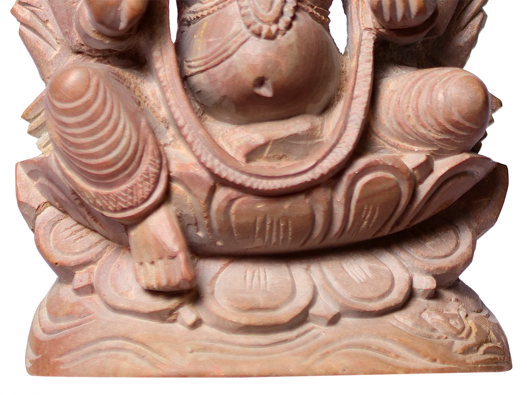 The deity is depicted in a seated posture, gracefully perched upon a beautifully carved lotus flower. The lotus, a potent symbol in Hinduism, represents purity, enlightenment, and spiritual growth, rising untainted from muddy waters. This imagery signifies Ganesha's divine nature, detached from worldly imperfections, yet firmly rooted in the earth and its blessings. The intricate carving of the lotus petals suggests the unfolding of divine wisdom and the blossoming of new opportunities. The pink hue of the stone adds an ethereal quality, evoking a sense of serenity and divine grace. ––––––––––