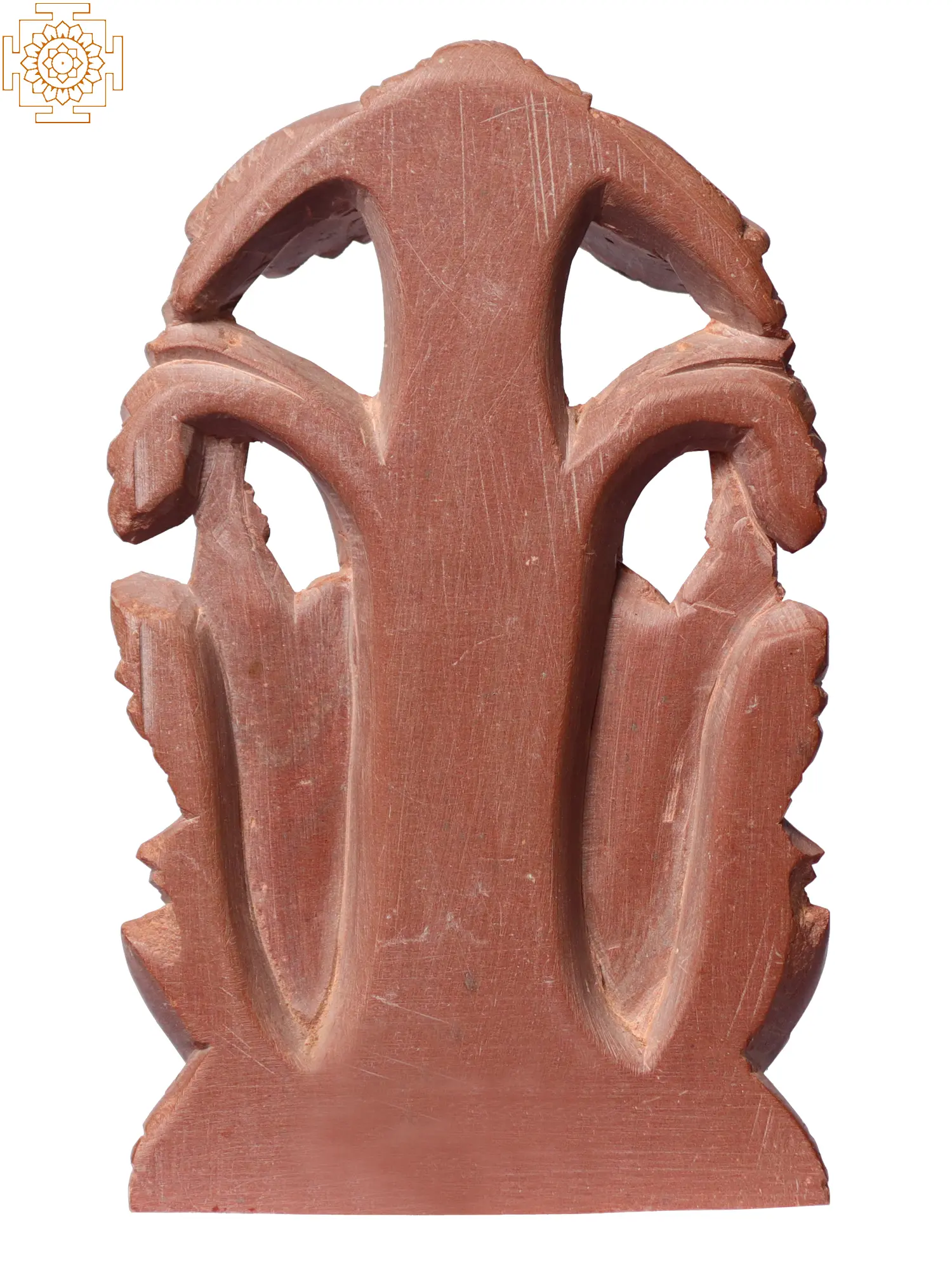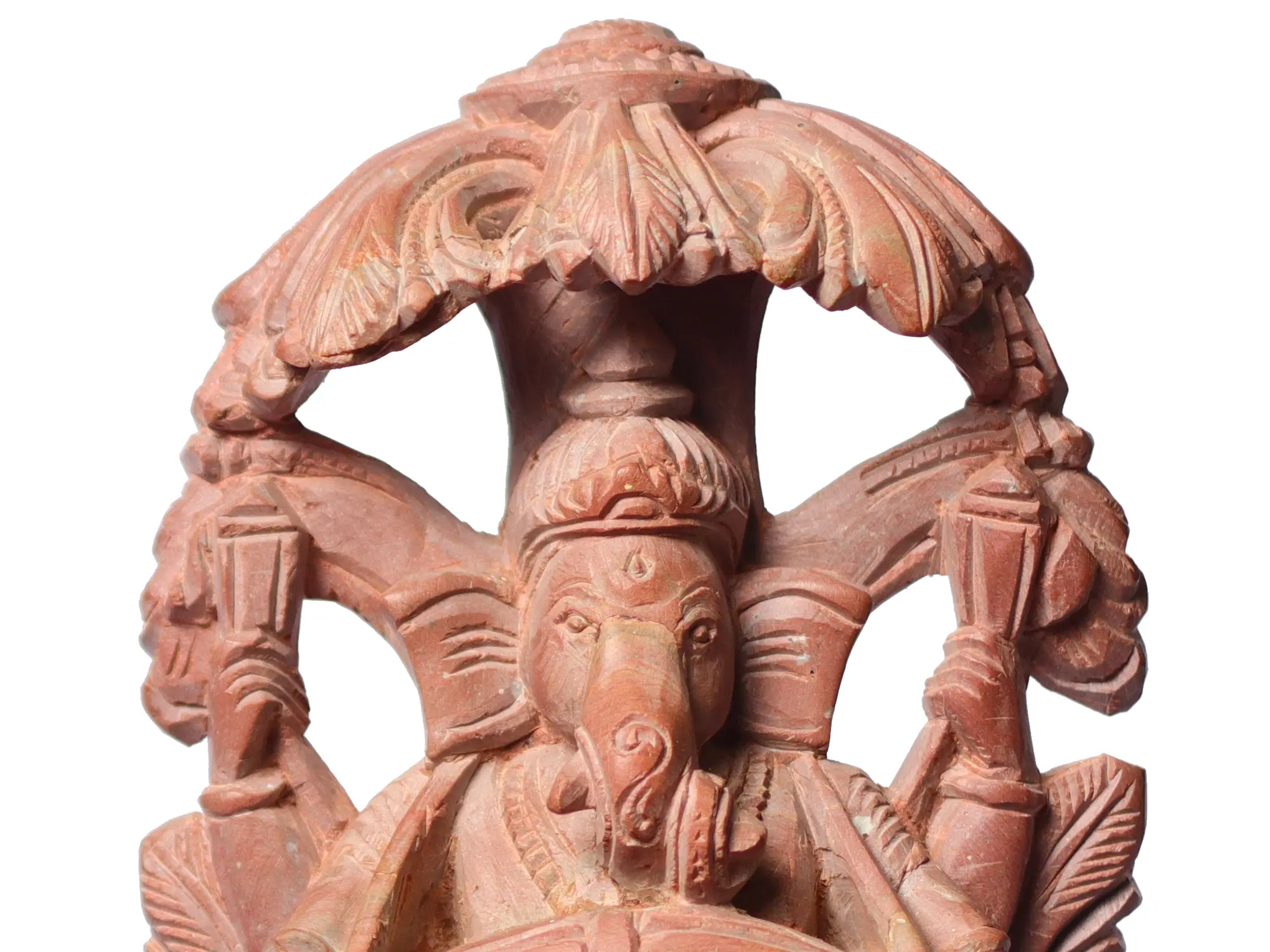 In this pink stone sculpture, Lord Ganesha's Chaturbhuja (four arms) symbolizes his omnipresence and ability to bestow blessings upon his devotees from all directions, as he plays the Dholak in forming the tunes of auspiciousness. This gorgeous creation is further enhanced by the presence of a captivating Kalpavriksha canopy, an ancient mythical wish-fulfilling tree, that symbolizes abundance and fulfillment. The delicate petals of the Padma, the sacred lotus, blossom beneath Lord Ganesha, signifying purity and enlightenment as he sits over it in a Lalitasana. The soft, pink hue of the stone used for this sculpture adds an enchanting touch, awakens your inner potential, guides you through the symphony of life, and serves as a profound symbol of beauty, wisdom, and transcendence.
