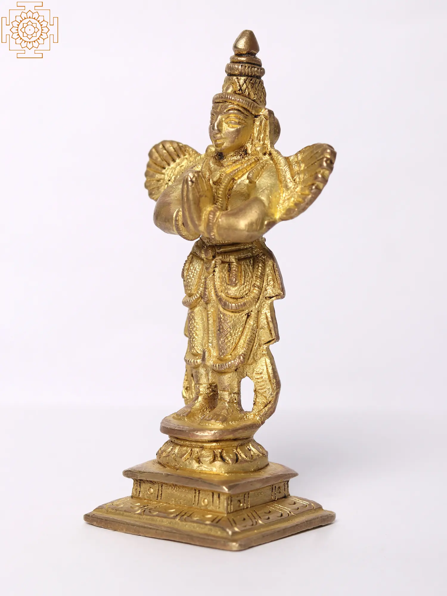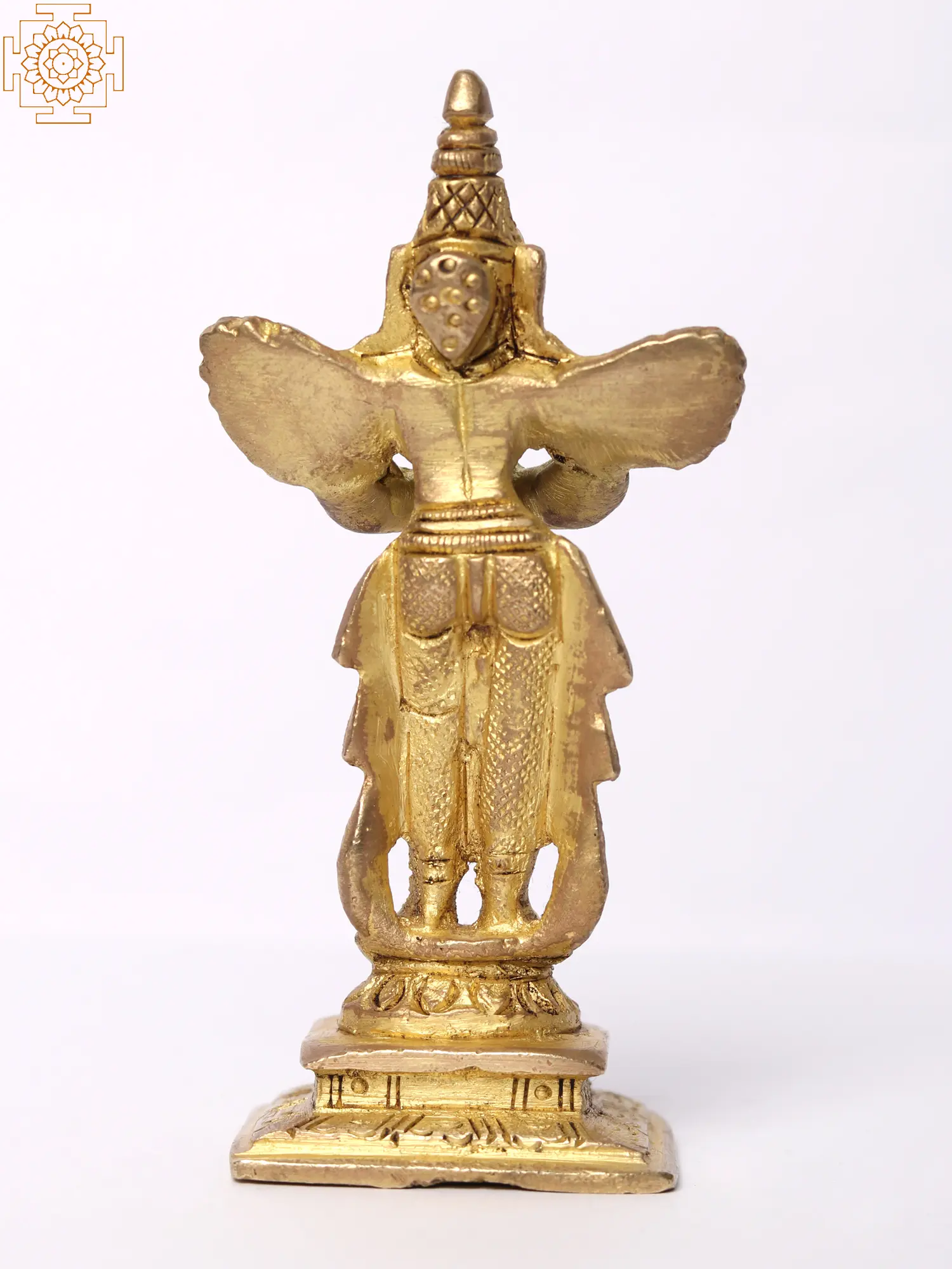 Garuda, the celestial mount of Lord Vishnu, represents the pinnacle of devotion and the embodiment of spiritual liberation. With his majestic wings and radiant form, Garuda is a symbol of freedom from the limitations of the material world and the transcendence of worldly attachments. His presence inspires devotees to soar to new heights of spiritual realization, transcending the confines of the mundane and embracing the boundless expanse of the divine. His hands are joined in Anjali Mudra - symbolizing the recognition of the divine presence in all aspects of existence.
