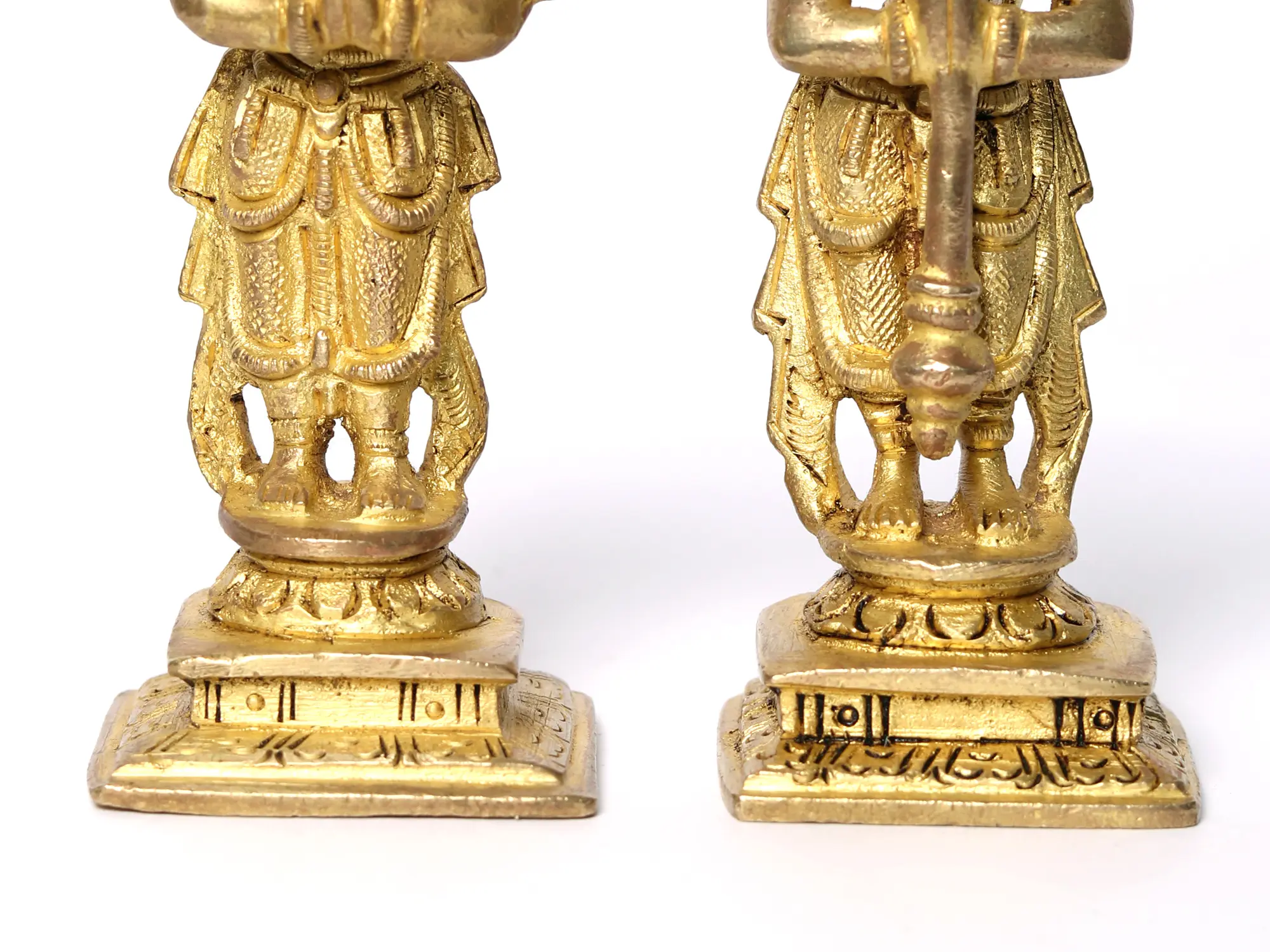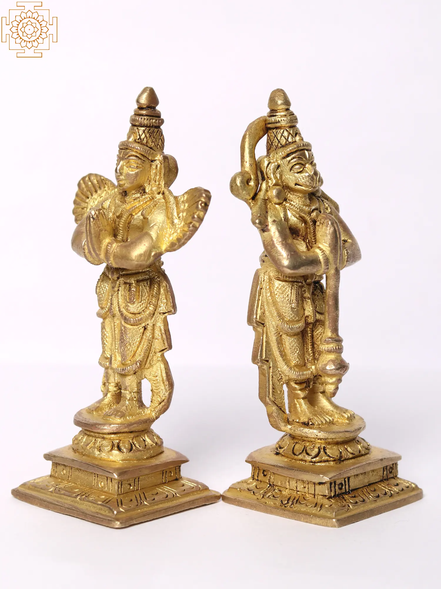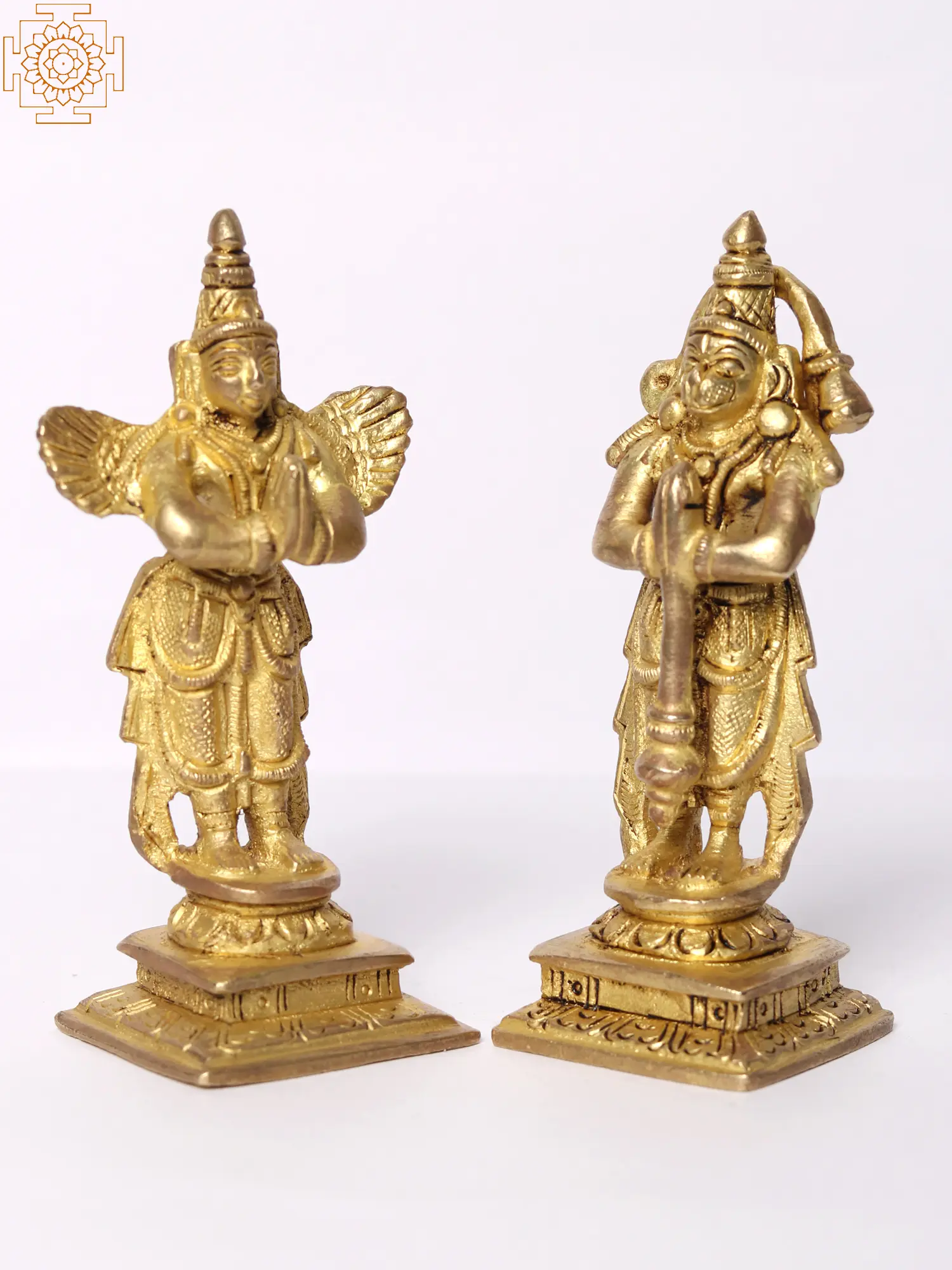 An emblem of Vishnu Bhakti, this pair of Garuda and Hanumana have been cast in premium quality brass with utmost devotion. As a revered figure in Hindu mythology, Hanumana’s boundless love and unwavering commitment to Lord Rama makes him a symbol of pure devotion, selflessness, and unwavering faith; his presence instills in you the strength to overcome challenges, the courage to face adversity, and the determination to persevere through life's trials. While Garuda, the Bird King in Hindu Mythology prepares one to embark on a transformative journey of devotion, liberation, and spiritual awakening as Lord Hari’s mount.