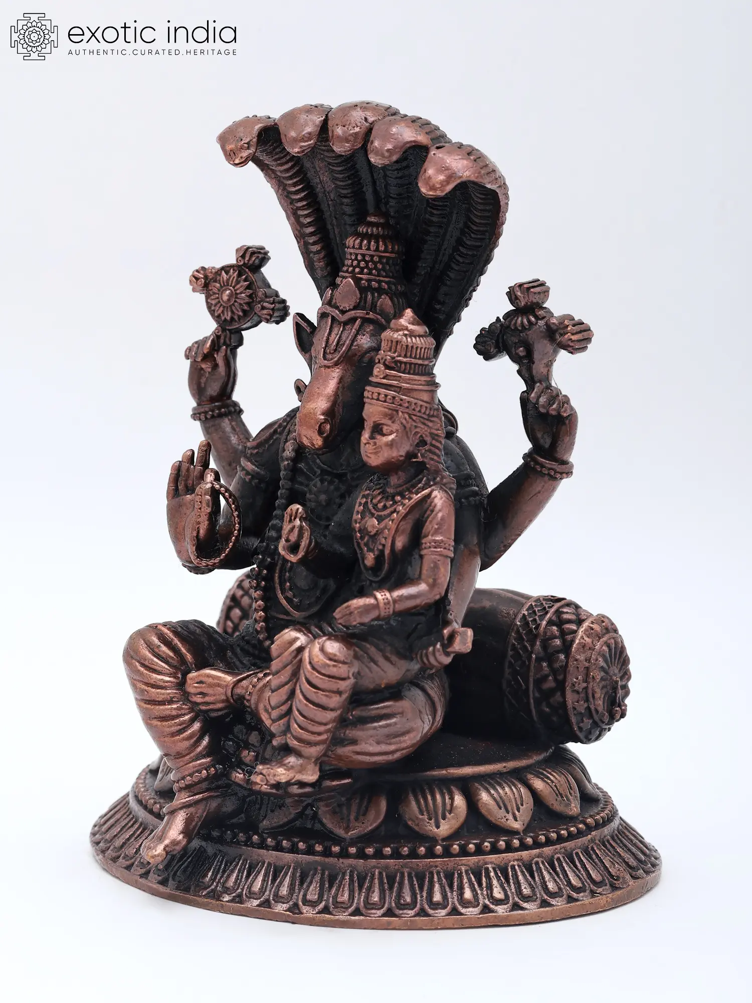 4" Small Lord Hayagreeva Seated Under The Sheshnag with Devi Lakshmi | Copper Statue