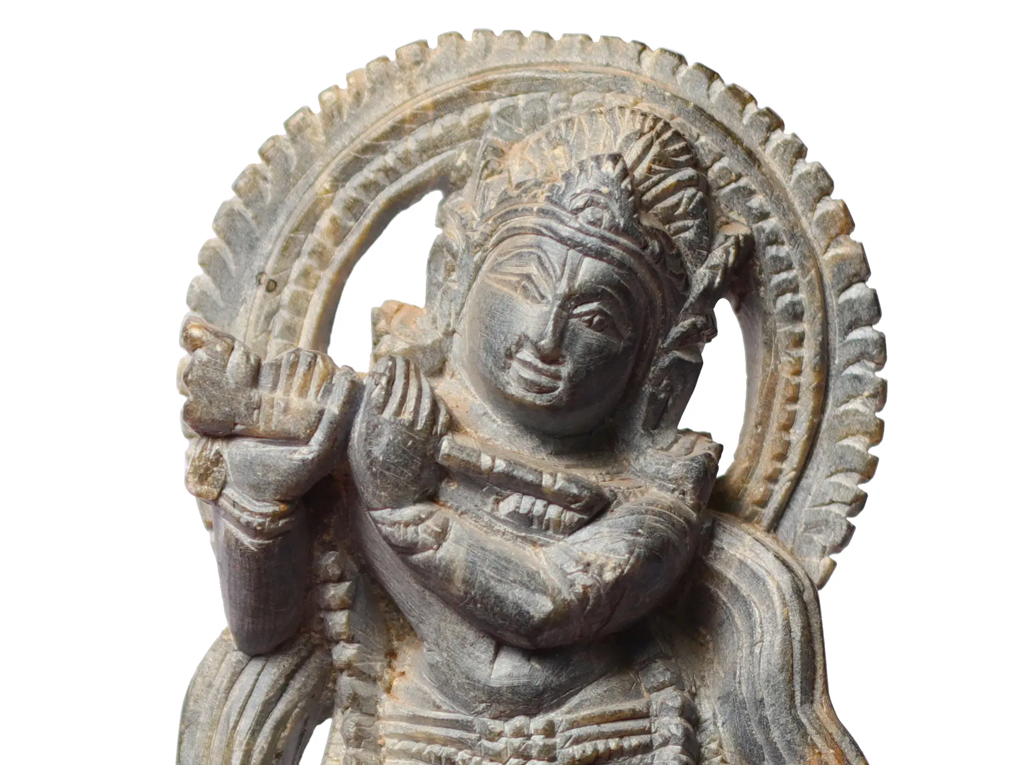 This magnificent Lord Krishna Playing Flute statue, was made from the finest green stone. As he stands on a gorgeous pedestal platform, in this mesmerising representation, the Hindu god exudes heavenly elegance and beauty. The elaborate carvings on the statue draw attention to Lord Krishna's peaceful demeanour and his graceful stance while he plays the entrancing flute. This spiritual work of art has a certain natural beauty and authenticity due to the usage of green stone. This statue is ideal for decorating a house, workplace, or meditation area. It acts as a sign of dedication and instills peace into any setting.
