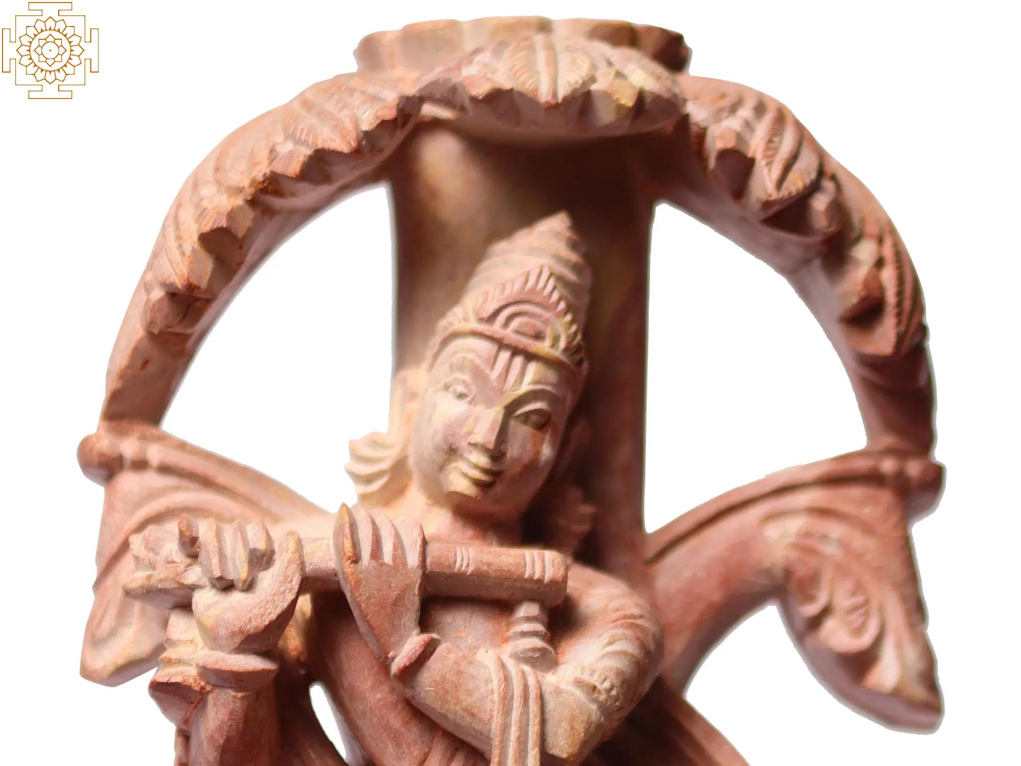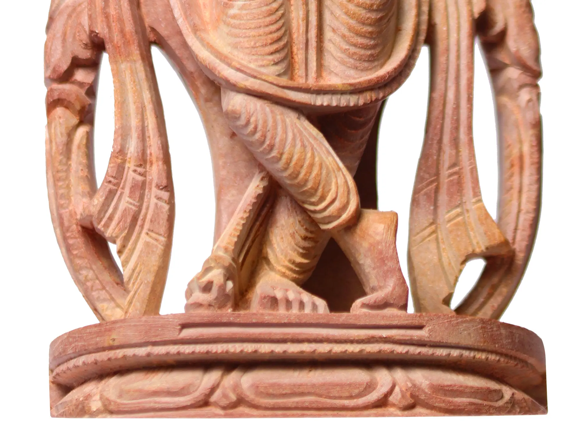 Immerse yourself in the divine aura of Lord Krishna with this exquisite pink stone statue. Standing at a petite four inches, this piece captures the enchanting presence of the beloved Hindu deity in a moment of serene musicality. The sculptor's artistry is evident in every detail, from the gentle curve of Krishna's posture to the delicate rendering of his flute. The warm, earthy tones of the pink stone lend a natural and soulful beauty to the representation, inviting contemplation and devotion.