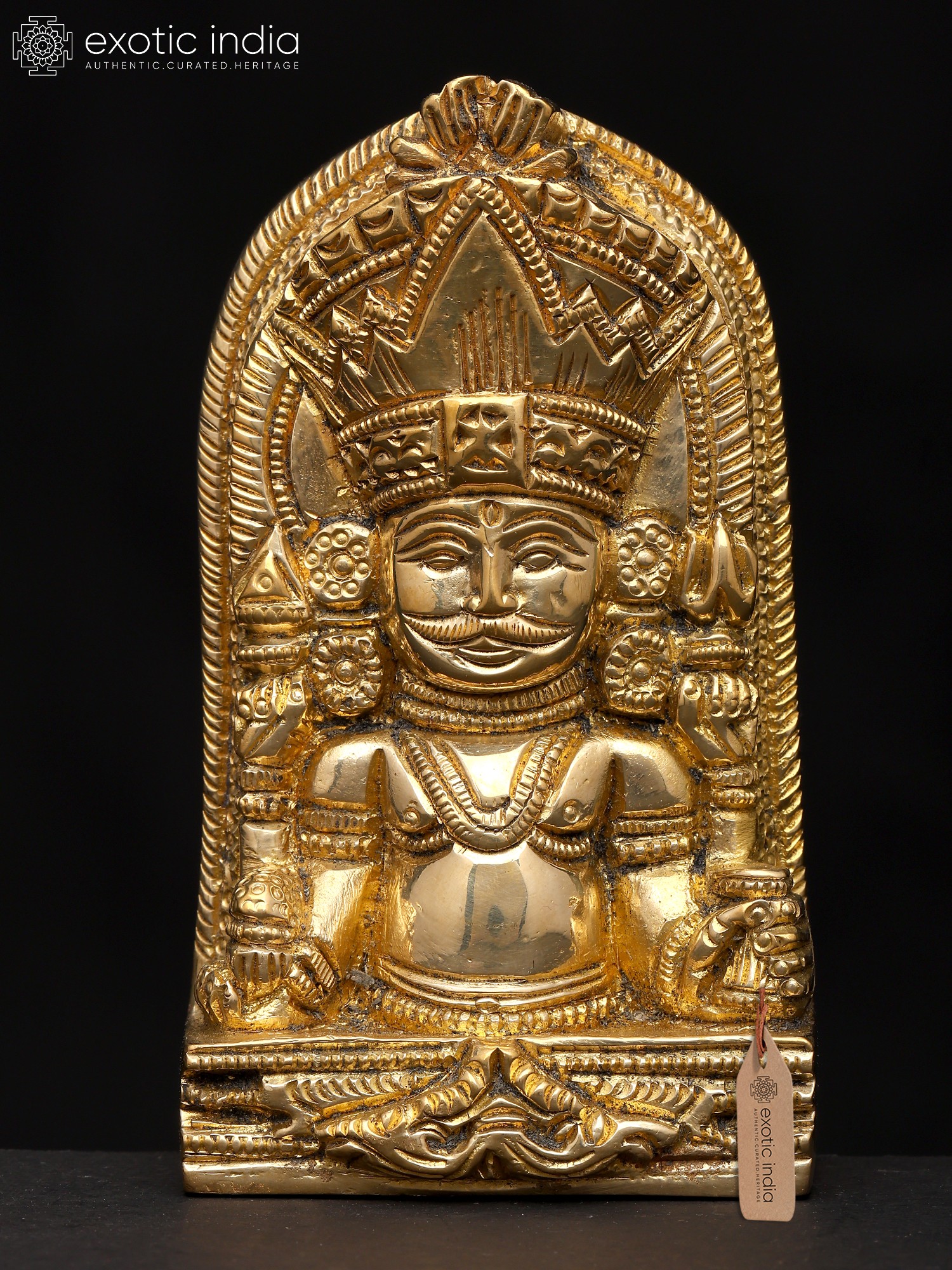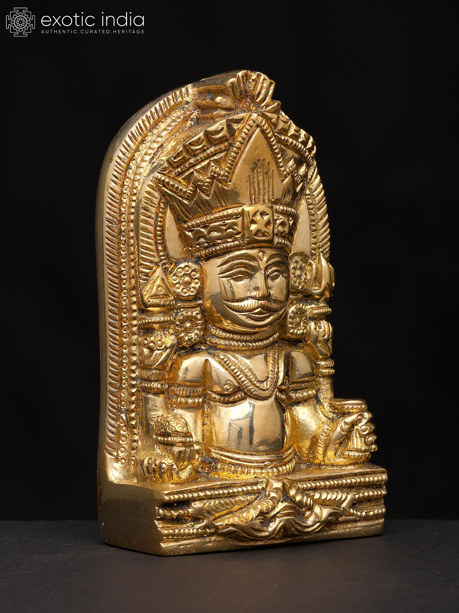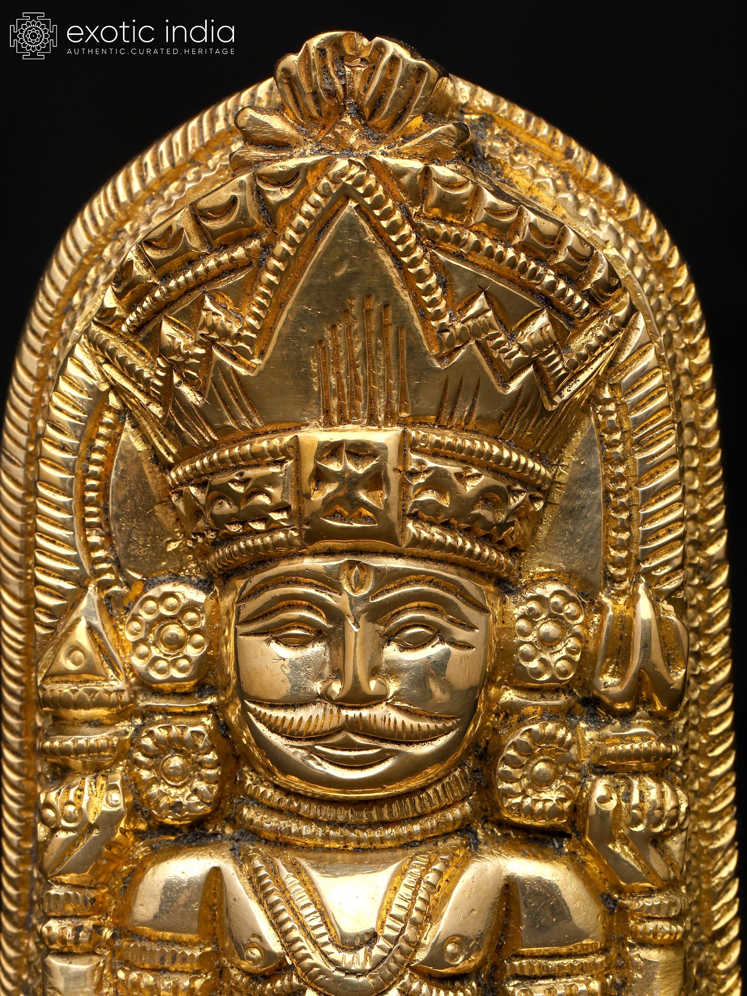 This exquisite brass statue captures the essence of Lord Nakoda, a revered figure in Jainism, in a form that resonates with devotional warmth and artistic splendor. Crafted from solid brass, a metal traditionally associated with purity and auspiciousness in Indian culture, this small-sized masterpiece is designed to bring a sense of peace and spiritual grounding to any space. The intricate detailing showcases the masterful craftsmanship that has been passed down through generations, reflecting a deep understanding of sacred iconography. The figure of Lord Nakoda is depicted with a serene countenance, emanating a tranquil aura. His commanding presence is enhanced by the elaborate headdress, adorned with patterns that speak of royalty and spiritual authority. The facial features, including the well-defined mustache and the gentle, knowing eyes, are rendered with remarkable precision, inviting contemplation and reverence. The statue is presented within an ornate archway, a common motif in Indian art that signifies a sacred portal or a divine enclosure, further elevating the divine presence.