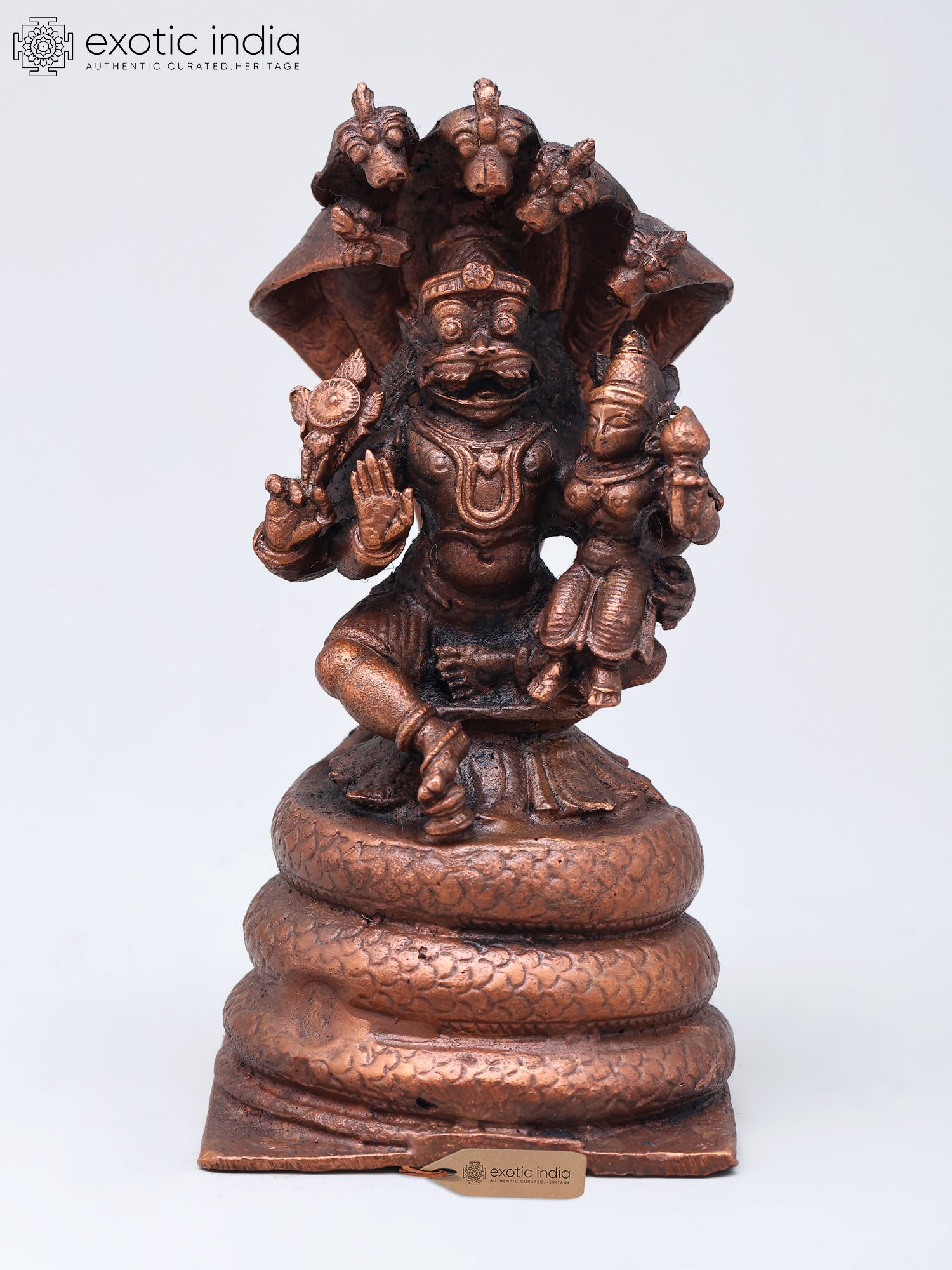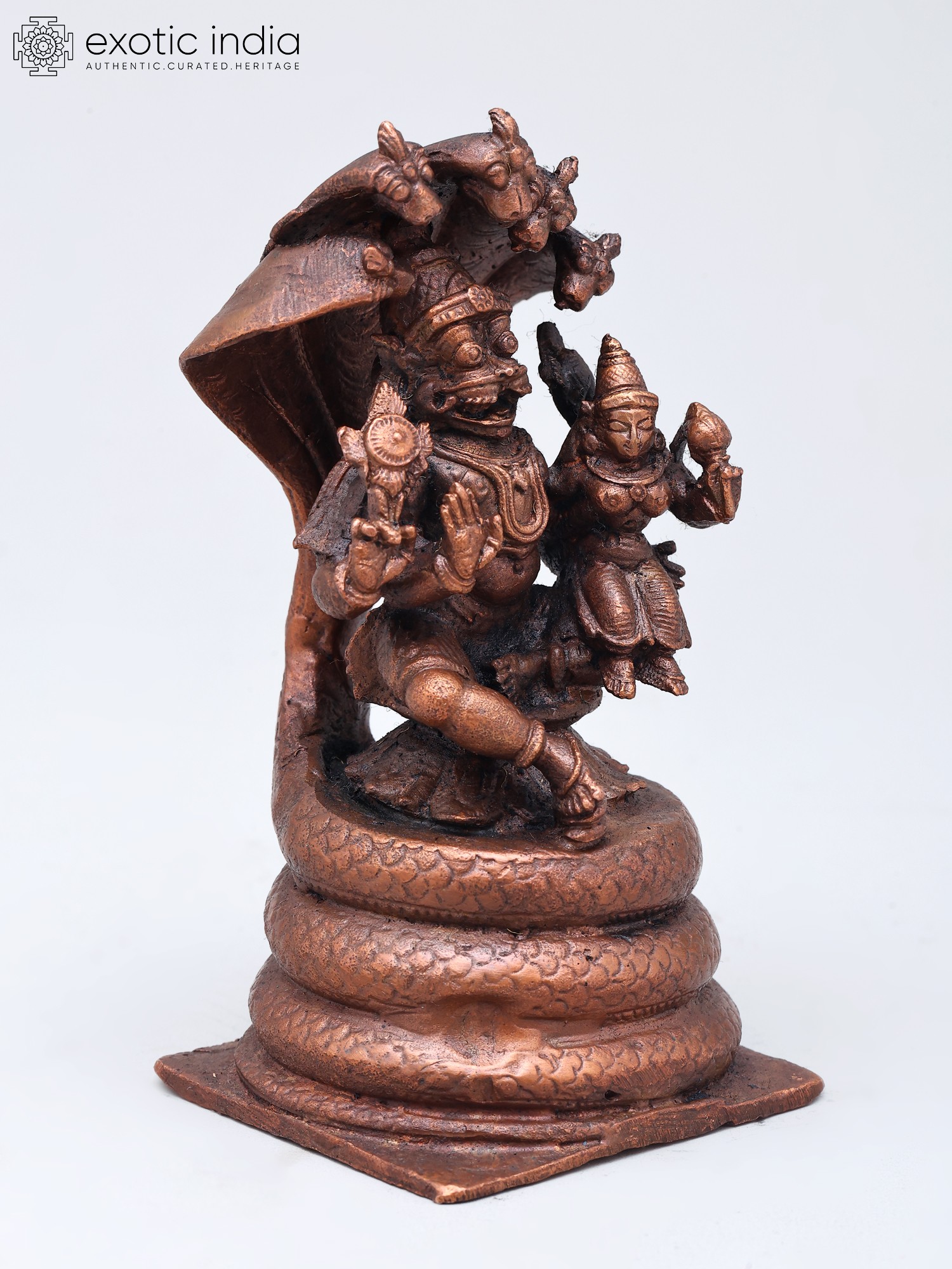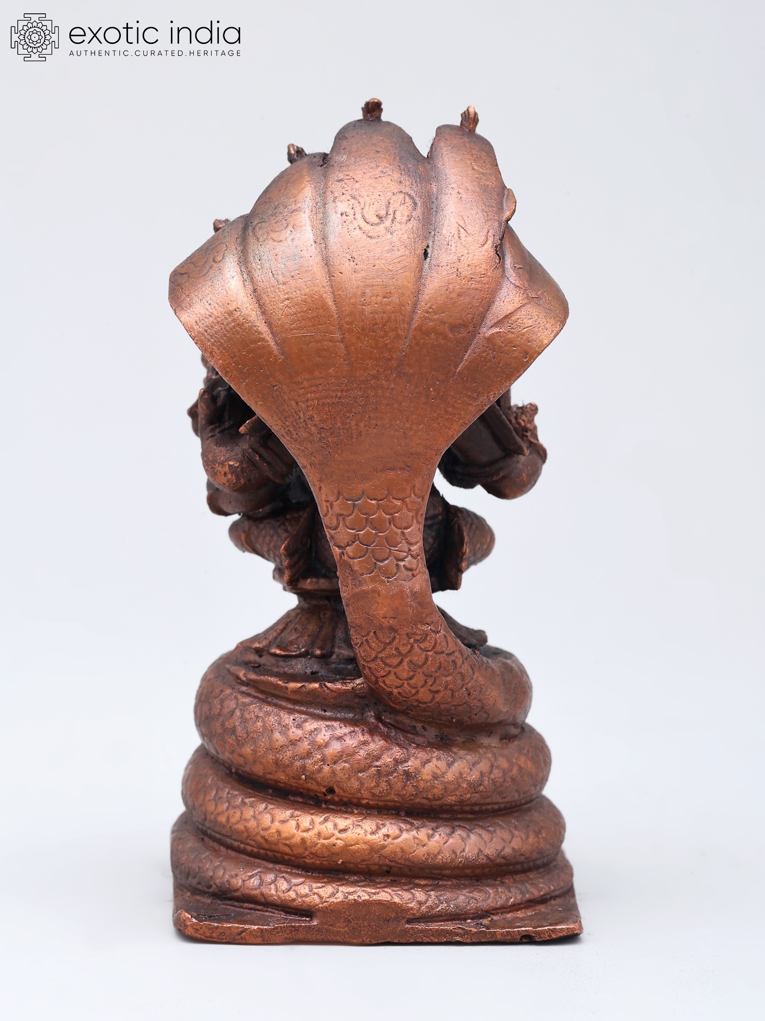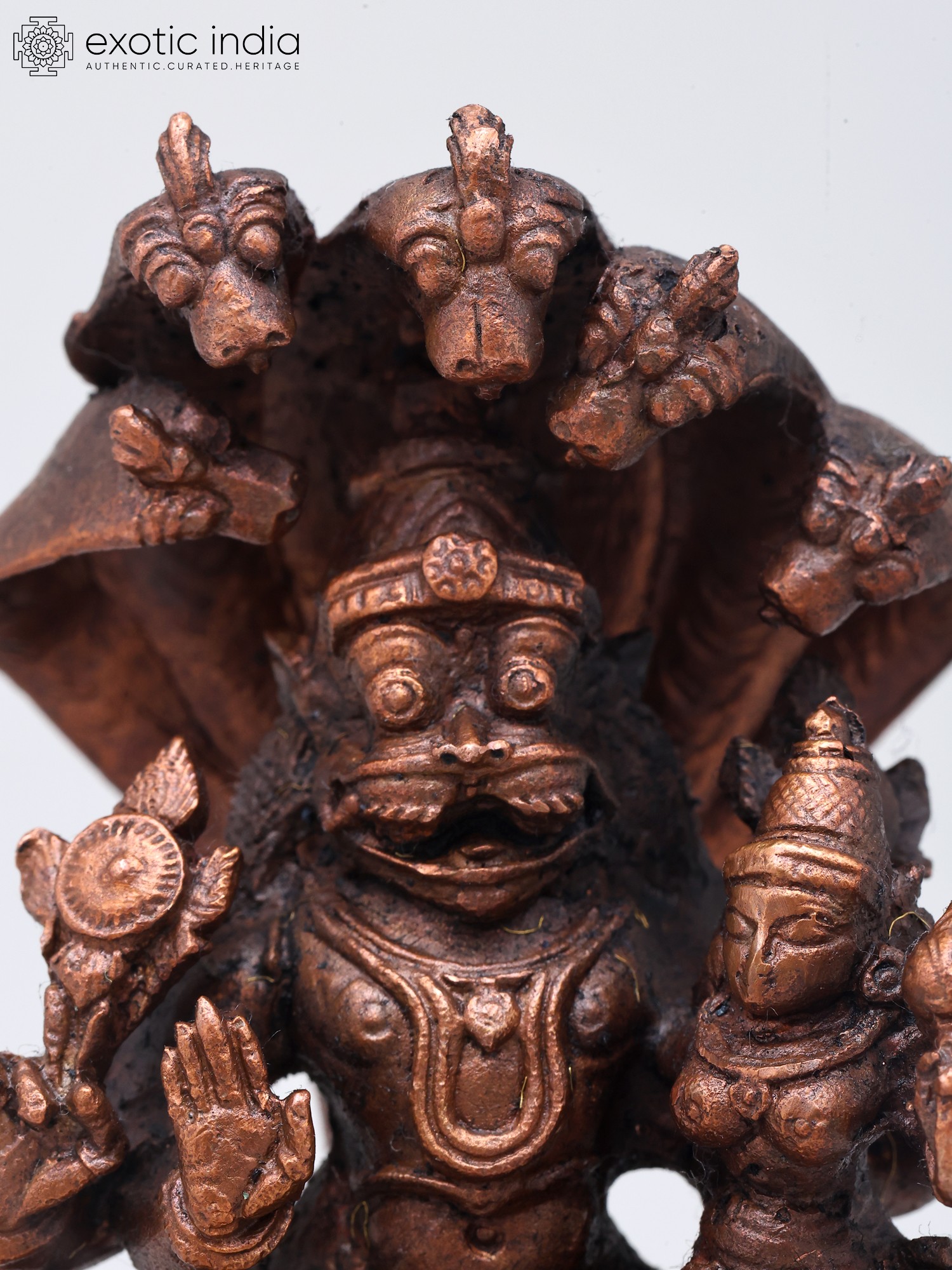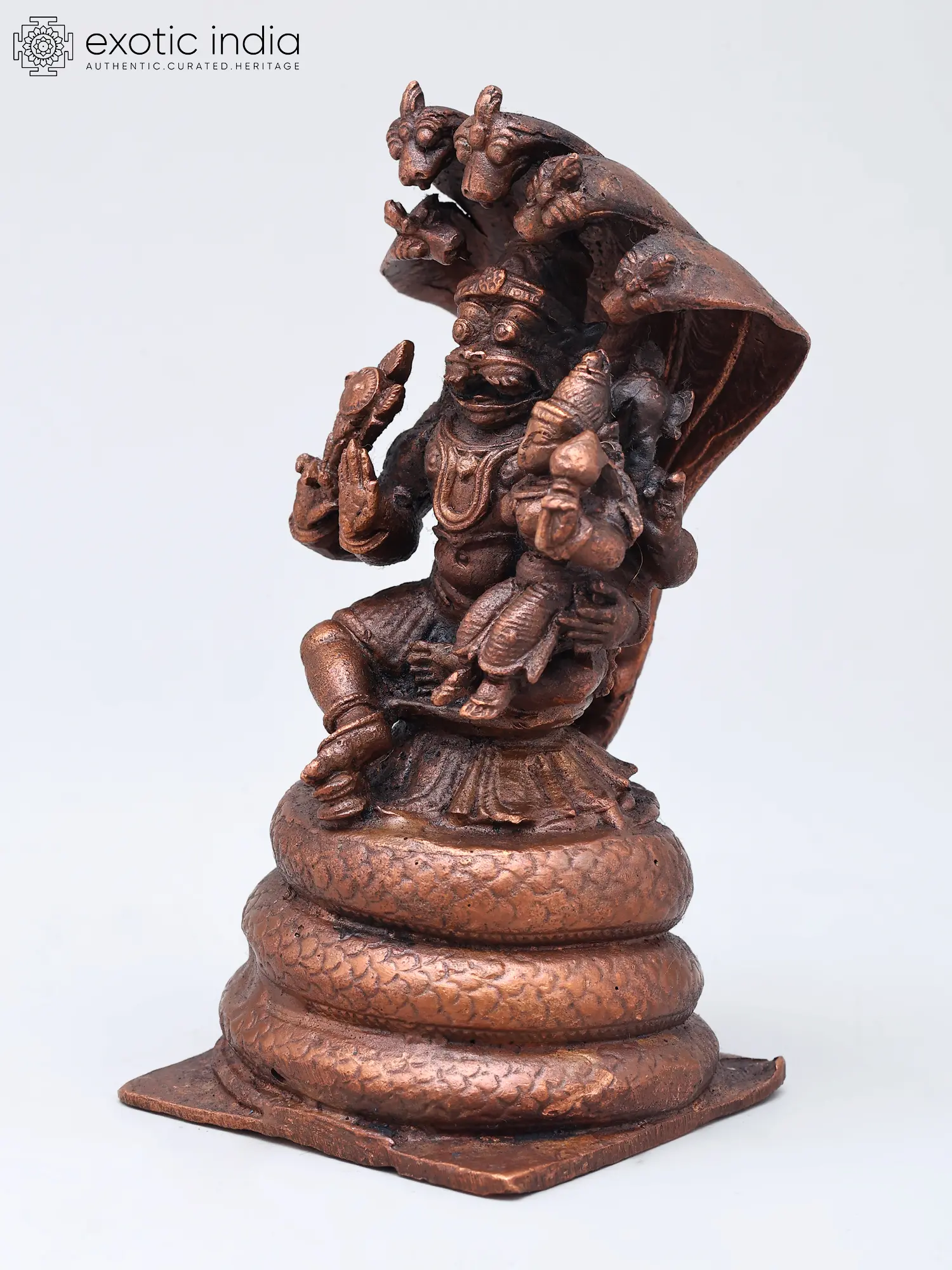 5" Small Lord Narasimha in Yoga Mudra Protected by Sheshnag | Copper Statue
