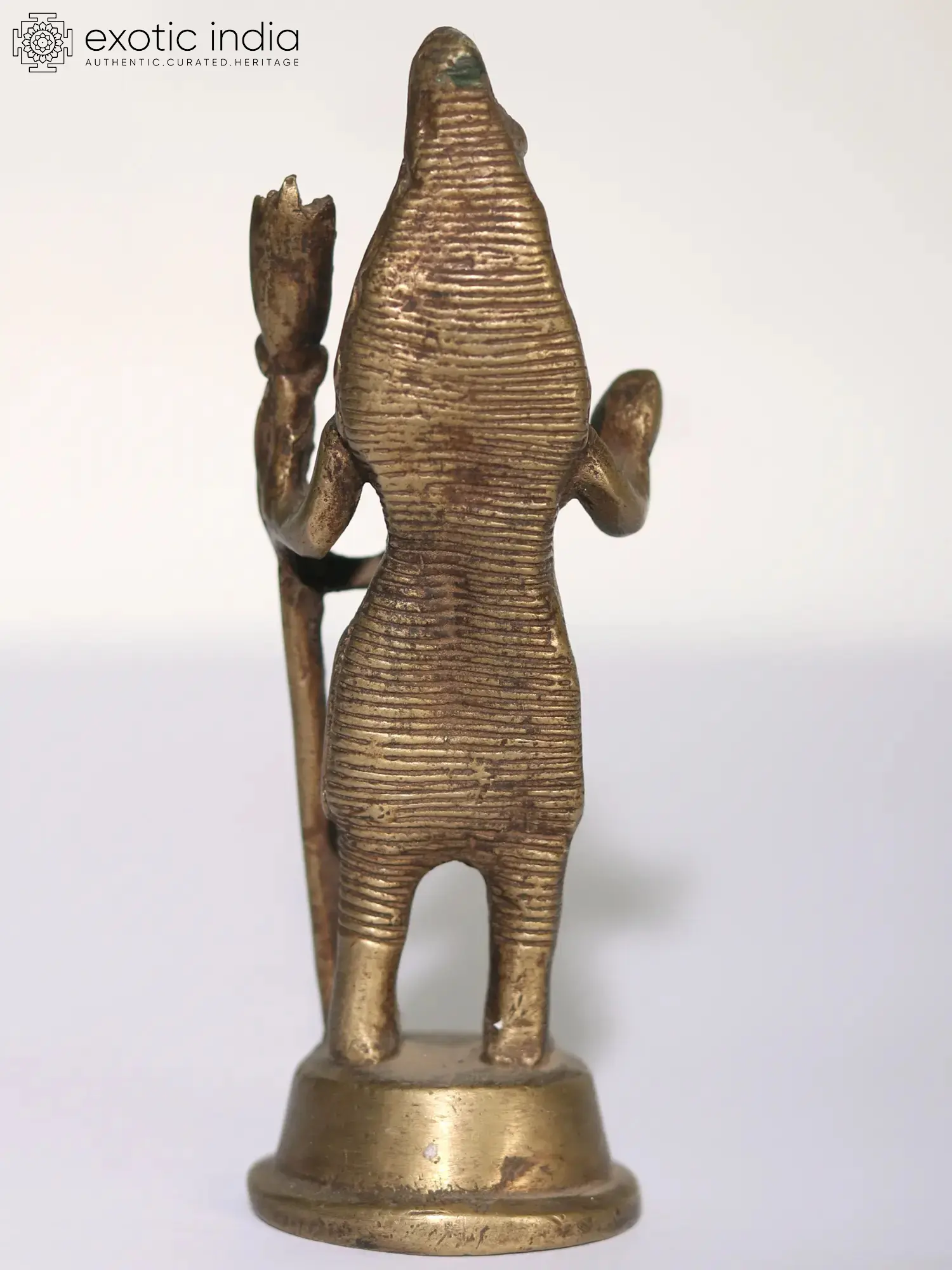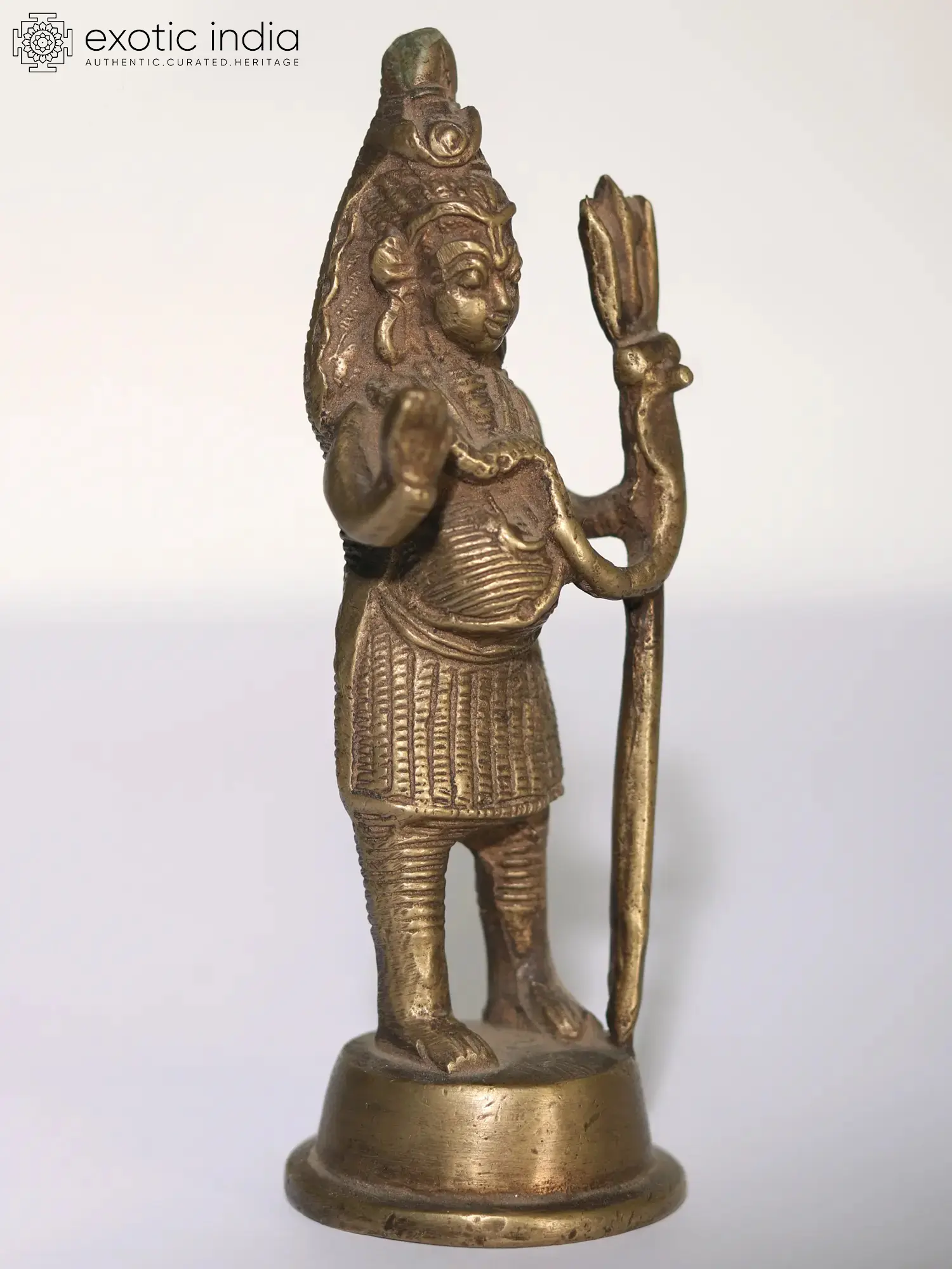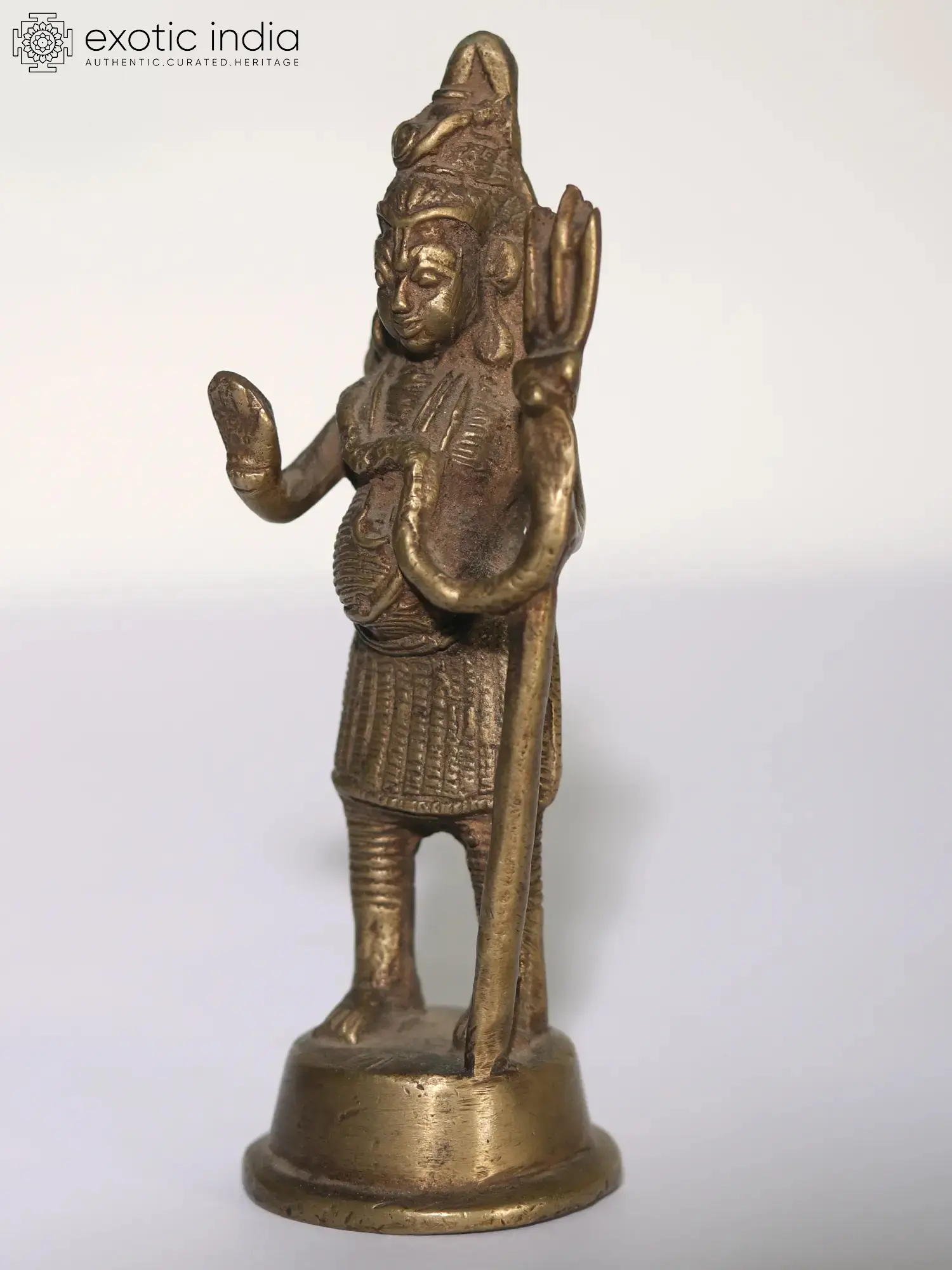 In this brass artwork, Lord Shiva, also known as Mahadev, “the Auspicious One”, stands upon a sacred podium. His divine visage, an epitome of serenity, radiates an aura that transcends mortal confines. In his left hand, the trident (Trishul), symbol of power and destruction, signifies the cosmic dance of creation and dissolution. The right hand, extending the “Abhaya Mudra”, imparts solace and protection to all who seek refuge in his mighty grace. His matted locks whisper secrets of eternal wisdom, while the Vasuki serpent, gracefully adorning his form, represents the eternal cycle of life. Worshipping this form invokes blessings of courage, serenity, and cosmic harmony.