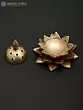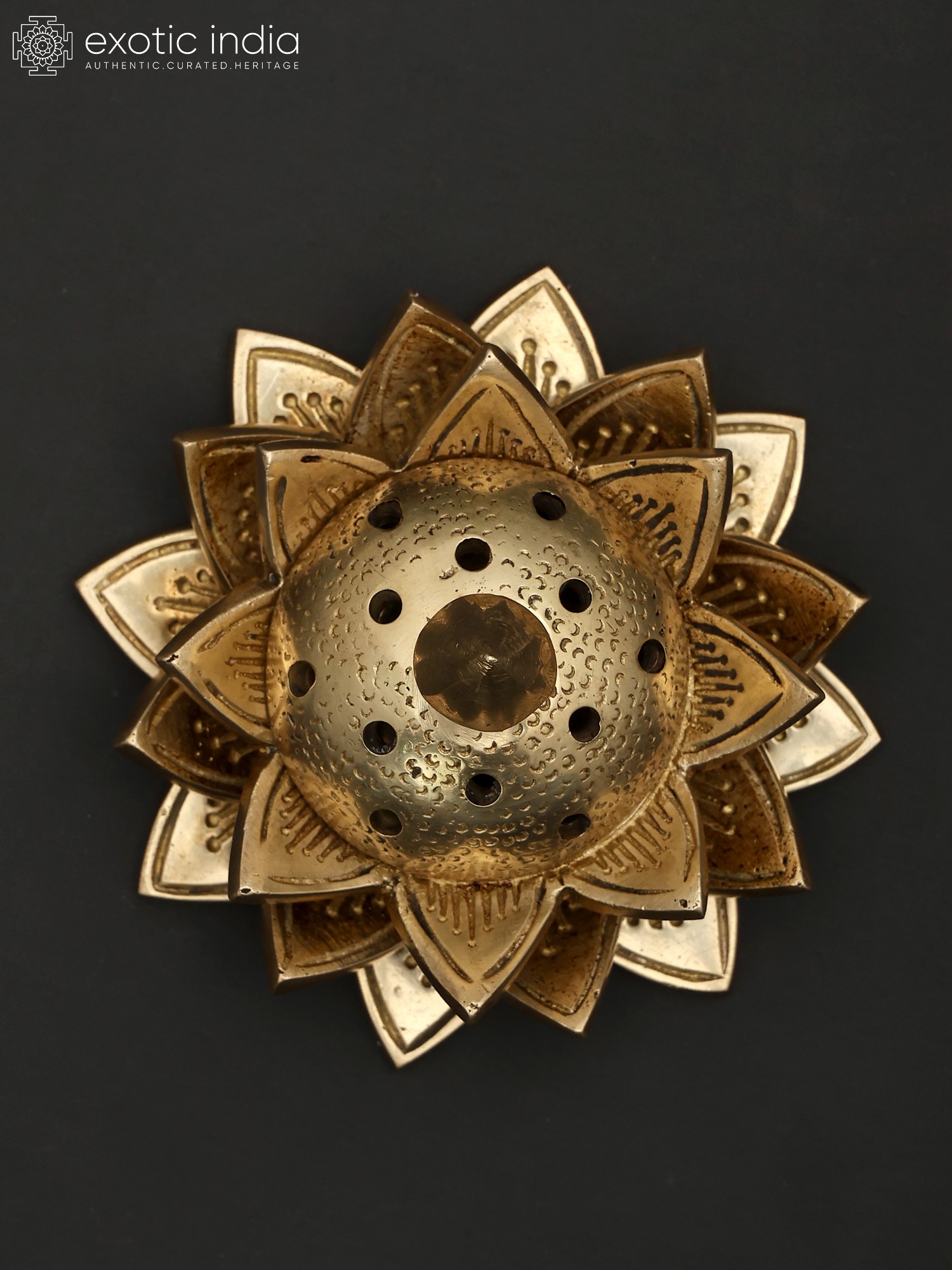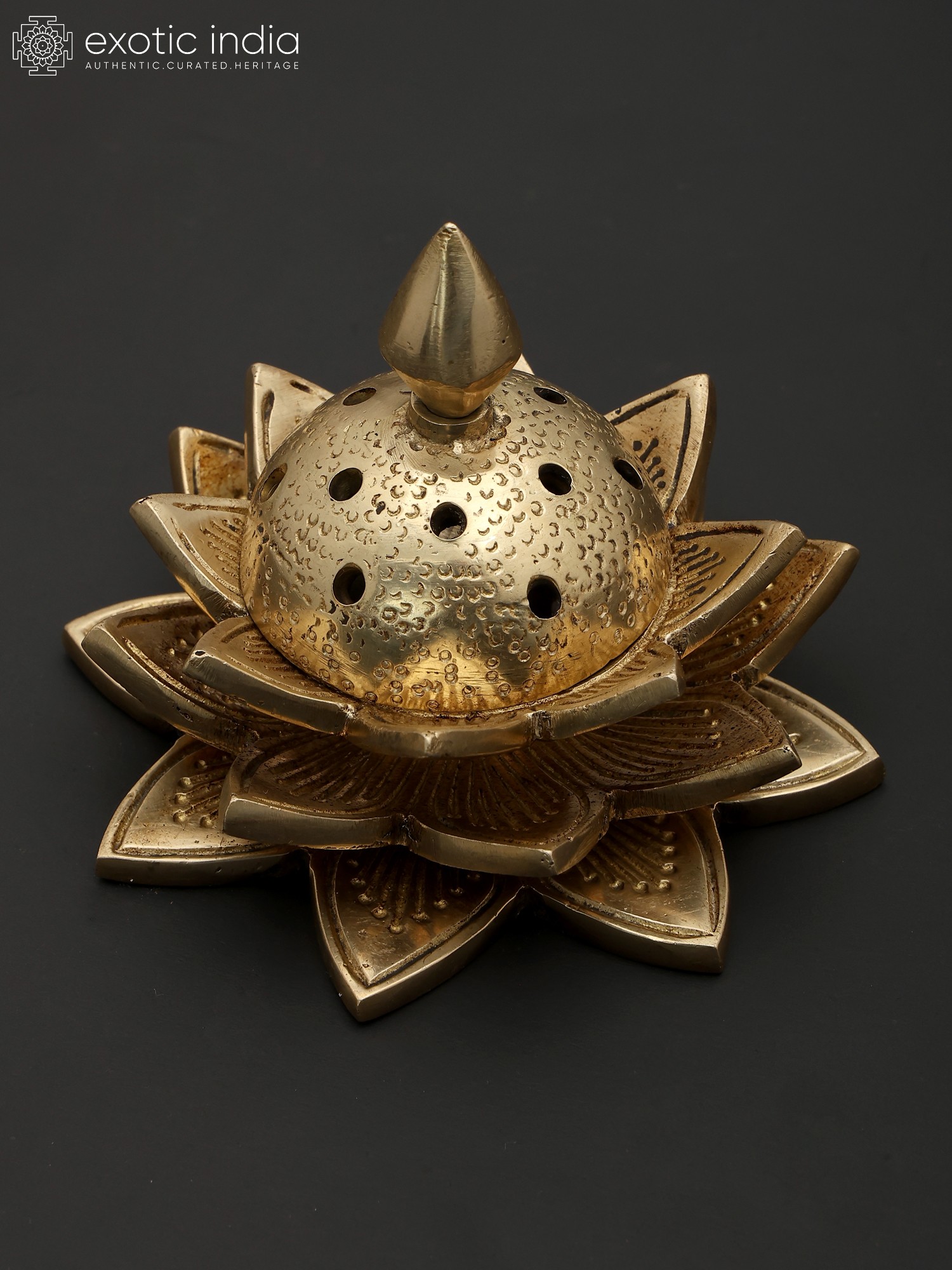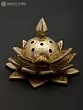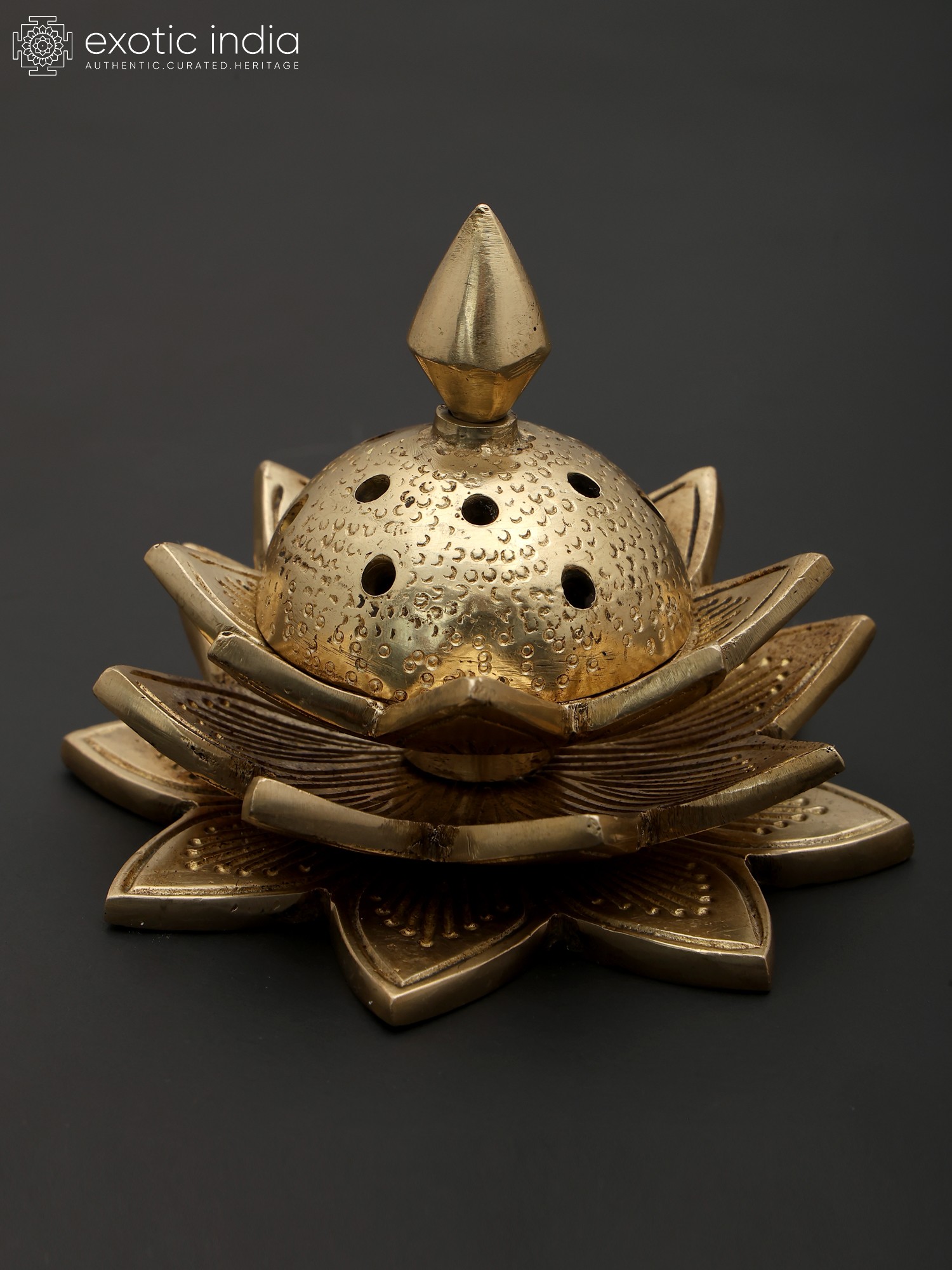Crafted from radiant brass, this incense diffuser takes the form of a stylized lotus flower, offering both functional elegance and a touch of spiritual significance to your sacred space. The meticulously detailed petals cradle a spherical dome, punctuated with openings to release the fragrant tendrils of your chosen incense. The golden hue of the brass imbues the diffuser with a sense of warmth and serenity, making it an ideal addition to any altar, meditation space, or room where you seek a moment of peace. The substantial feel of the brass speaks to the quality of craftsmanship and assures the diffuser's longevity, turning it into a piece to cherish and pass down through generations. Beyond its aesthetic appeal, the lotus form serves as a constant reminder of the potential for growth, transformation, and the beauty that can emerge from challenging circumstances. Let the gentle fragrance and the symbolic power of the lotus enhance your rituals and create an atmosphere of tranquility and reflection.