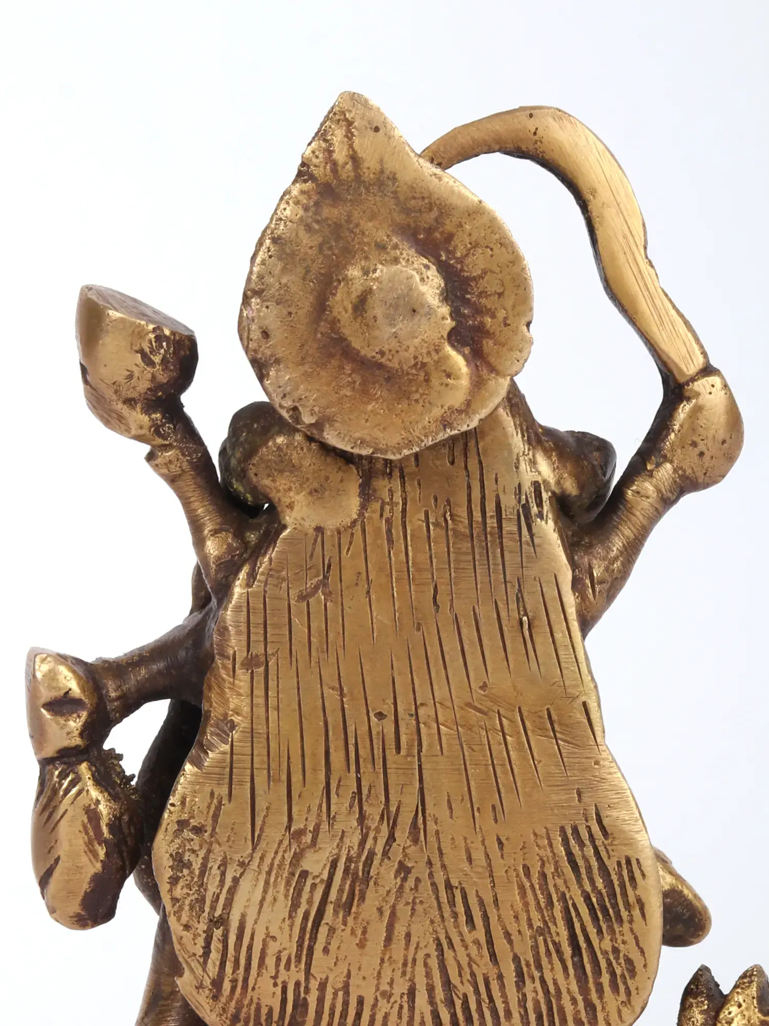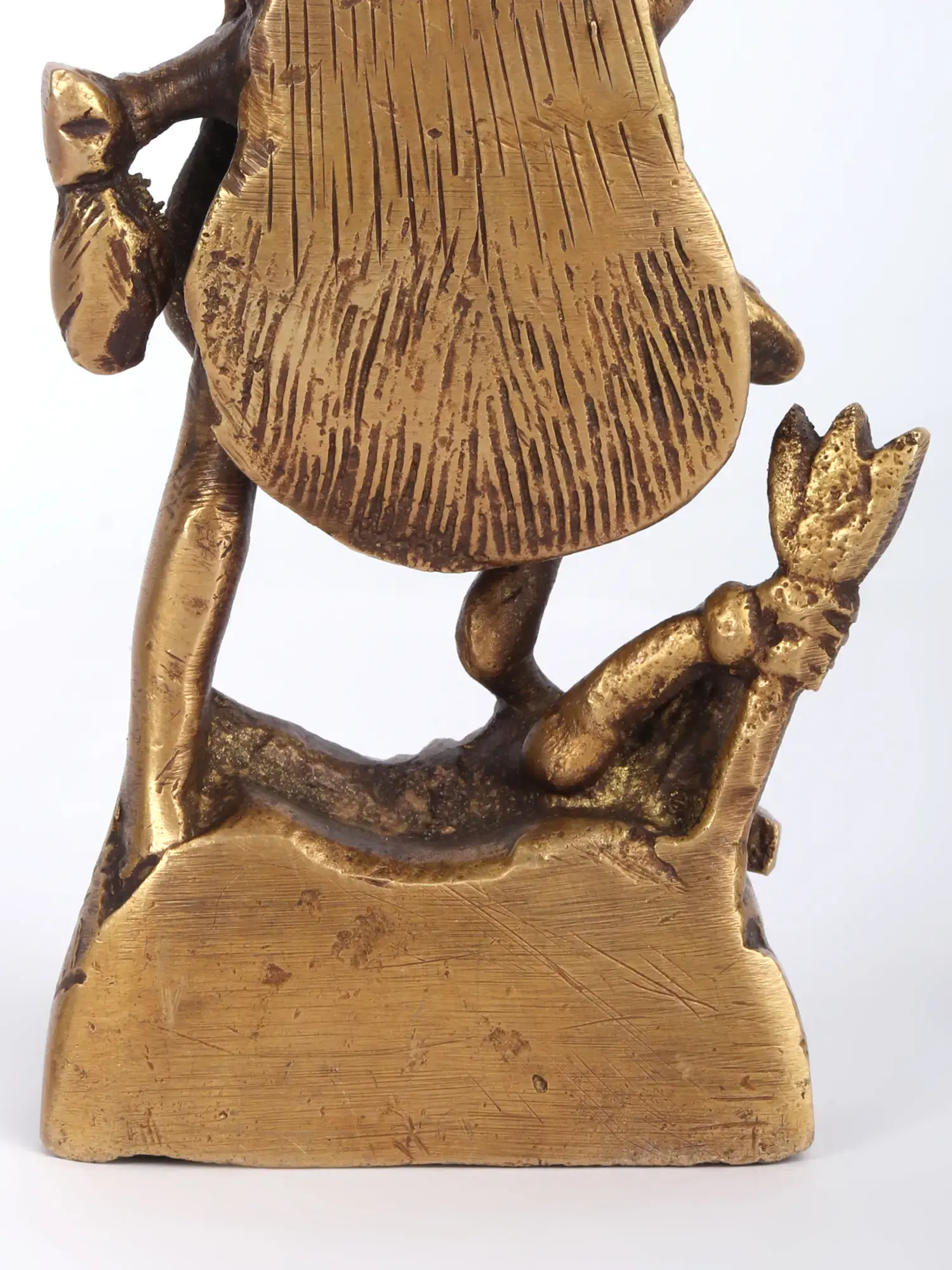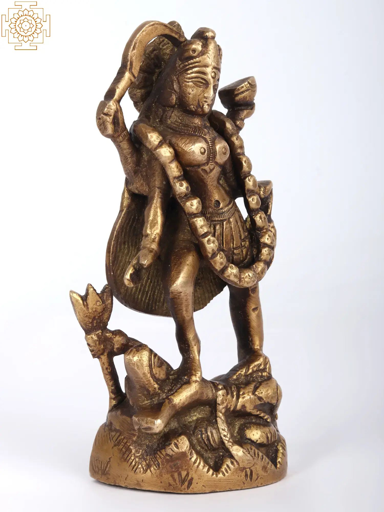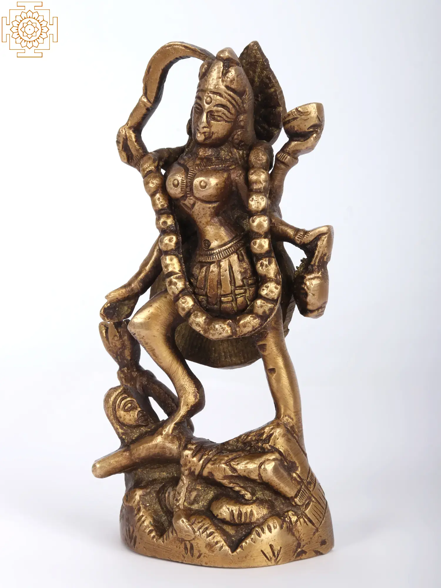 In this striking brass statue, Mother Kali stands tall, her fierce visage reflecting both destruction and creation. She holds symbols of power, compassion, and protection in her multiple hands. The garland adorning her represents the cycle of life, death, and rebirth. She is the embodiment of divine motherly love, guiding her devotees through challenges and obstacles. The portrayal of her standing on Shiva signifies the balance between destruction and creation, showcasing her as the force that empowers the universe. A single look to this art piece will help you find courage amidst the turmoil, and embrace the transformative energies of the divine Mother.