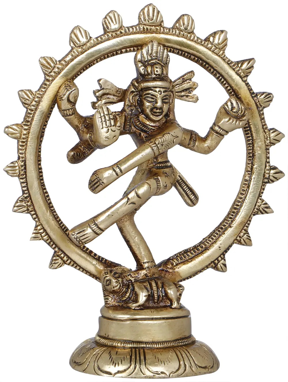 In Hinduism, Lord Nataraja is a depiction of “Lord Shiva”, symbolising the cosmic dance of Creation, Preservation, and Destruction. Depicted with four arms, dancing within a circle of flames, Nataraja embodies the rhythm of the universe. This dancing posture symbolises the “cycle of birth and death”, while the raised hand indicates liberation from earthly bondage. As the cosmic dancer, Nataraja is associated with the divine Art of dance and Music. This brass creation inspires you to find harmony within chaos and embrace the cyclical nature of life.
