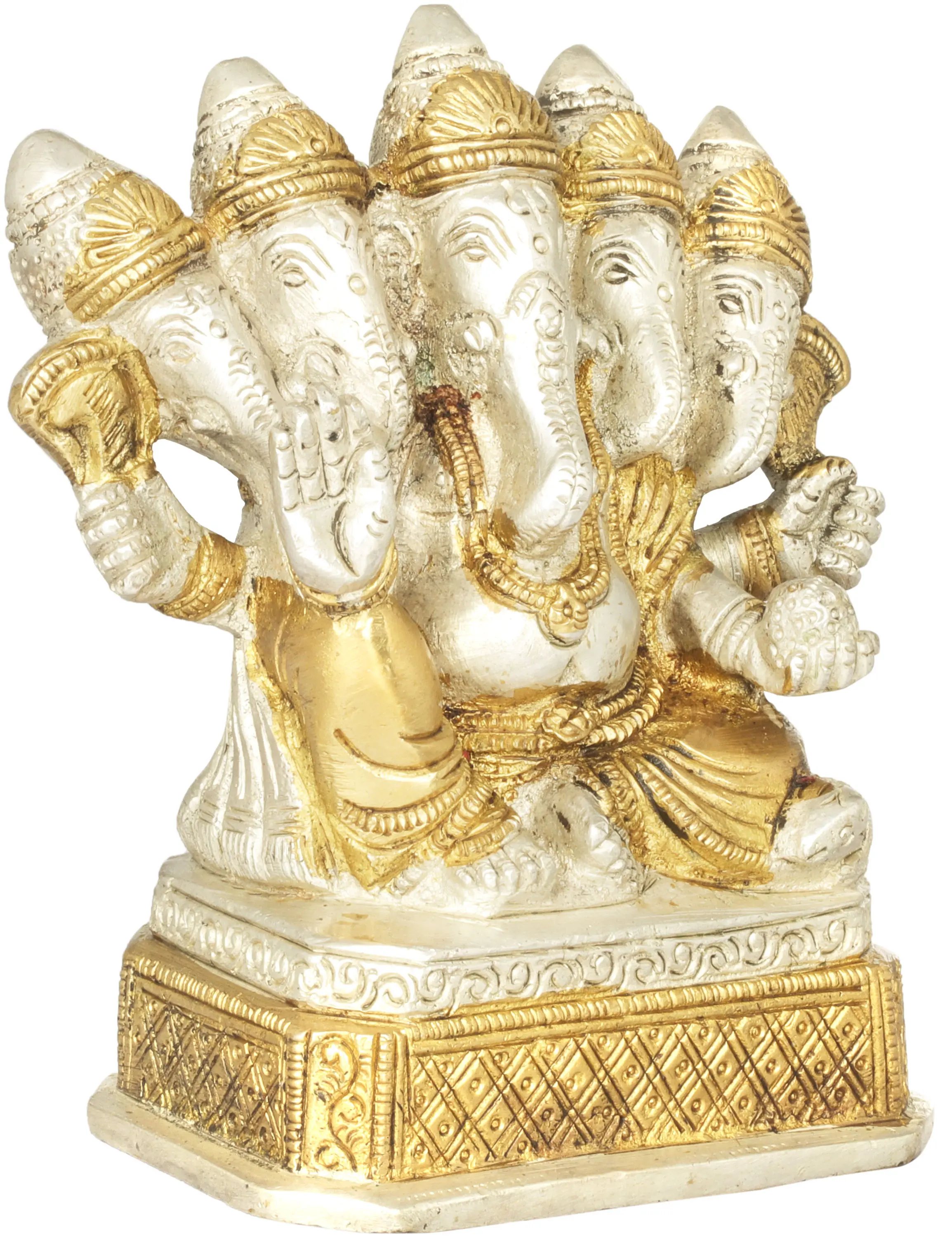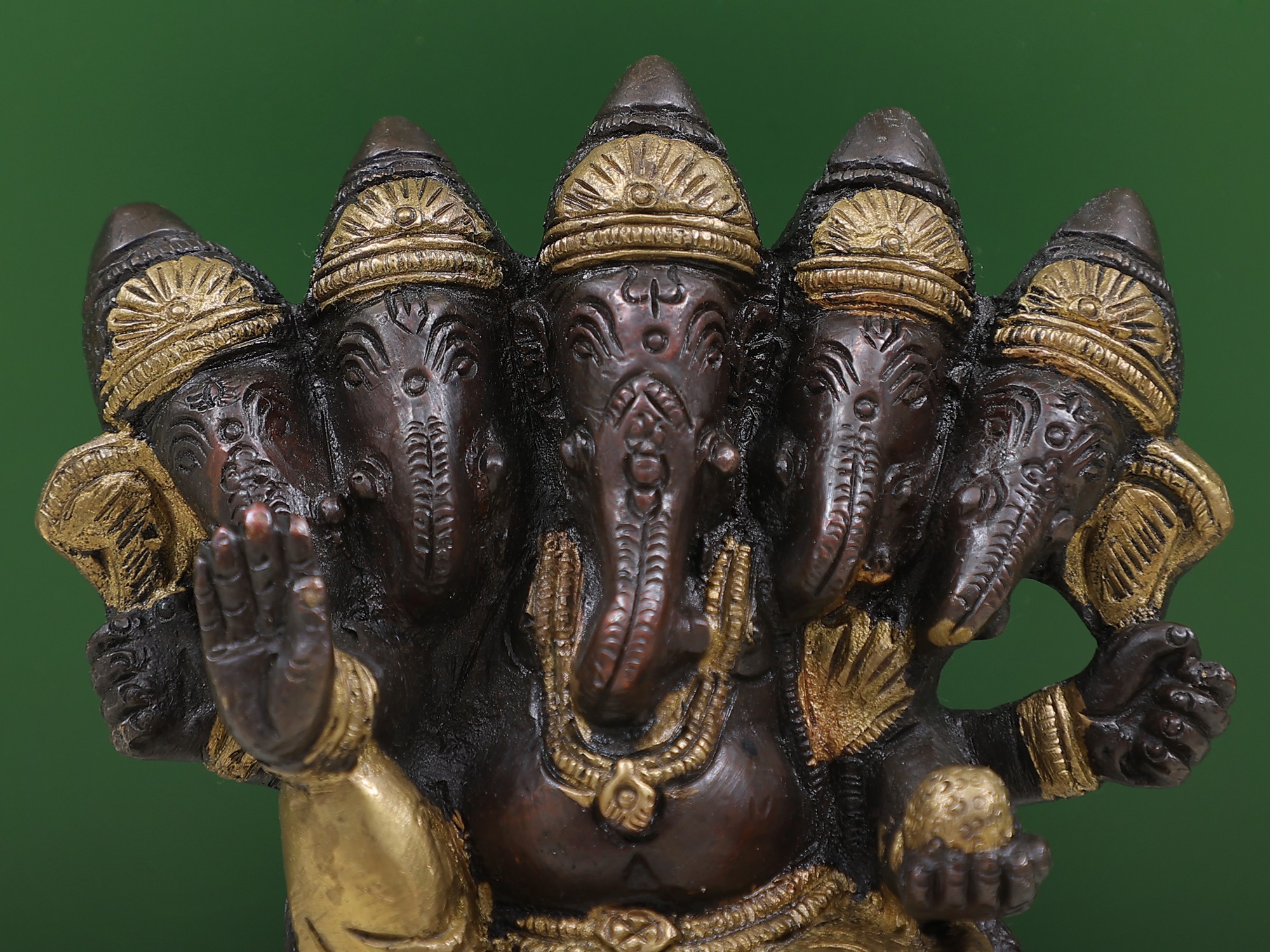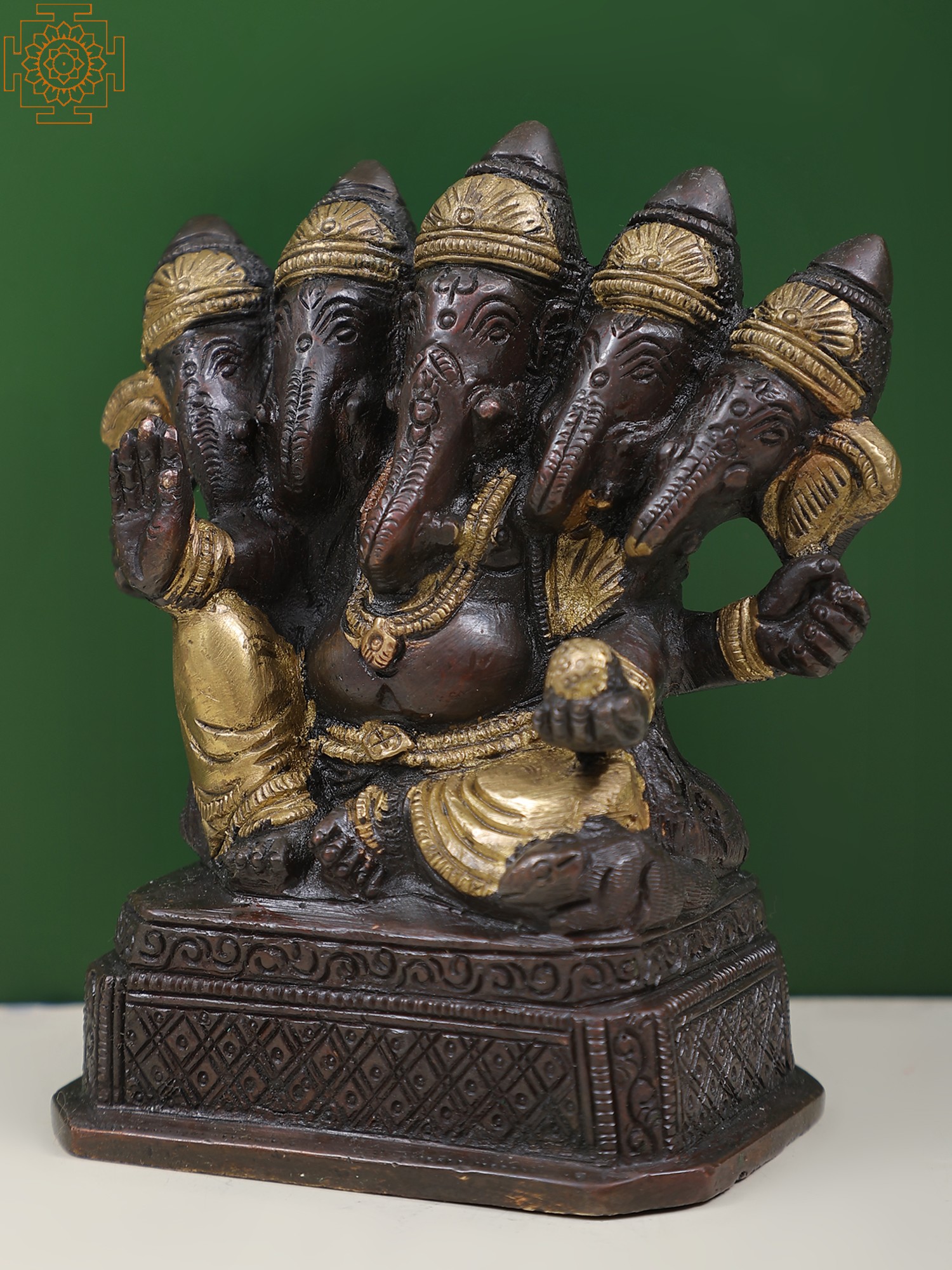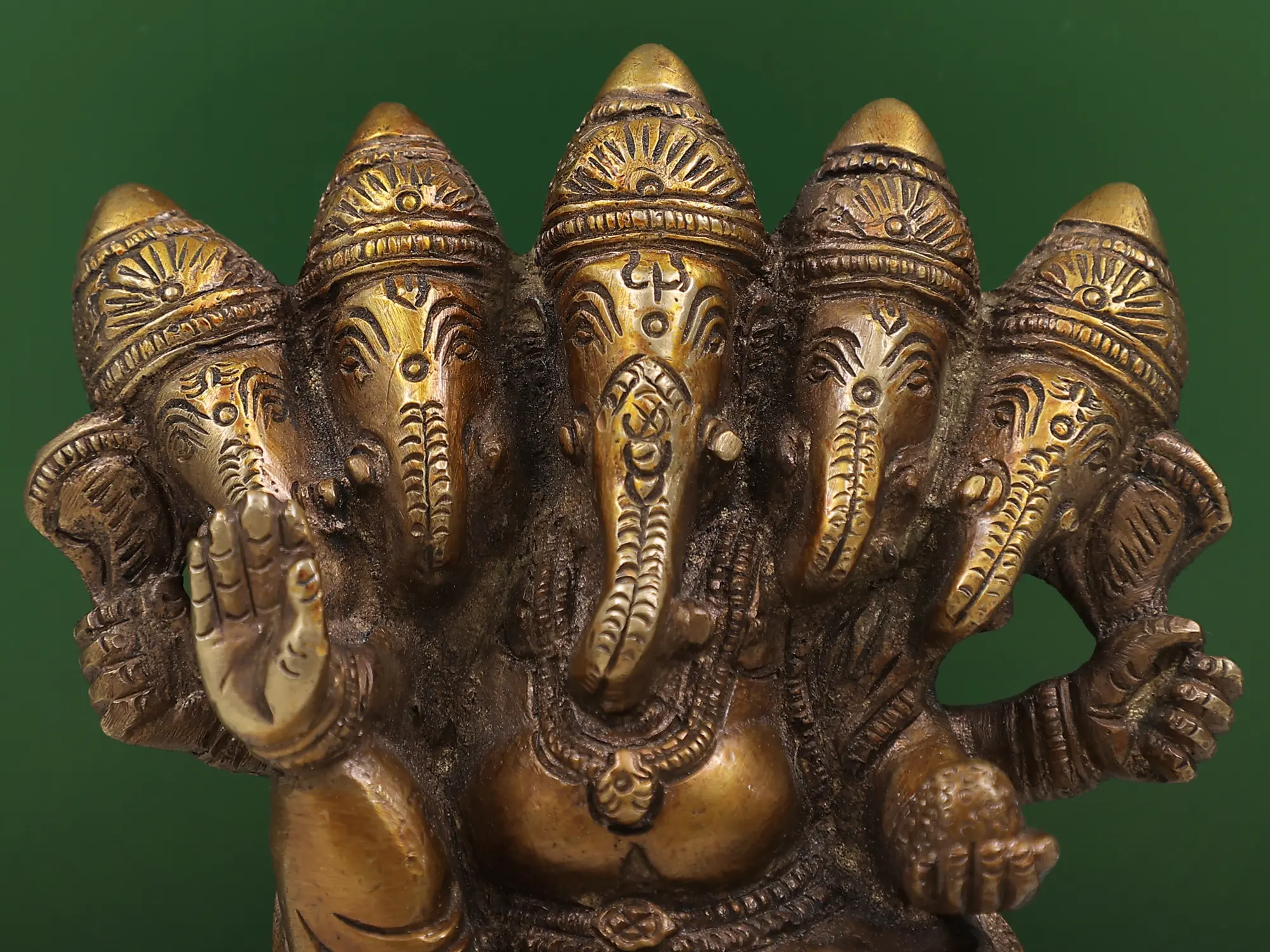 This stunning brass Panch-Mukhi Ganesha statue encapsulates the multidimensional facets of the beloved deity. Ganesha's five heads represent the diverse perspectives through which he bestows blessings upon devotees. His intricately adorned crown signifies sovereignty over obstacles, and his modaka symbolizes the sweet rewards of life. The noose and goad in his hands guide individuals towards righteous paths, while his broken tusk teaches sacrifice. His ample belly signifies acceptance and contentment. Ganesha's presence exudes a sense of comfort, reminding us that life's journey is a blend of challenges and joys.