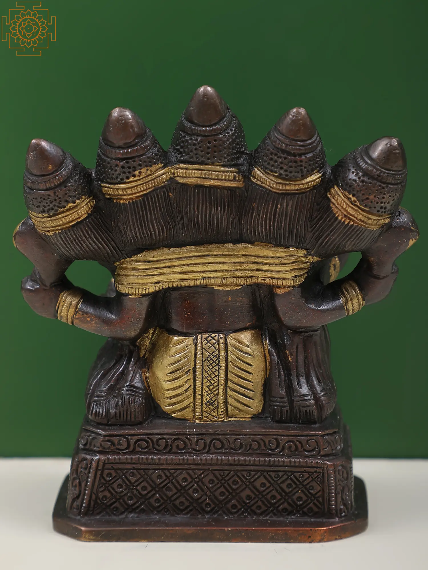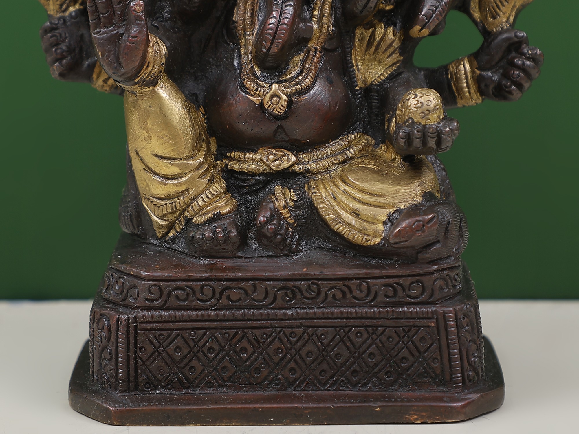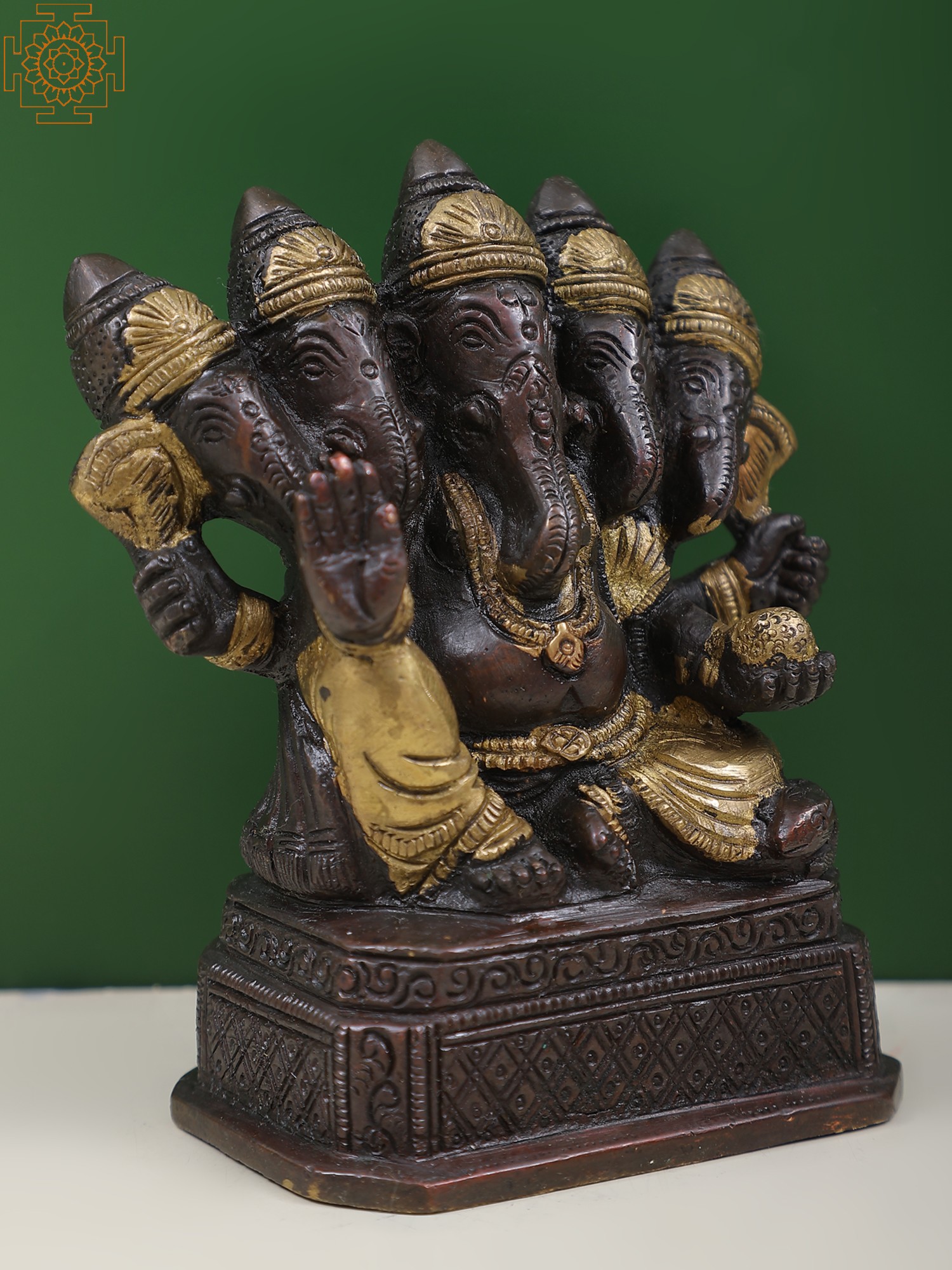 This stunning brass Panch-Mukhi Ganesha statue encapsulates the multidimensional facets of the beloved deity. Ganesha's five heads represent the diverse perspectives through which he bestows blessings upon devotees. His intricately adorned crown signifies sovereignty over obstacles, and his modaka symbolizes the sweet rewards of life. The noose and goad in his hands guide individuals towards righteous paths, while his broken tusk teaches sacrifice. His ample belly signifies acceptance and contentment. Ganesha's presence exudes a sense of comfort, reminding us that life's journey is a blend of challenges and joys.