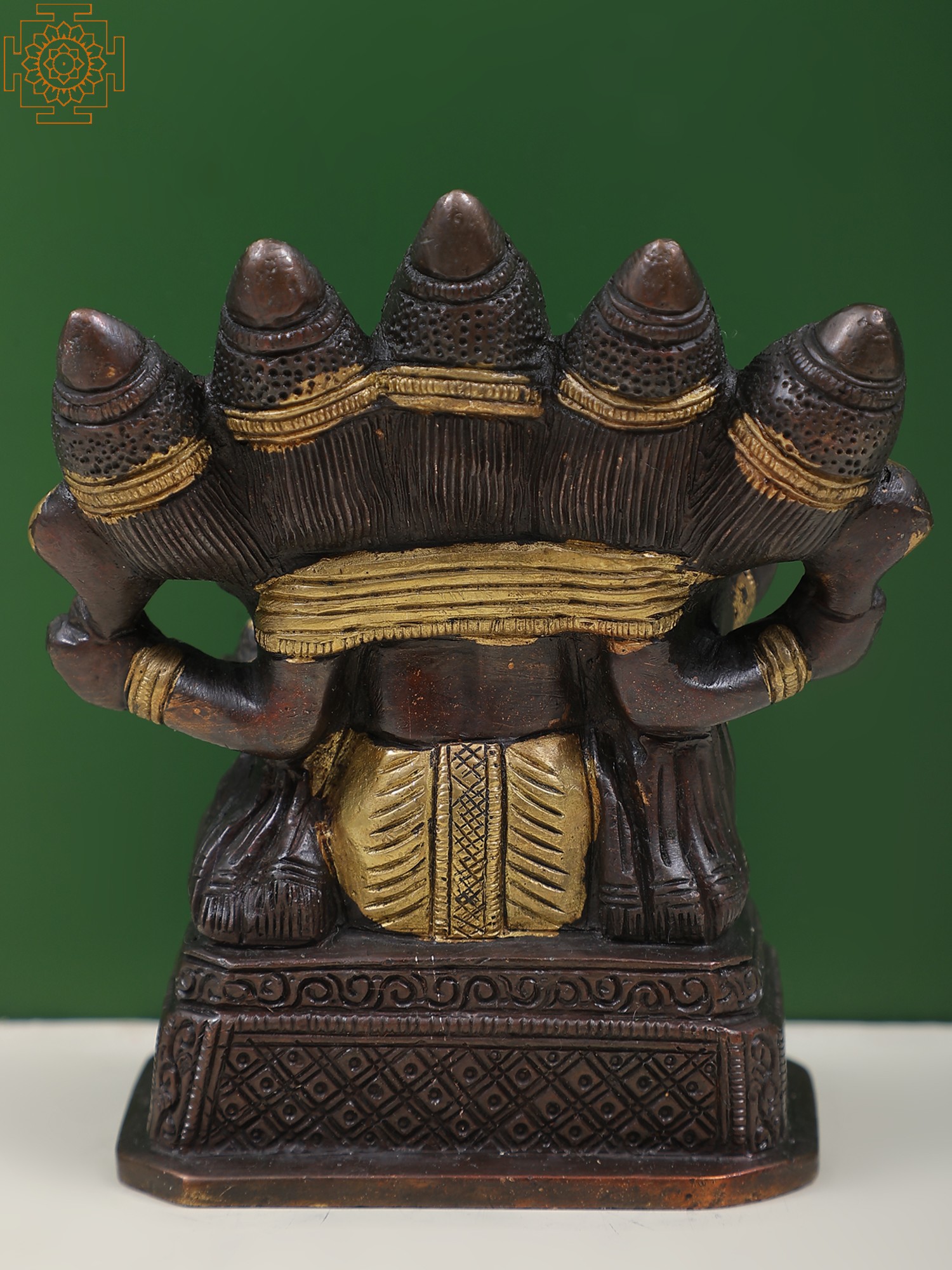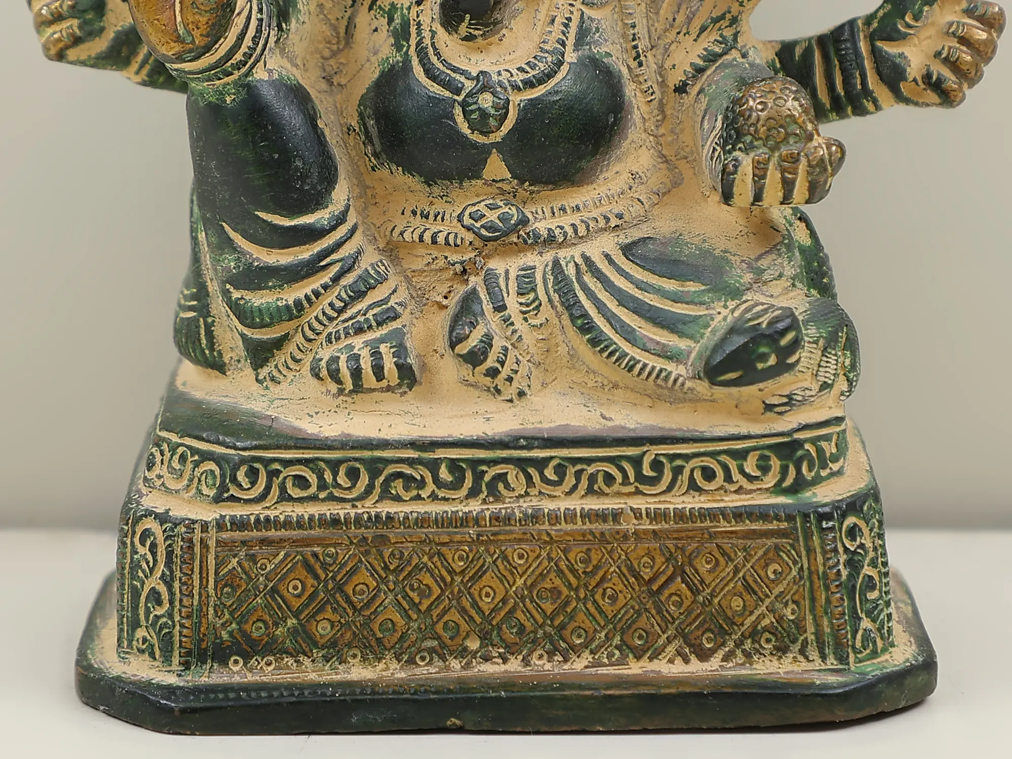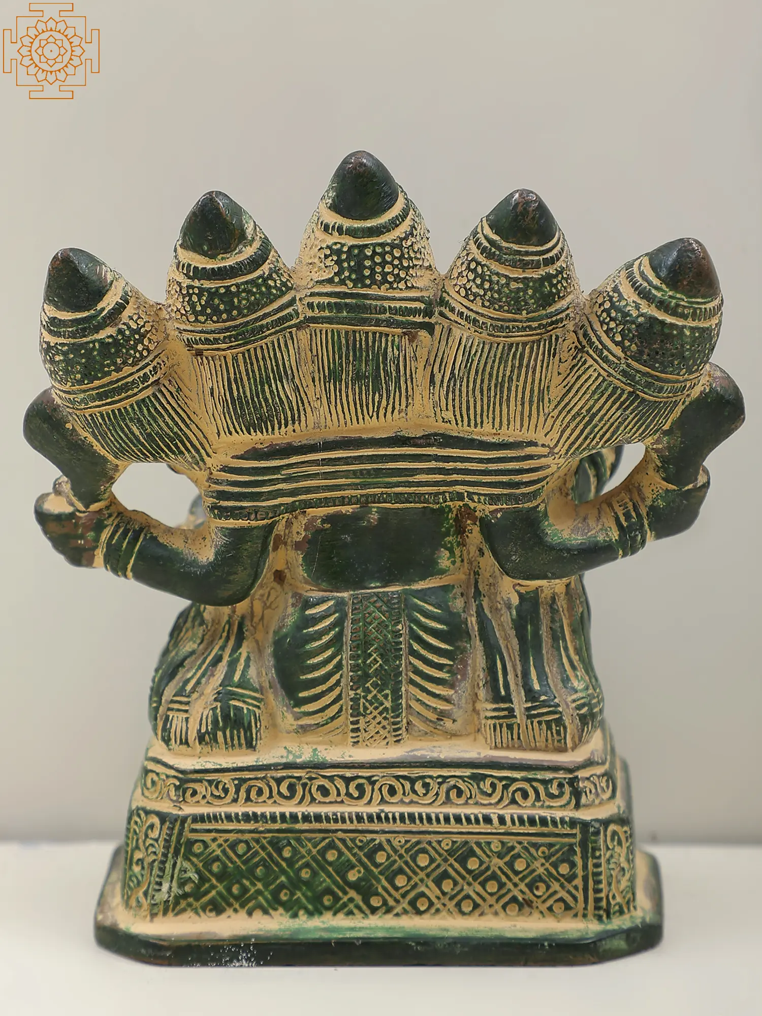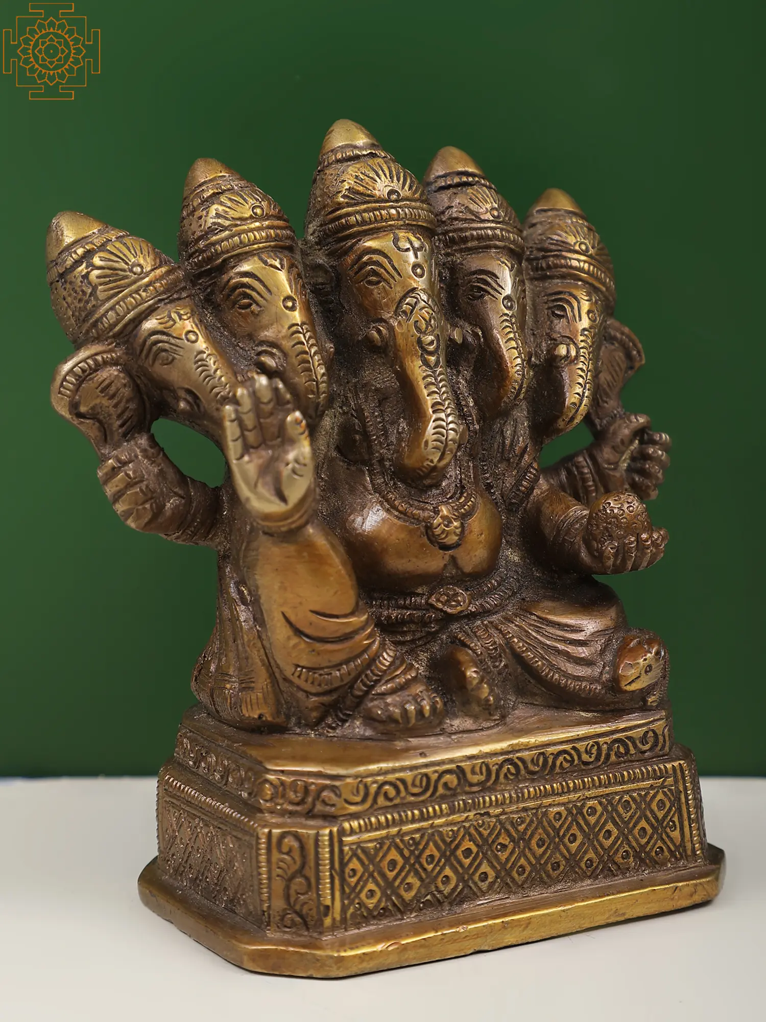 This stunning brass Panch-Mukhi Ganesha statue encapsulates the multidimensional facets of the beloved deity. Ganesha's five heads represent the diverse perspectives through which he bestows blessings upon devotees. His intricately adorned crown signifies sovereignty over obstacles, and his modaka symbolizes the sweet rewards of life. The noose and goad in his hands guide individuals towards righteous paths, while his broken tusk teaches sacrifice. His ample belly signifies acceptance and contentment. Ganesha's presence exudes a sense of comfort, reminding us that life's journey is a blend of challenges and joys.