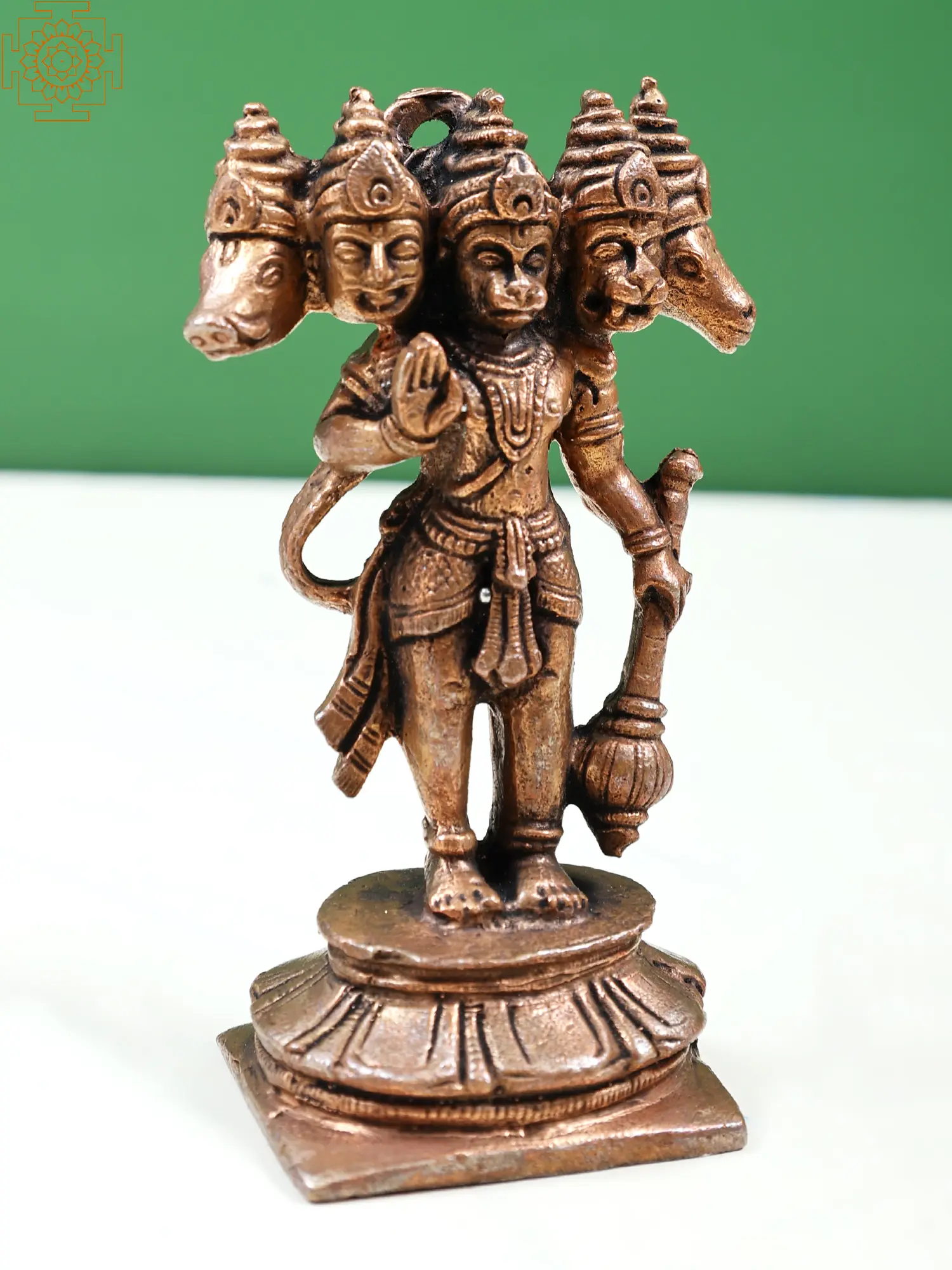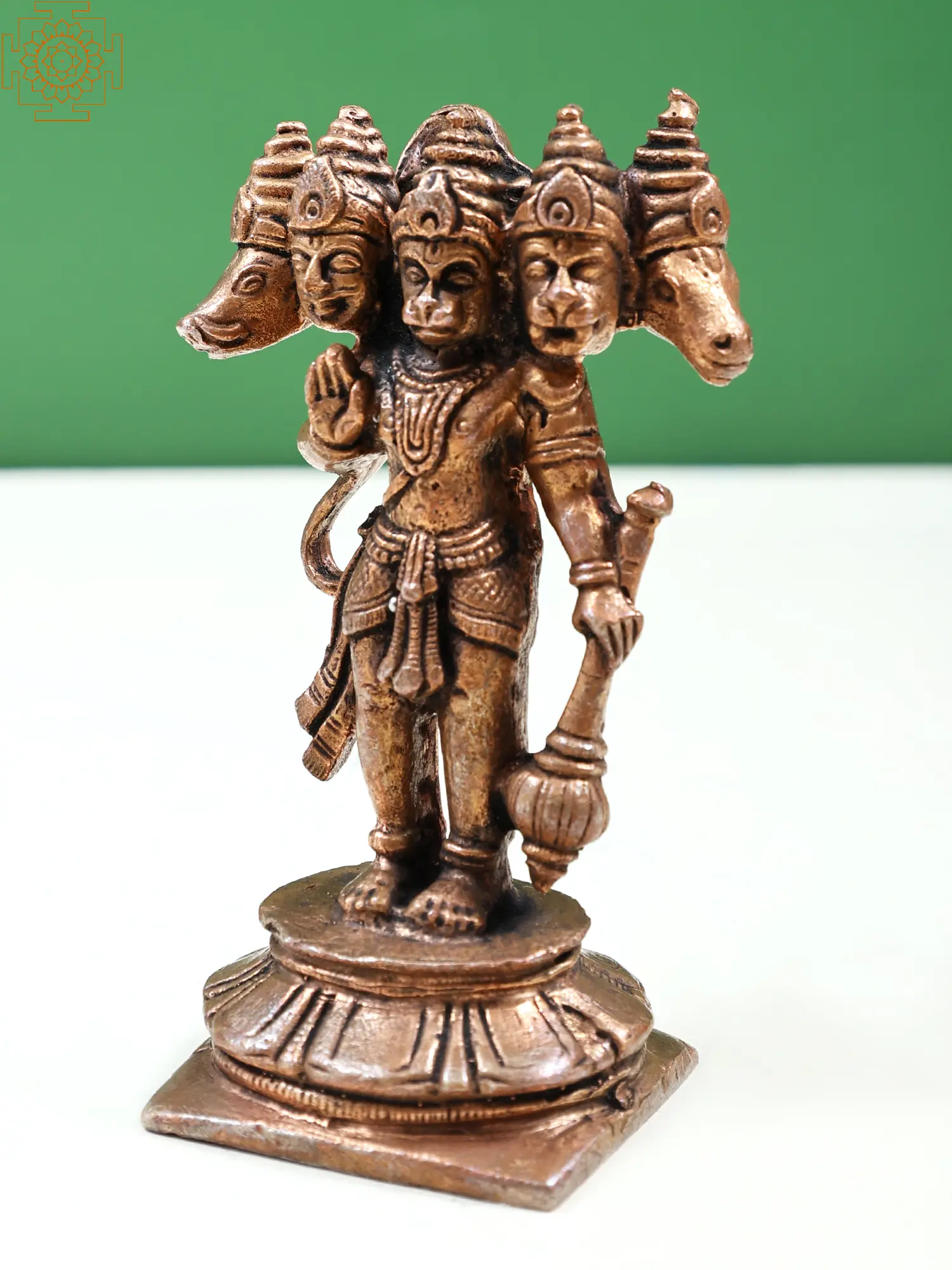 The five-faced roopa of Lord Hanuman as Panchamukhi Hanuman is a potent manifestation of the god, venerated by his devotees for complete protection from evil forces and the ascent to higher states of intelligence and strength. His five faces stand for the five stages of devotion—Naman, Smaran, Keertan, Yachna, and Arpan—as well as Hanuman's rule over the four directions and the sky. Panchamukhi Hanuman, depicted in this copper statue in a firm standing posture with celestial weapons in his hands and a look of heavenly quiet on his face, infuses the mind with a harmony of calm and vitality.