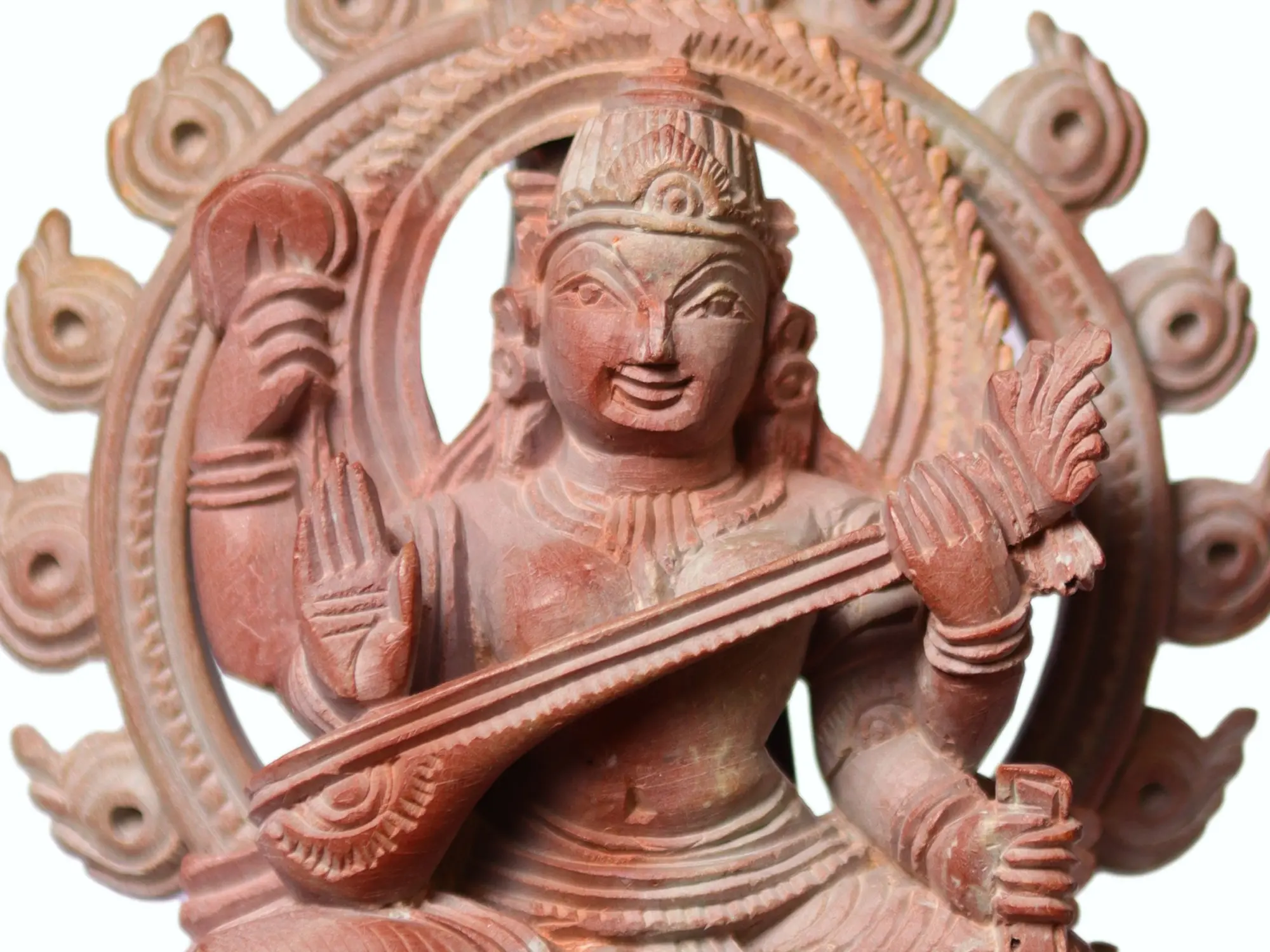 The choice of pink stone for this idol is particularly noteworthy. This natural stone, often sourced from regions renowned for their rich mineral deposits, lends a unique warmth and subtle vibrancy to the sculpture. The soft hue of the stone complements the divine feminine energy of Saraswati, creating a piece that is both aesthetically pleasing and spiritually resonant. The traditional craftsmanship, evident in every carved line and curve, speaks of a lineage of artisans who have preserved these sacred art forms for generations. The decorative halo behind Saraswati further enhances her celestial presence, symbolizing her enlightenment and divine radiance. This piece is not merely an object of worship but a testament to the enduring power of art and devotion.