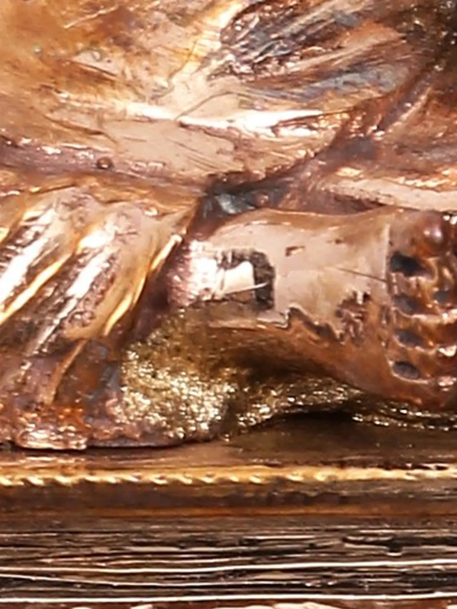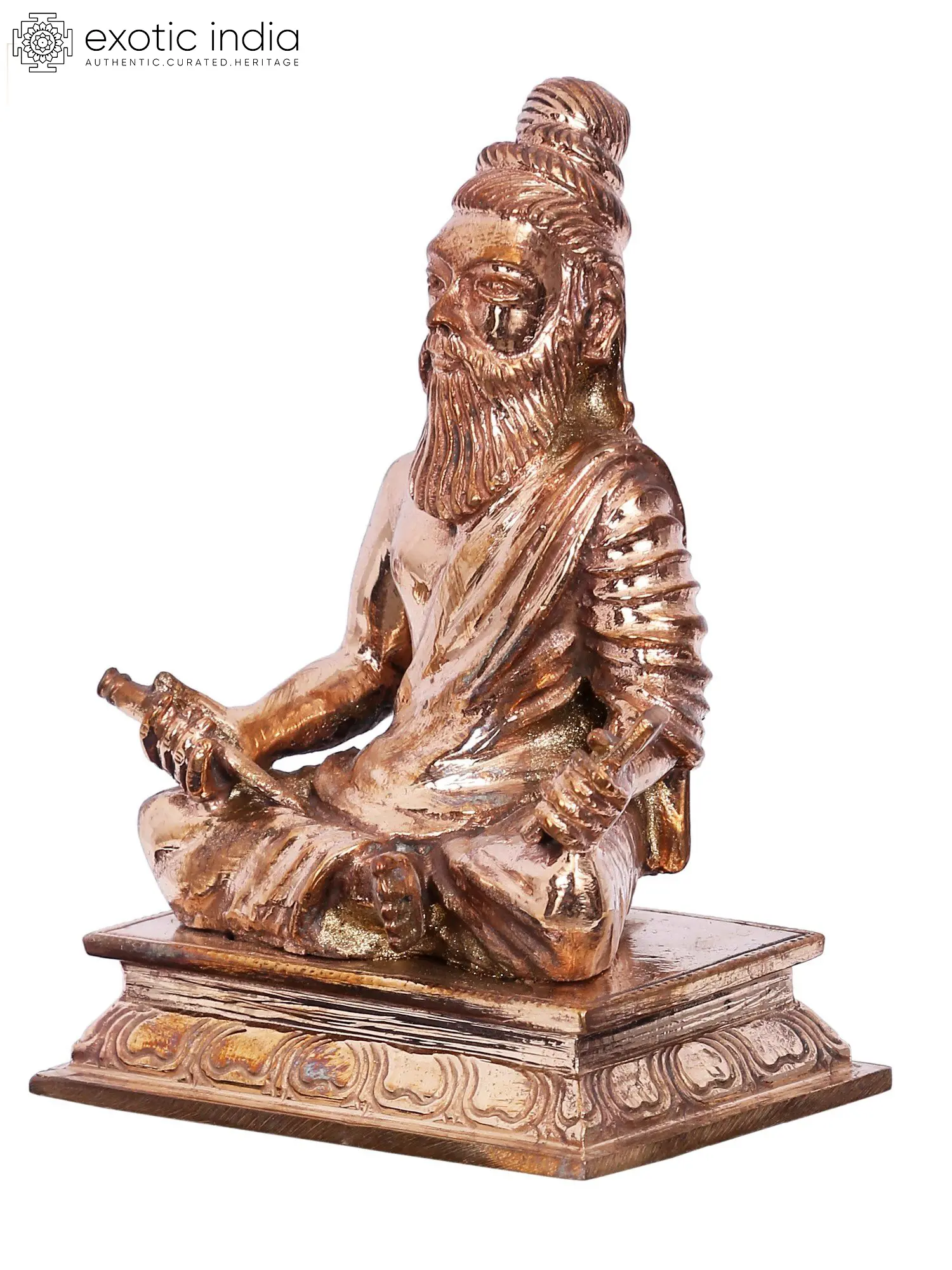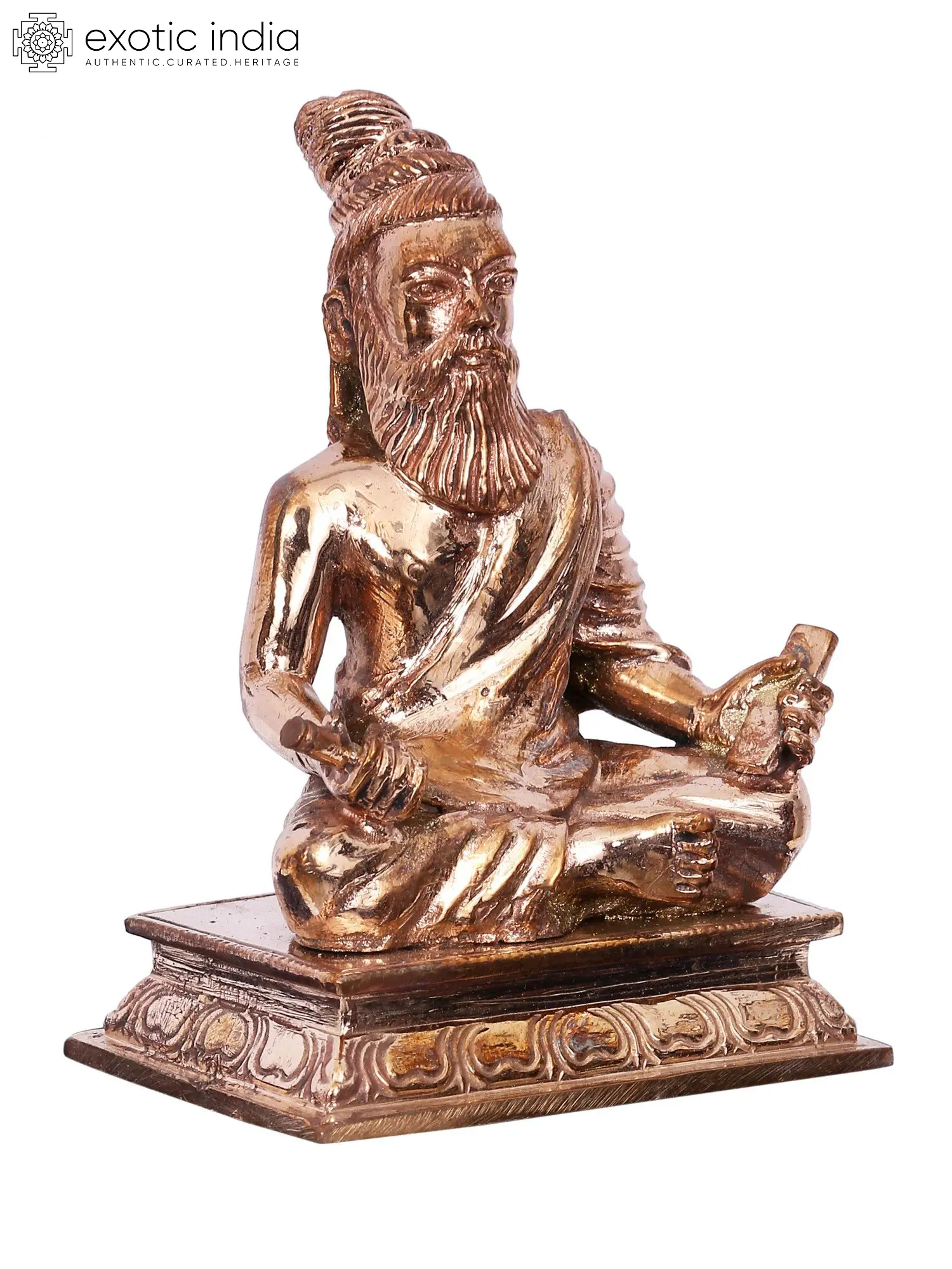 The Small Saint Thiruvalluvar is an exquisite Panchaloha bronze sculpture that pays homage to the ancient Tamil poet and philosopher, Thiruvalluvar. Known for his literary masterpiece, the Thirukkural, he is revered for his profound wisdom and moral teachings. This sculpture captures the saint in a meditative posture, reflecting his deep contemplation and connection with higher truths. What the sculpture here depicts is the wisdom found in silence and introspection. Thiruvalluvar's teachings direct one to seek knowledge, cultivate virtue, and lead a life of compassion, righteousness, and inner peace.