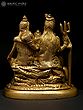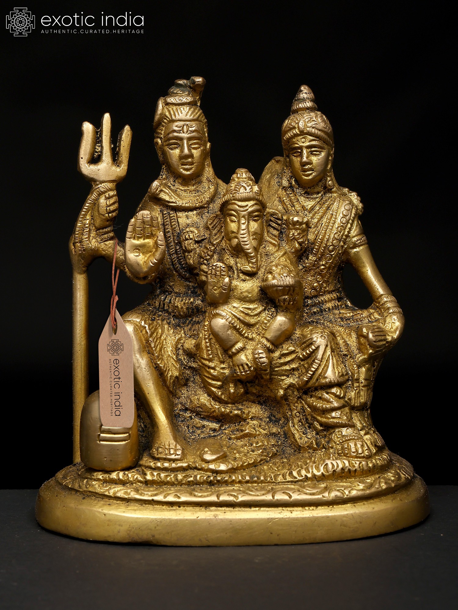 This intricately crafted brass statue depicts Shiva, the destroyer and transformer, together with his consort Parvati, the embodiment of power and motherhood, and their beloved son, Ganesha, the remover of obstacles. The trio radiates a sense of harmony and familial love, capturing a pivotal narrative within the vast tapestry of Hindu mythology. The statue is meticulously detailed, showcasing the traditional adornments and iconic symbols associated with each deity. From Shiva's third eye representing wisdom and his trident, a symbol of his power over the three realms, to Parvati’s elegant attire and gentle demeanor, and Ganesha’s endearing form with his elephant head and auspicious presence, every element is carefully rendered.
