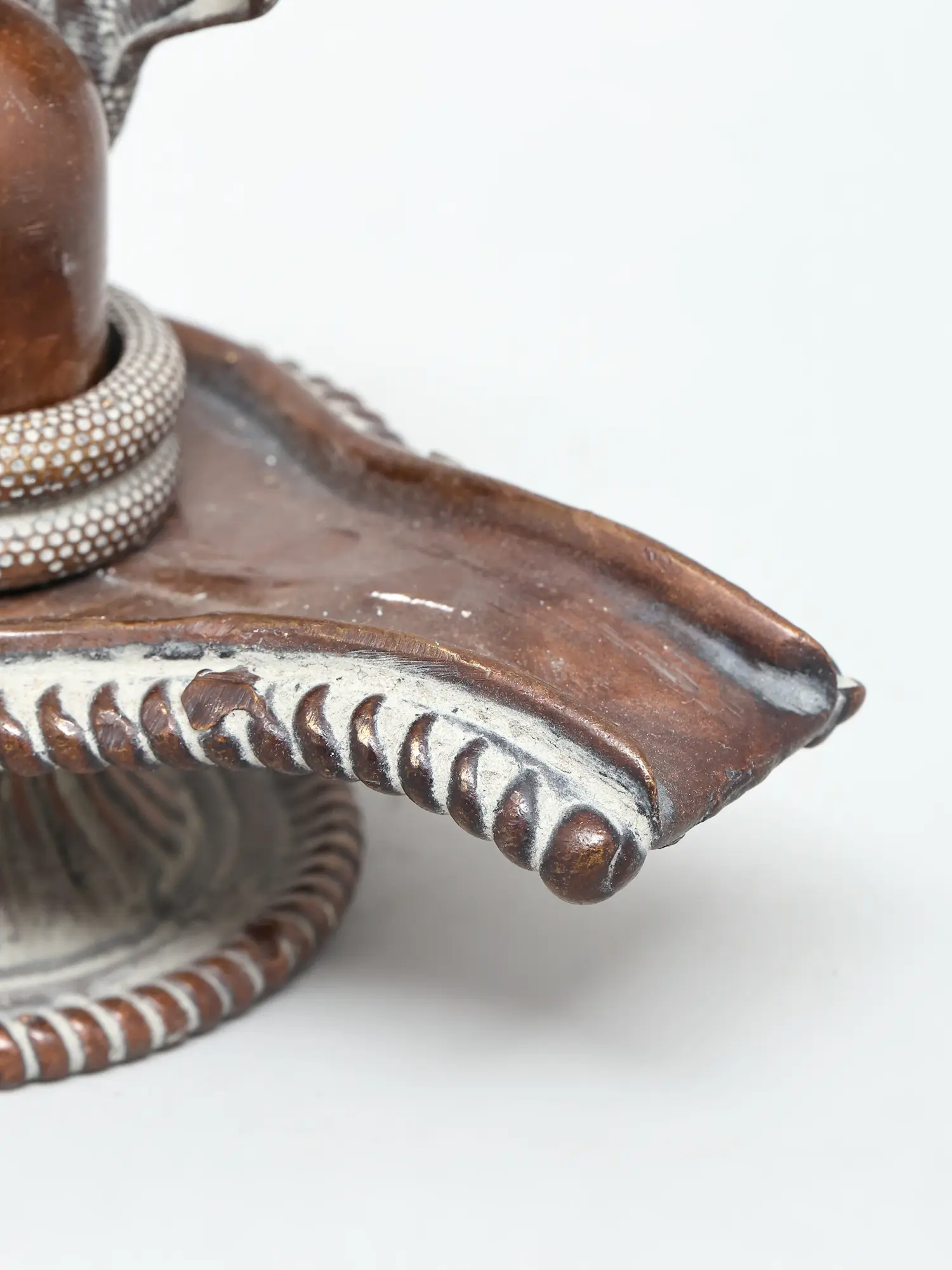 This captivating representation of the Shivalinga and its Naga protector is meticulously crafted from a blend of copper and silver. The use of these sacred metals imbues the artifact with a traditional and auspicious aura. Copper, known for its conductivity and association with the sun, has been used for millennia in religious artifacts, believed to possess purifying properties. The subtle interplay of silver, often linked to the moon and divine purity, adds a luminous dimension. The rich patina that develops over time on copper statues only enhances their aesthetic appeal and spiritual significance, making each piece a unique testament to devotion and artistic skill. The base of the lingam, with its fluted design and textured edge, provides a stable and elegant pedestal, further enhancing the divine presence it represents. This piece is not merely an object of art but a conduit for spiritual energy and a timeless emblem of faith.
