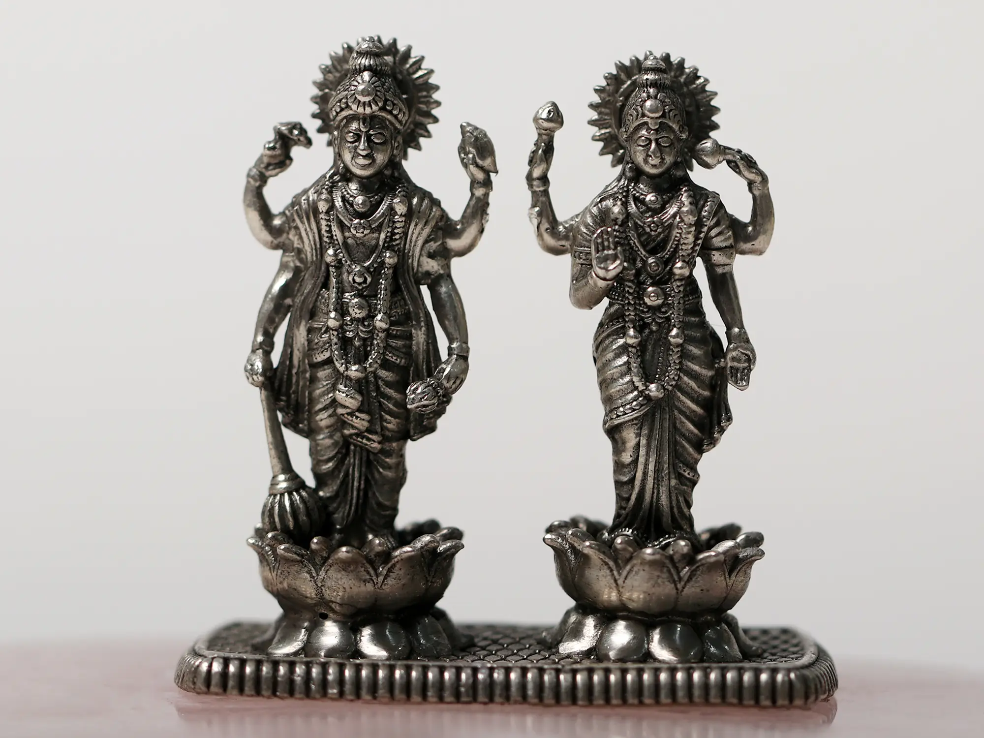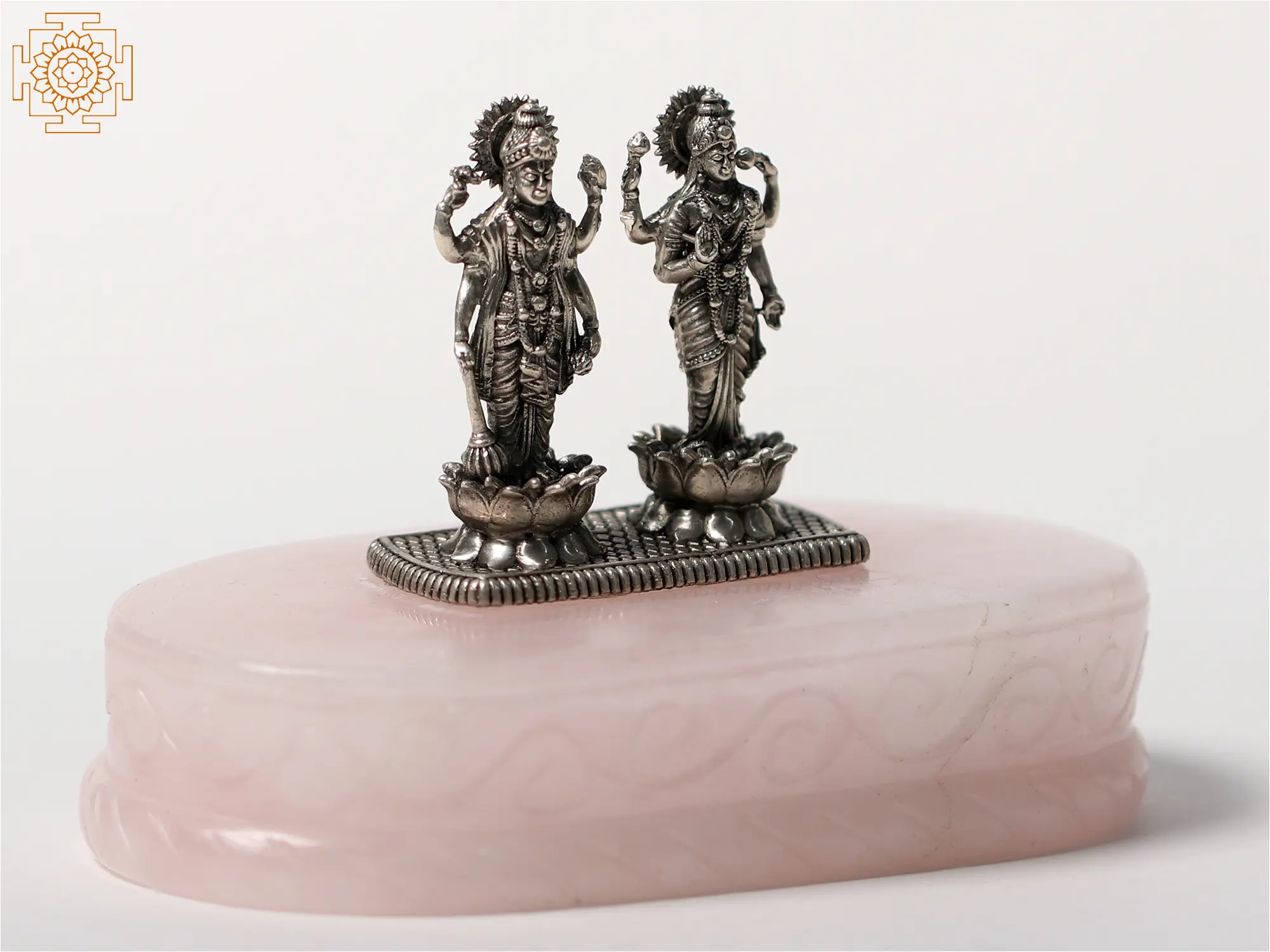 The Small Silver God Vishnu and Goddess Laxmi idols, beautifully placed on a Natural Rose Quartz base, symbolize the divine partnership between the preserver, Vishnu, and the goddess of wealth and prosperity, Laxmi. This sculpture represents the harmony and abundance that come from embracing a life of balance and gratitude. Vishnu's role as the protector and Laxmi's as the bestower of wealth shows the path towards finding equilibrium in material and spiritual pursuits. Together, they inspire us to cultivate a life of balance, knowing that in harmony lies true abundance.