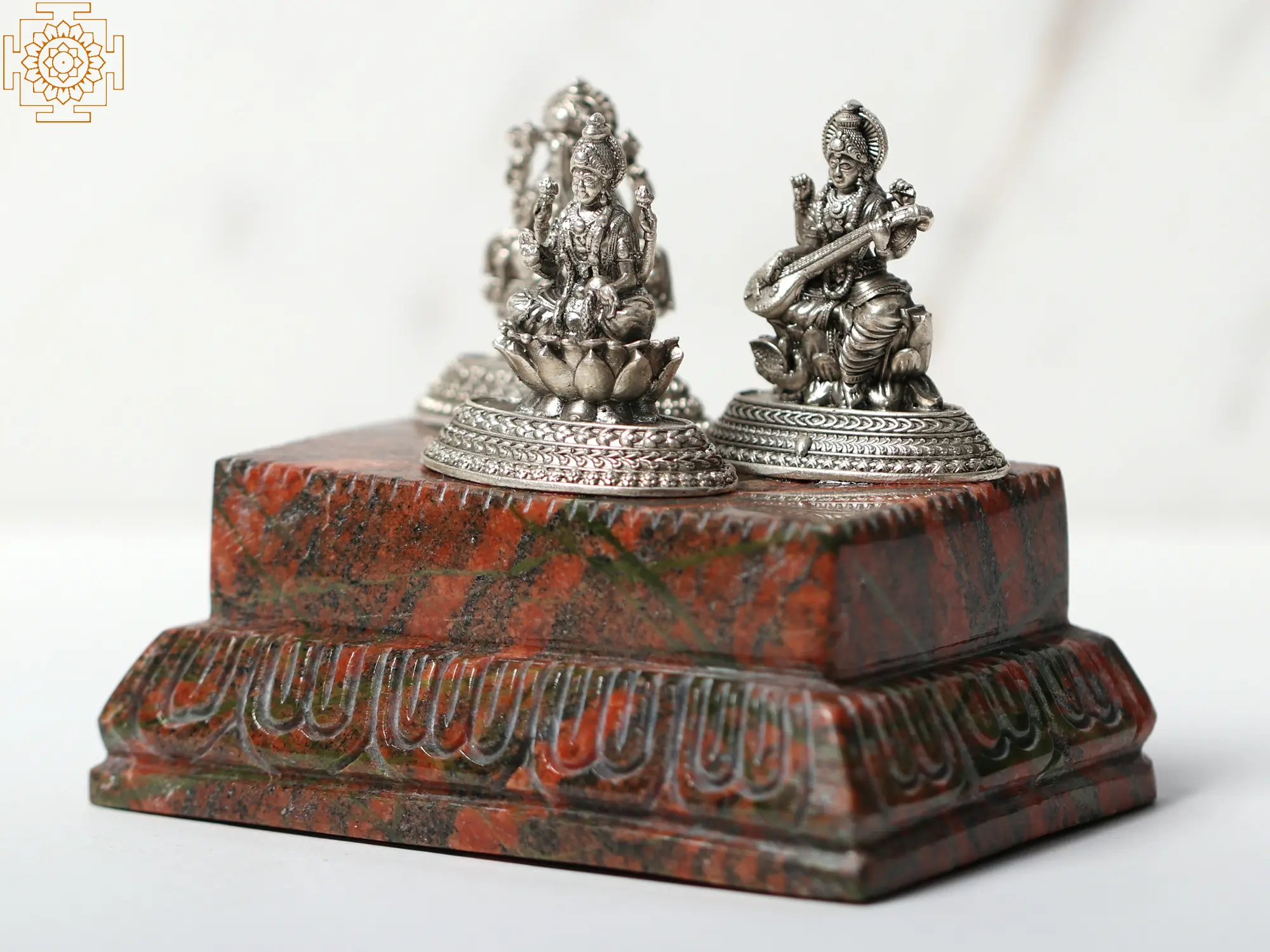 The powerful trio of Hinduism- Lakshmi-Ganesha-Saraswati, who bestows prosperity, auspiciousness, and wisdom that never ends, empower these pure silver statues with their divine aura. All three idols are crafted with enchanting detailing and neat embellishments giving them a rich appeal. With animated and benevolent eyes which fill the whole composition with heavenliness, the divinities are placed on a natural quartz base, a gemstone that balances energies and attracts overall well-being in life.