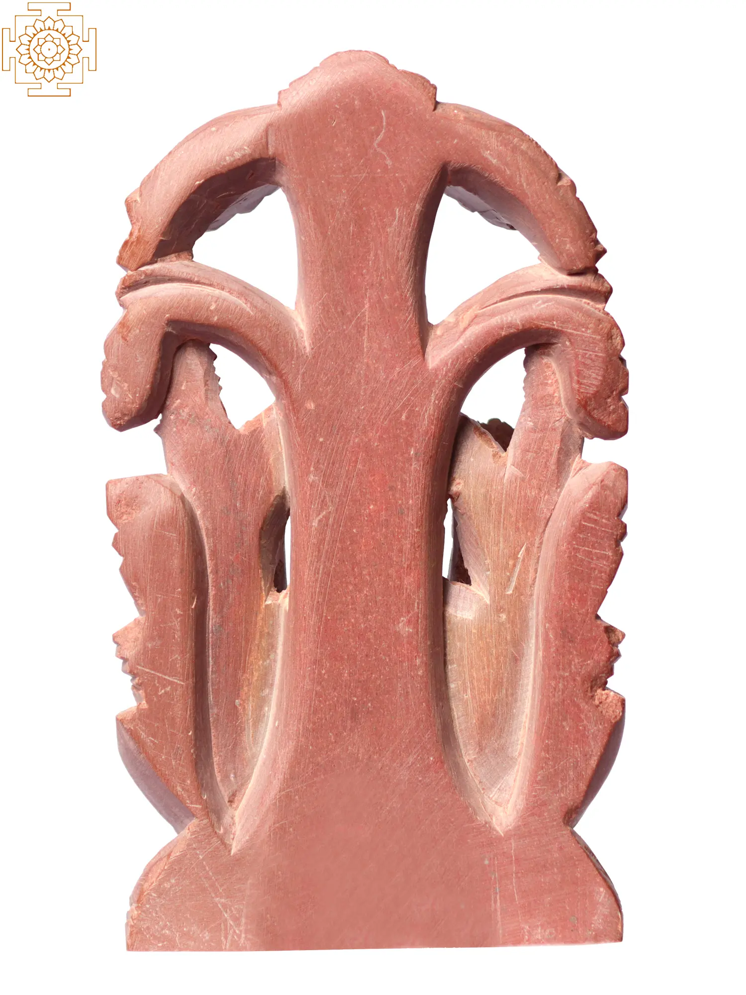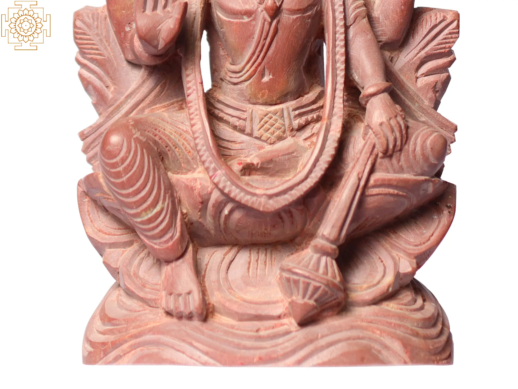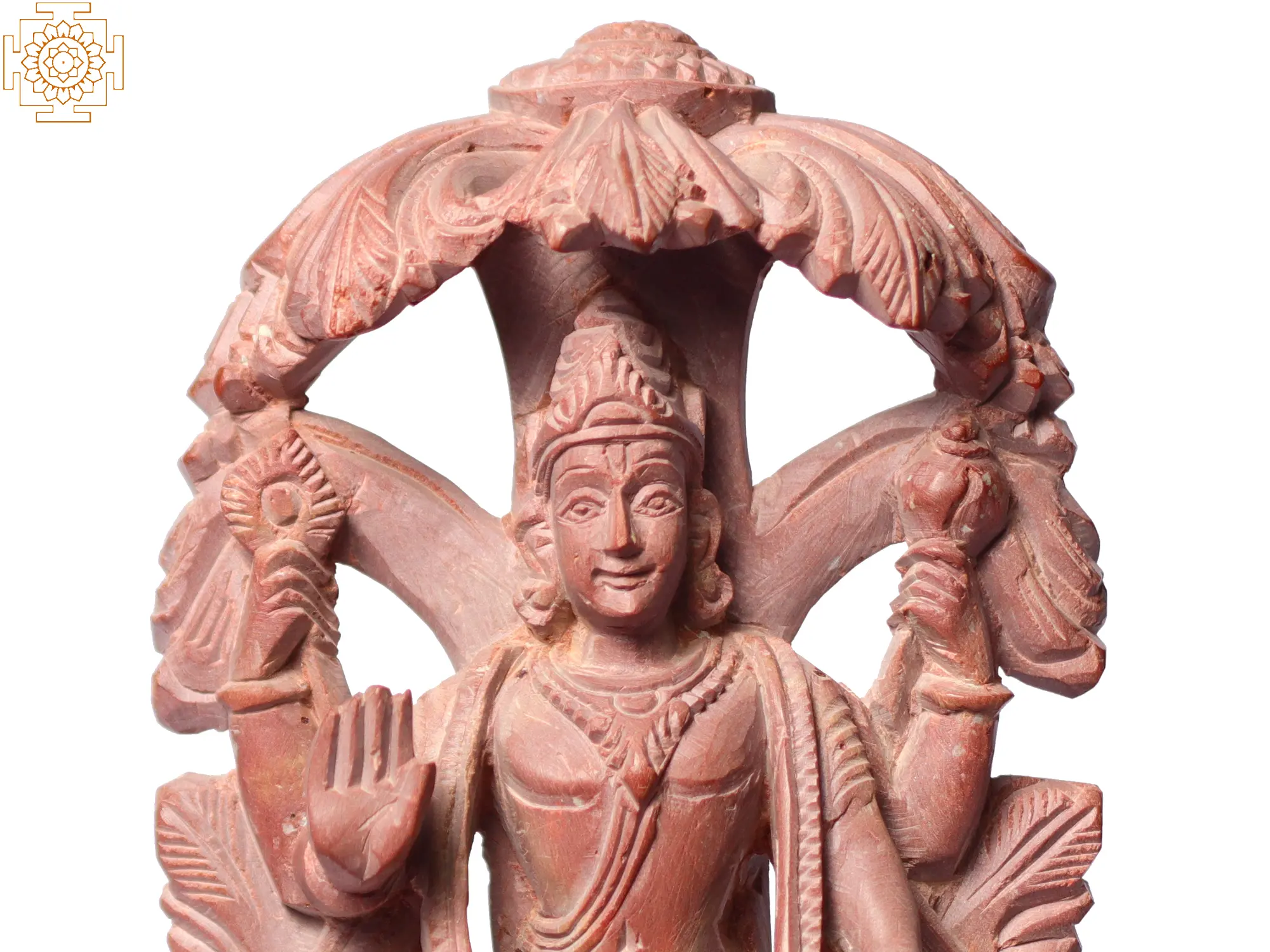 Lord Vishnu, the sustainer and preserver of the Universe, sits beneath a majestic tree, embodying tranquillity and grace. His serene countenance radiates an aura of timeless wisdom. With one hand raised in the Abhaya Mudra, a gesture of fearlessness and protection, He reassures devotees. In His other hands, He holds the mace, a symbol of strength and power; the conch shell, representing the primordial sound of creation; and the discus, symbolising cosmic order and justice. Carved from Pink Stone, this artwork emanates a unique aura, captivating hearts and inspiring devotion.