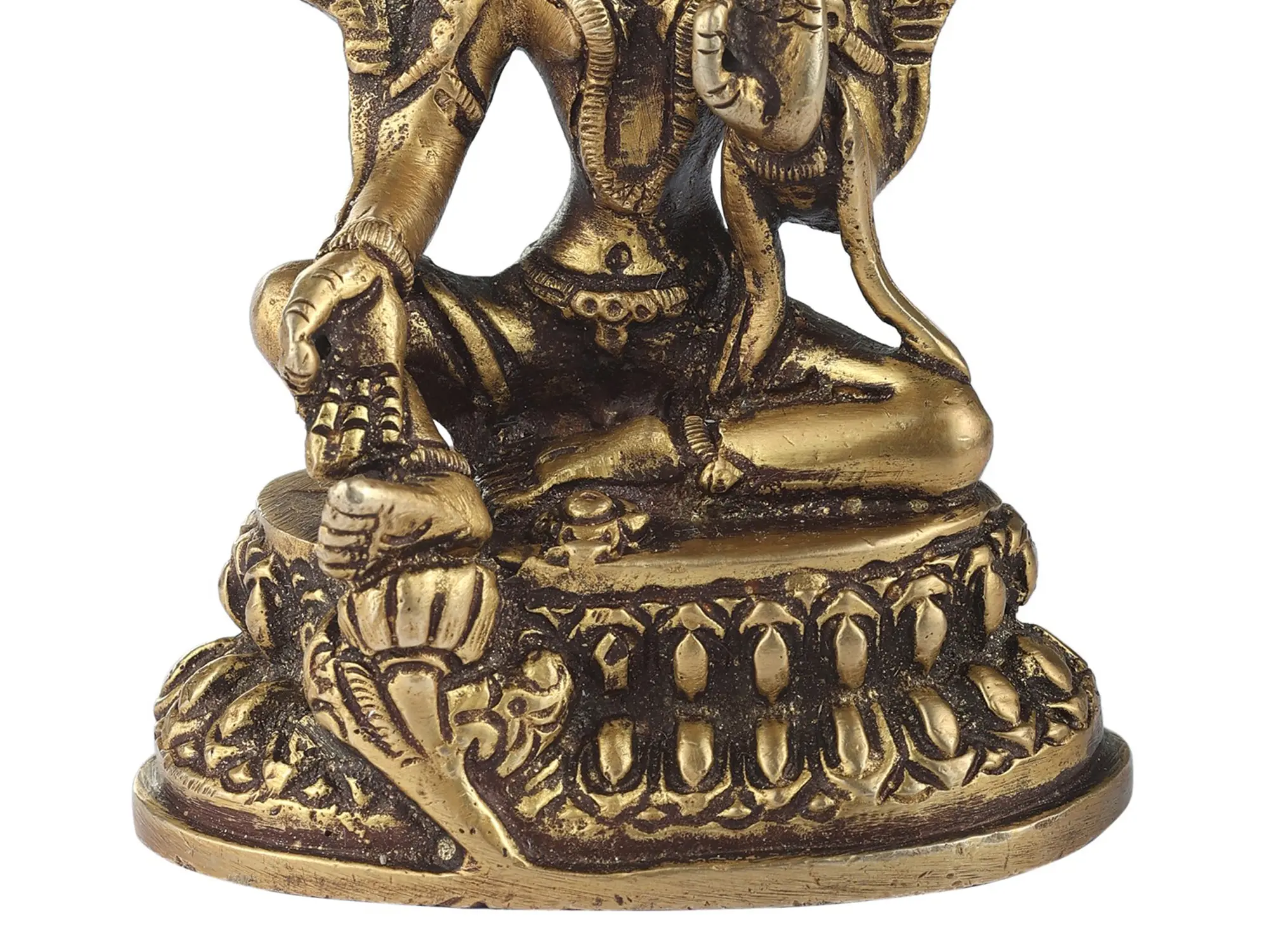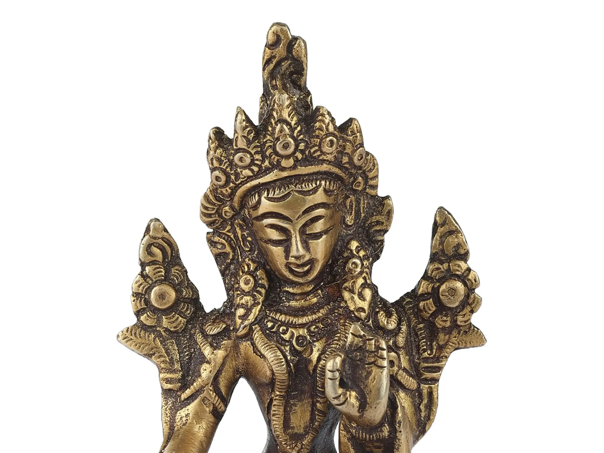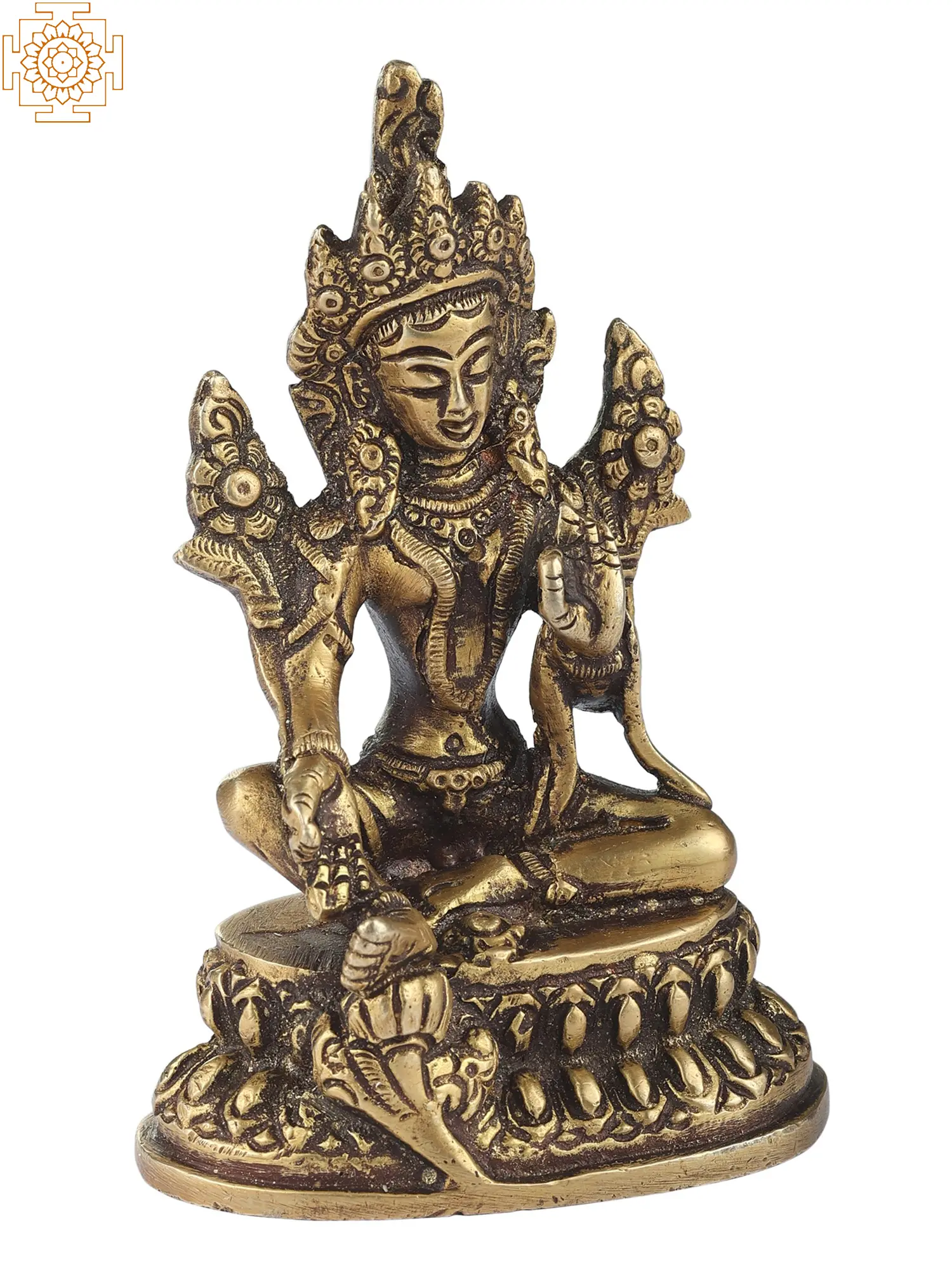 The representation of Karuna (compassion) of Bodhisattva Avalokiteshwara in Buddhism is known as Green Tara or Shyama Tara. On the lotus seat of this brass statue of Green Tara, she sits in a graceful posture, holding two flowers in her hands whose delicateness compliments her form. Adorned with traditional ornaments, goddess Green Tara exudes bliss in the ambiance with her heavenly presence.
