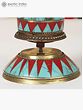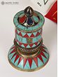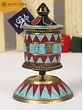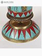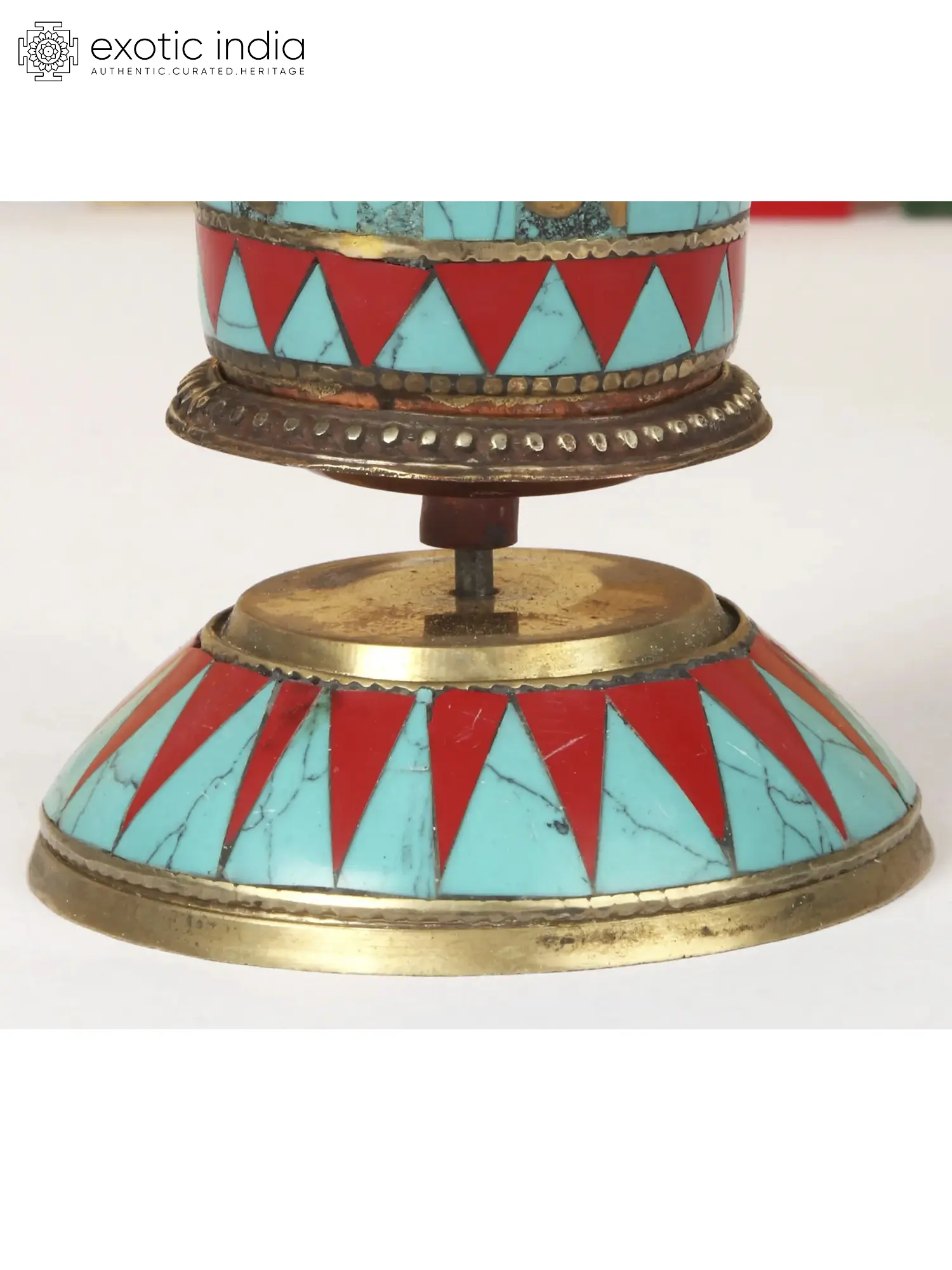 This beautiful Tibetan prayer wheel is an epitome of dedication and well wishes that can bring peace to humanity. This prayer wheel is mainly constituted of brass and is decorated with inlay work carrying the letters of the sacred Om Mani Padme Hum mantra. The regal colors of the turquoise and red colored inlay stones give this prayer wheel a magnificent look. The wheel is placed on a stand attached to a metal rod that runs through the center of the wheel. This wheel combines mantra and motion and is believed to bring peace to the person who rotates it with complete devotion.