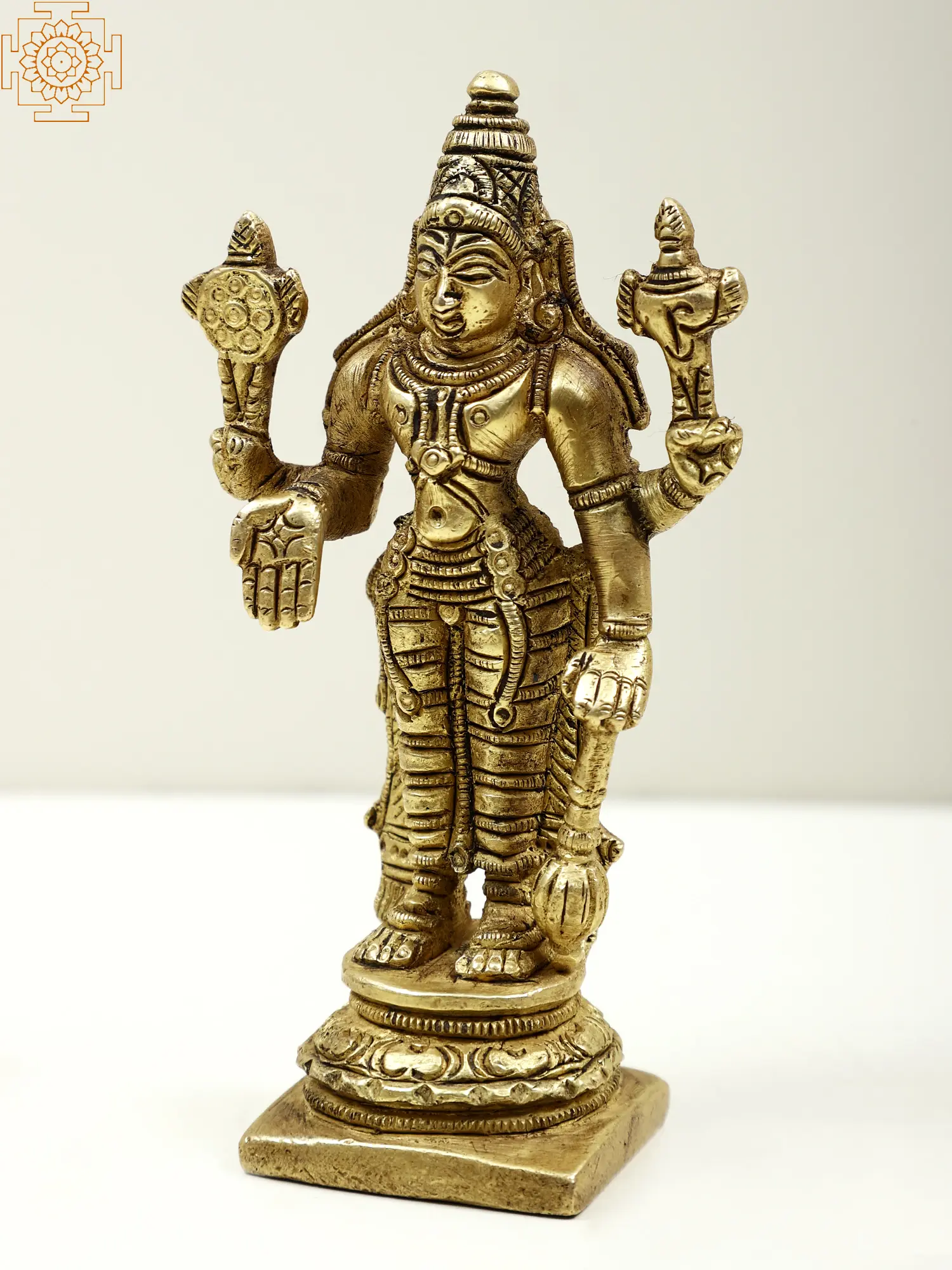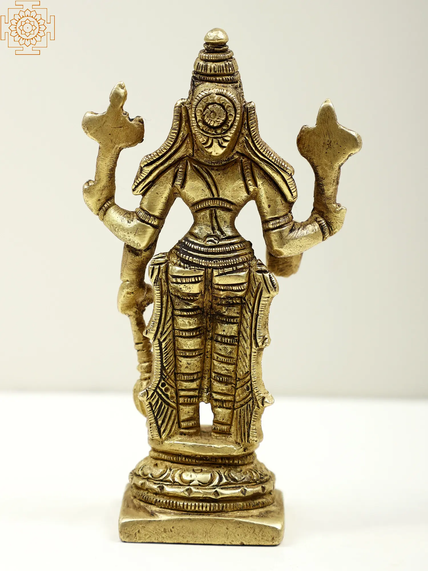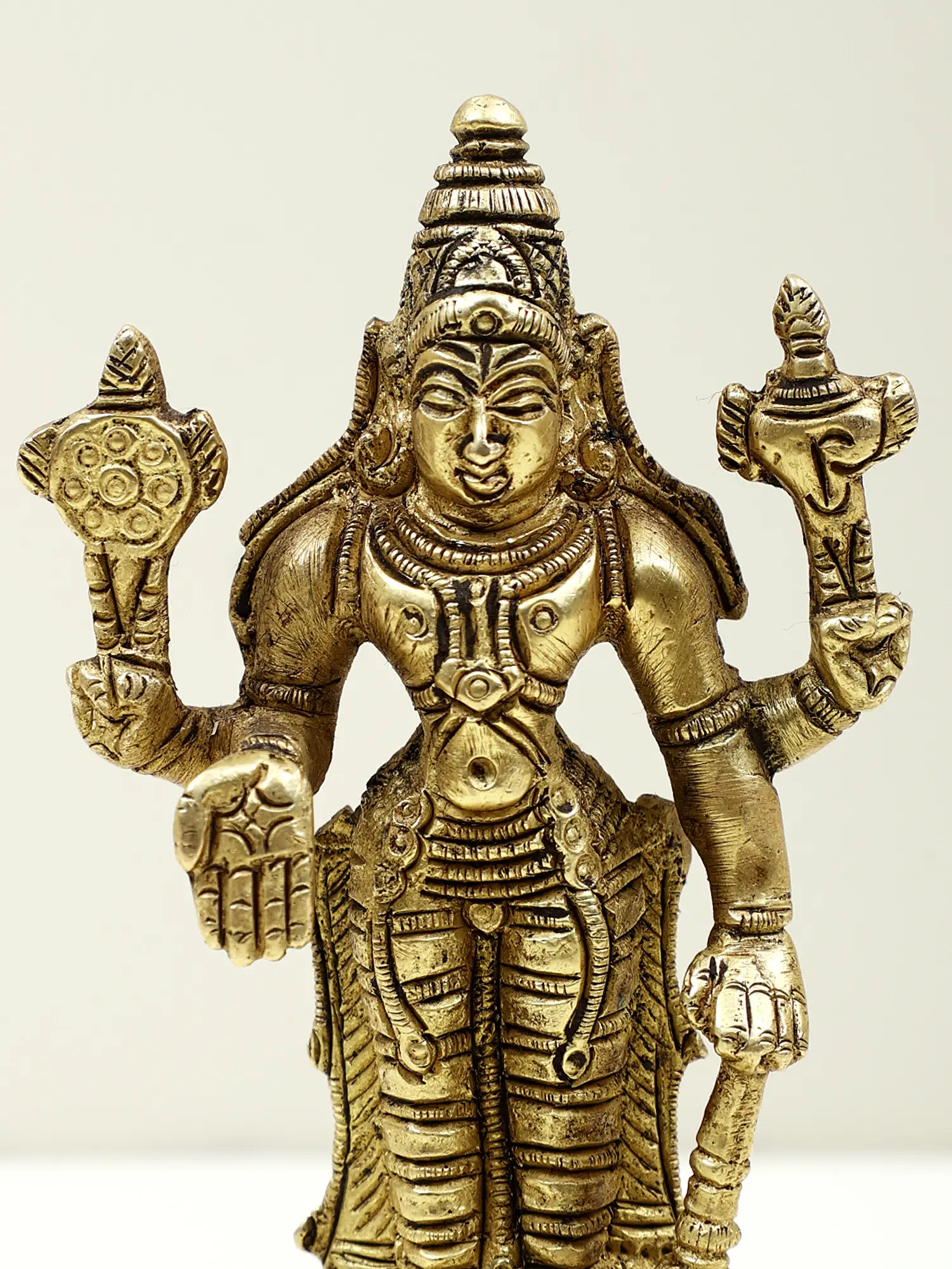 This Small Standing Bhagwan Vishnu holds immense significance in Hinduism as the preserver and sustainer of the universe. Revered as one of the principal deities in the Hindu pantheon, Vishnu embodies divine qualities of compassion, righteousness, and protection. His representation standing upright symbolizes his eternal vigilance and unwavering commitment to maintaining cosmic order and balance. Devotees worship Vishnu to seek his blessings for harmony, prosperity, and spiritual liberation. Through his divine presence, Vishnu inspires followers to uphold righteousness and strive for inner evolution, reminding them of the eternal cycle of creation, preservation, and dissolution that governs existence.