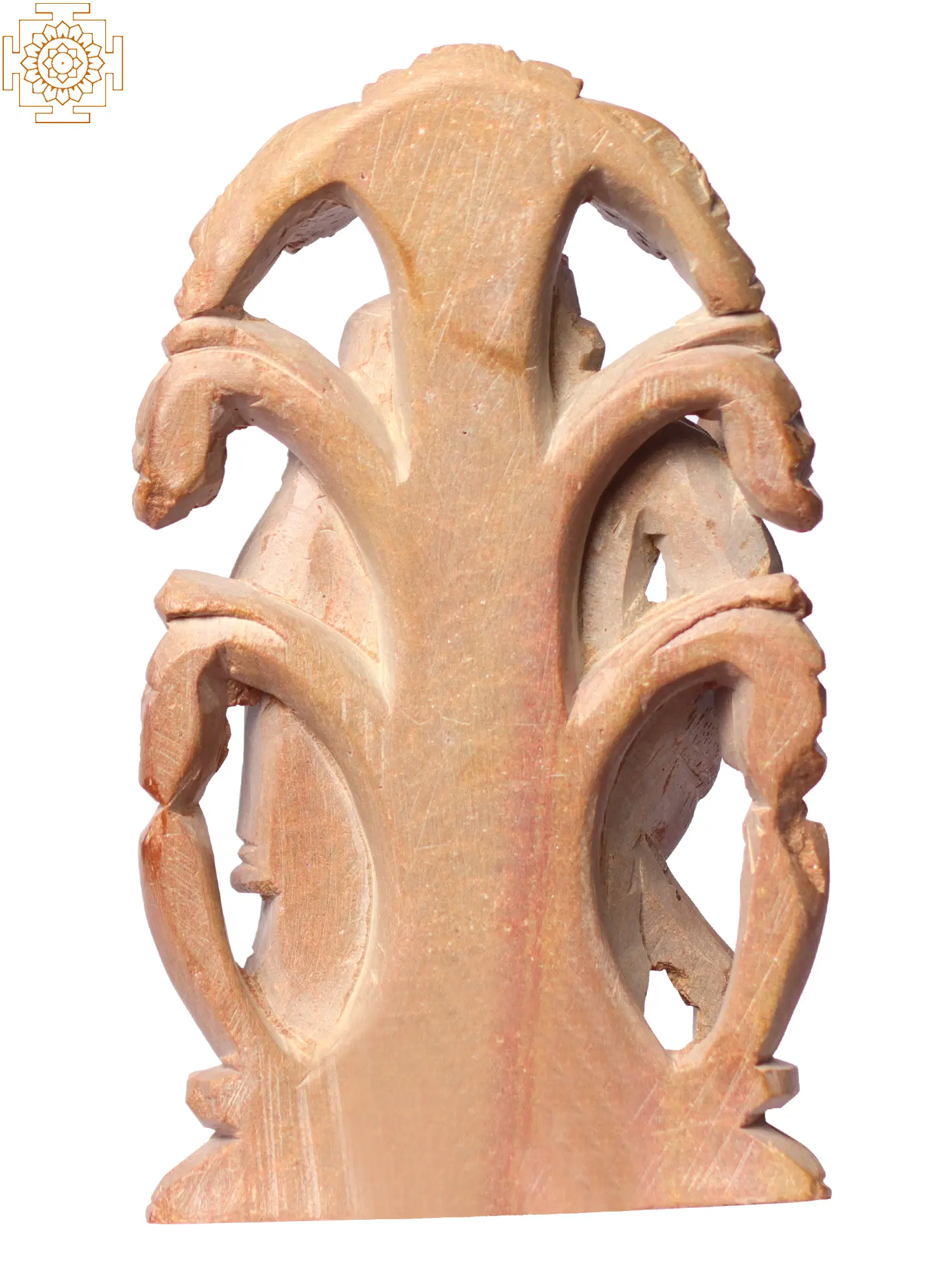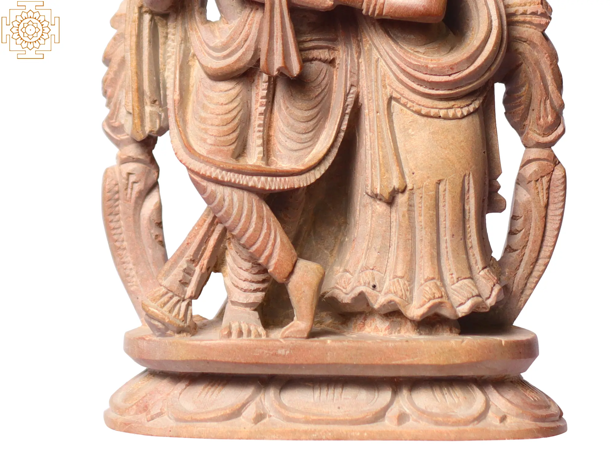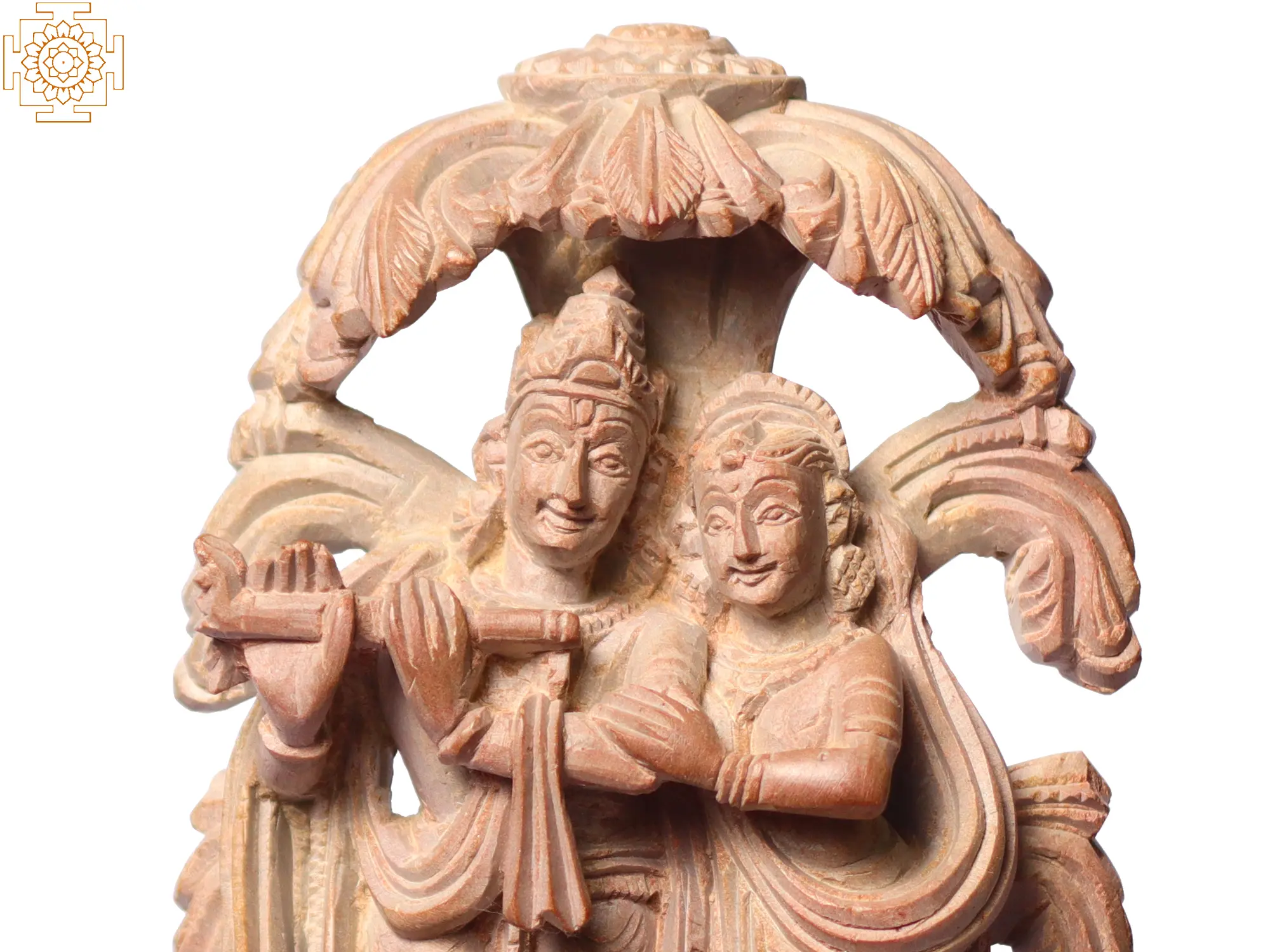 The meticulously carved sculpture of Radha and Krishna, the divine lovers, standing together under a sacred tree depicting the eternal bond of love they both share. The pink stone's gentle hues embody love and compassion. Radha and Krishna's divine bond symbolizes the eternal love between the soul and the divine. The tree represents the nurturing environment of devotion, where love flourishes and hearts unite. This artwork is the epitome of unconditional love and devotion in our lives, for it is within this sacred union that we find profound joy, purpose, and a connection to the universal cosmic dance.