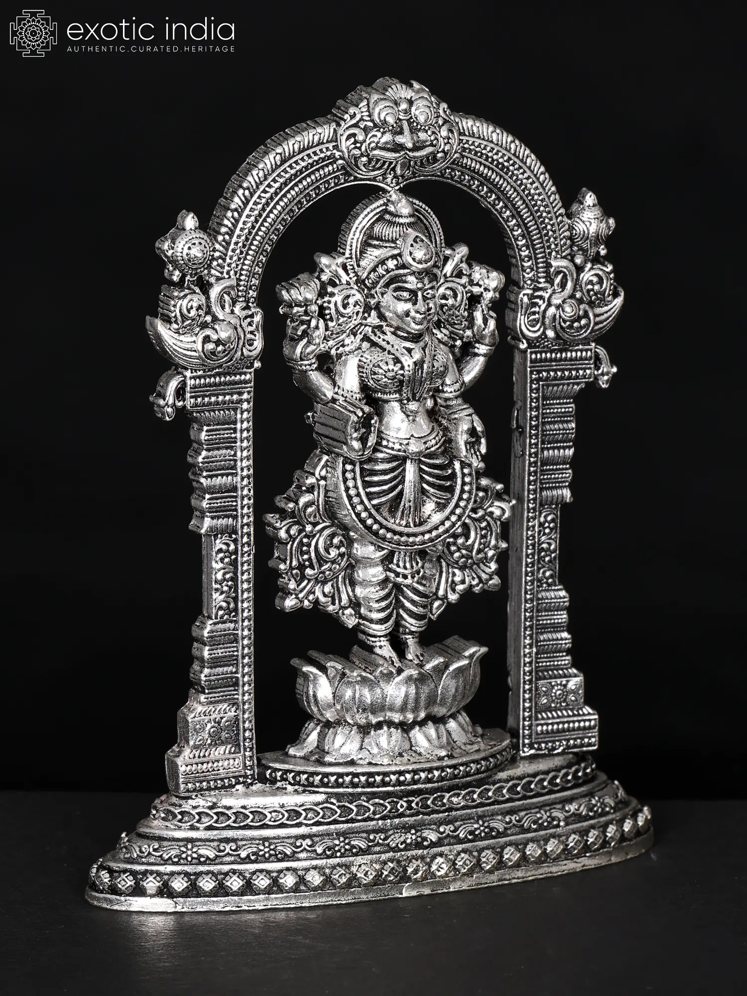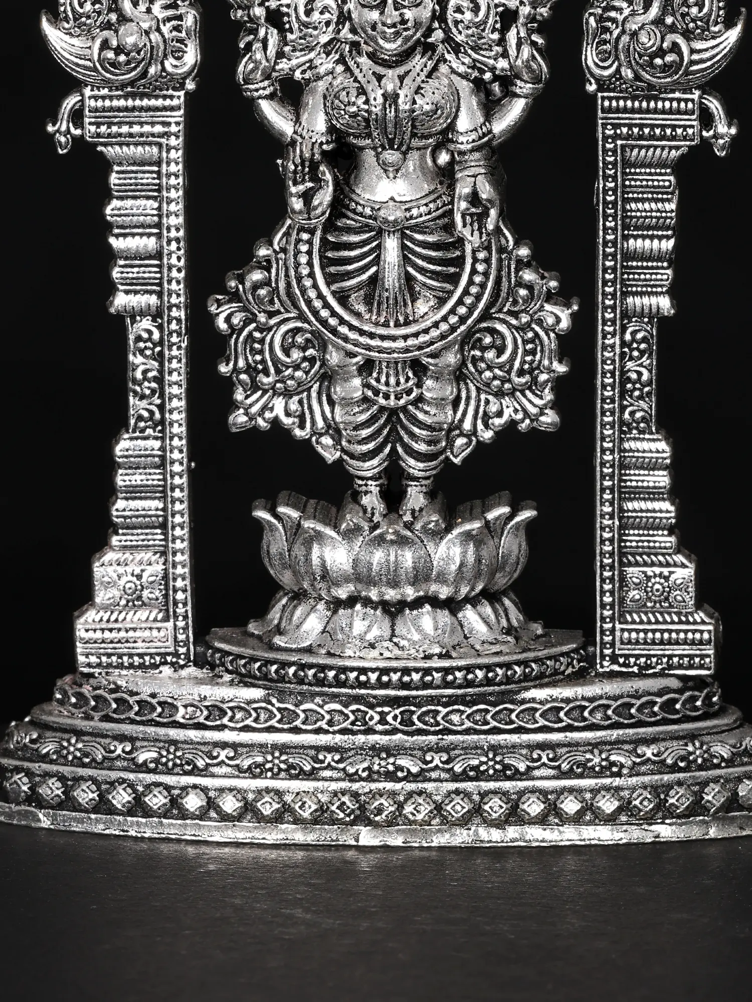 This exquisite 4-inch brass statue depicts Lakshmi, the Hindu goddess of wealth, fortune, and prosperity. She stands gracefully on a lotus flower, a symbol of purity and enlightenment, within an intricately carved torana (archway), adorned with a Kirtimukha, a benevolent face often associated with gateways and signifying protection and good luck. Lakshmi, with her four arms, represents her multifaceted blessings: abundance, fertility, power, and liberation. The meticulous detail and craftsmanship of this piece bring the divine energy of Lakshmi into your home or sacred space. The silver-toned brass finish adds a touch of elegance and reverence, making it a truly captivating devotional piece.