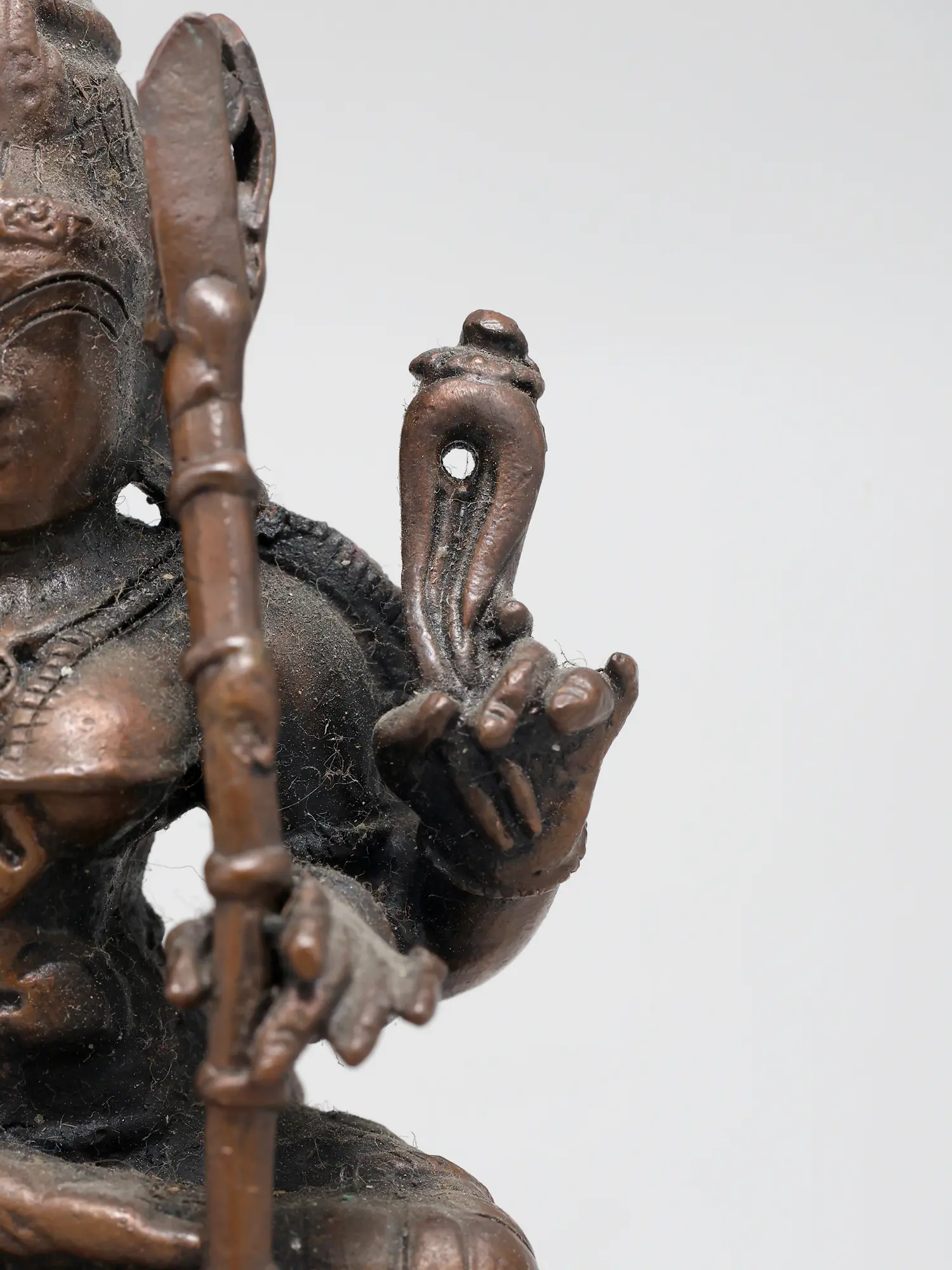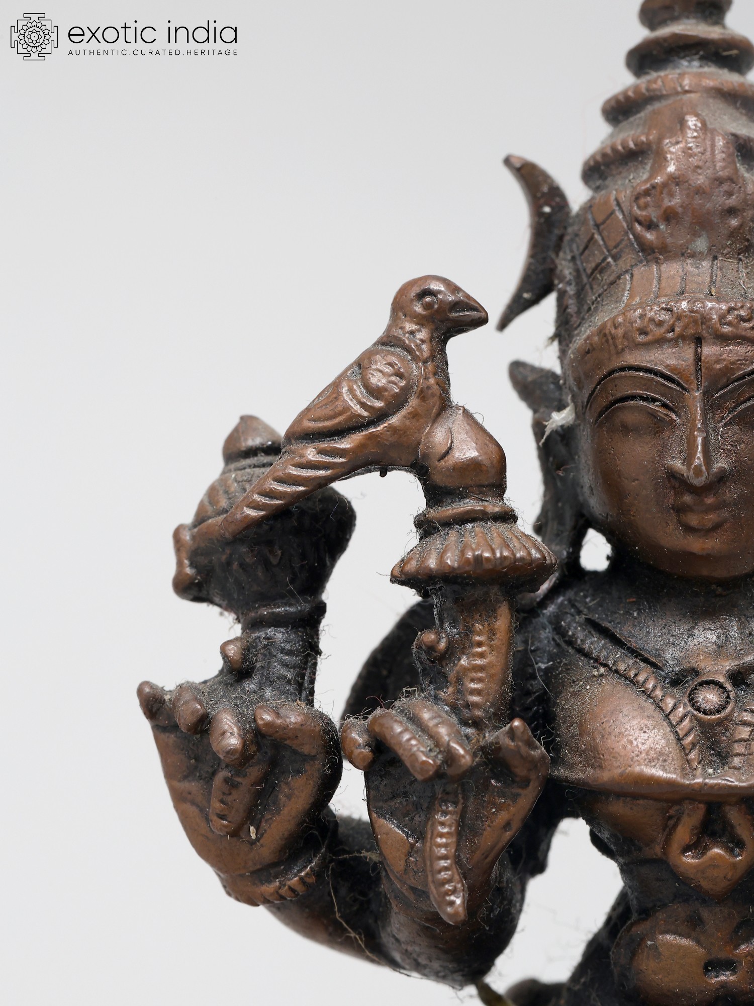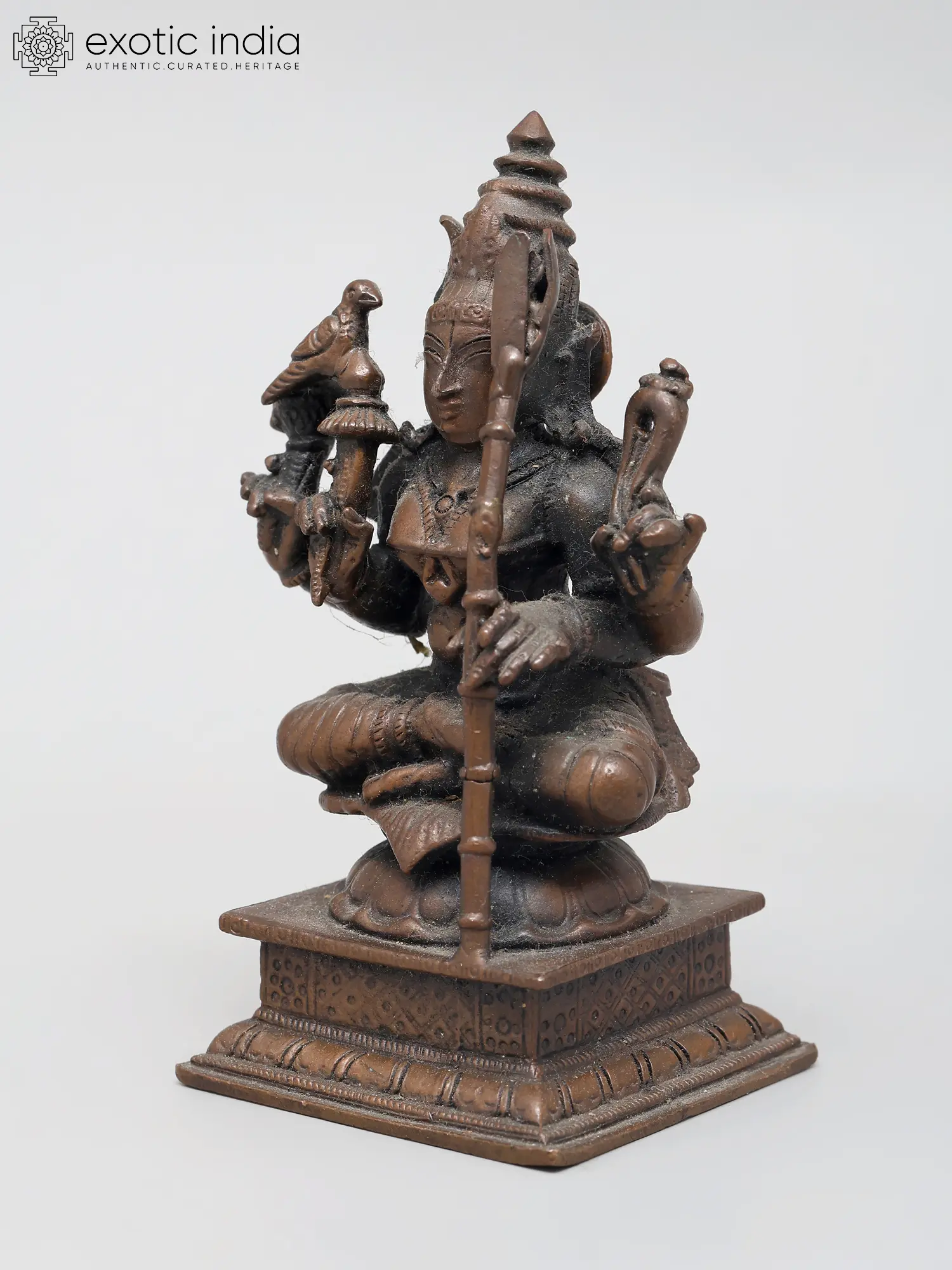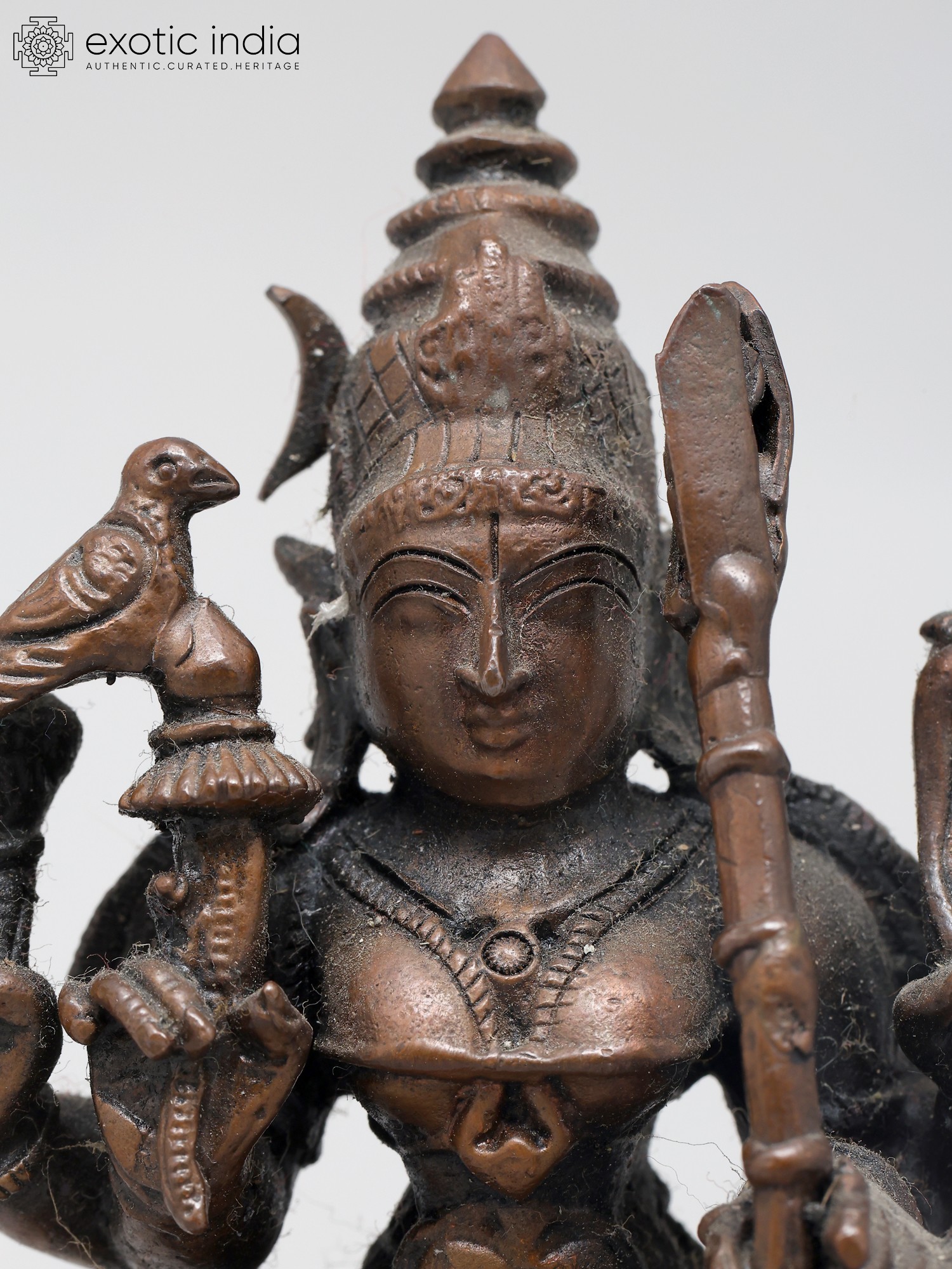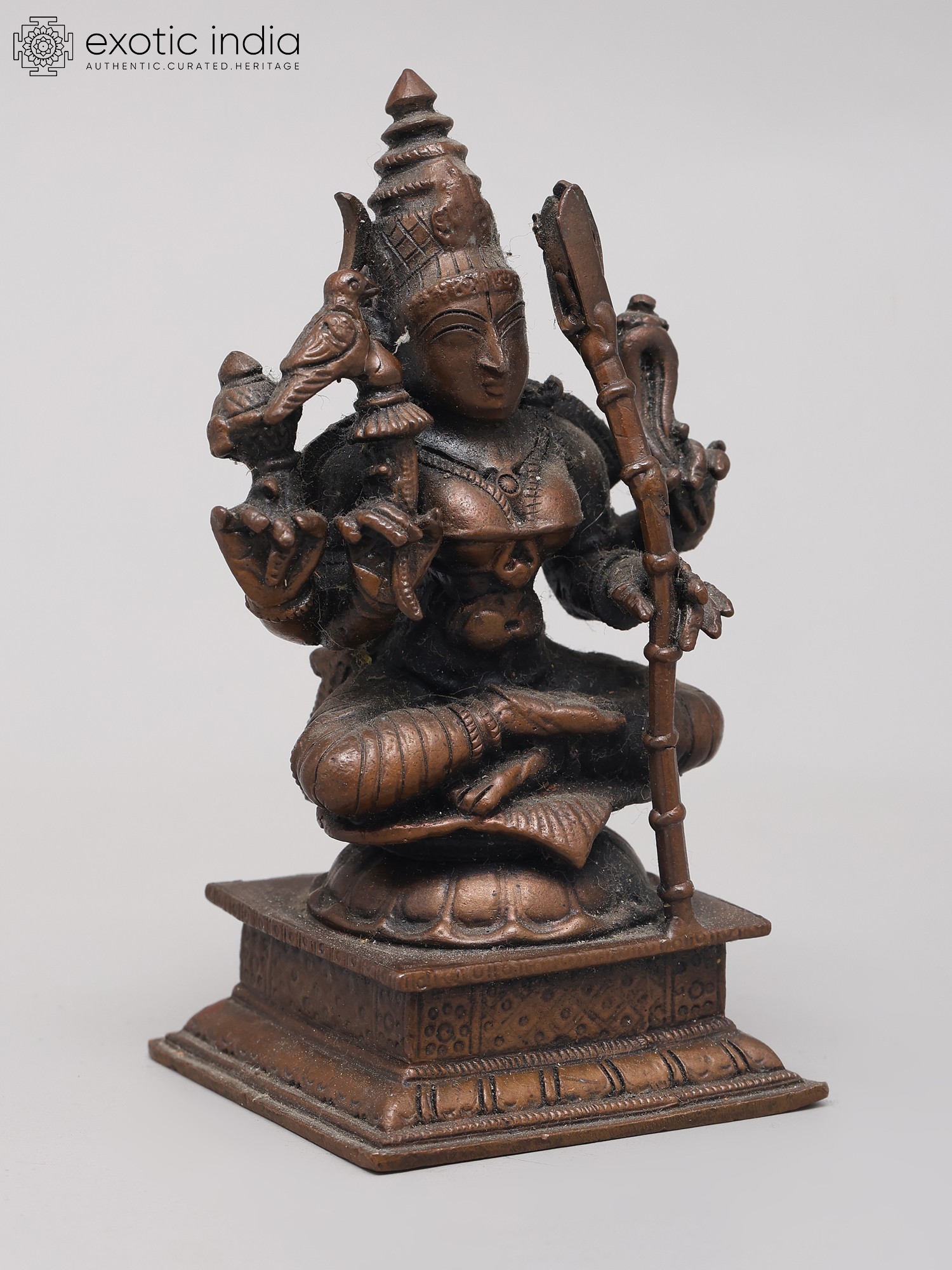 This statue is cast from high-quality copper, a material traditionally used for divine idols due to its conductivity and auspicious properties in Hindu traditions. The superfine detailing, from the delicate fingers to the elaborate headdress, speaks to the skill of the artisans who brought this divine form to life. The compact size makes it an ideal centerpiece for a personal altar, a meditation space, or a display cabinet where its spiritual presence can be felt daily. Each curve and line is imbued with reverence, making this not just a decorative piece, but a conduit for spiritual connection and a tangible piece of sacred art.