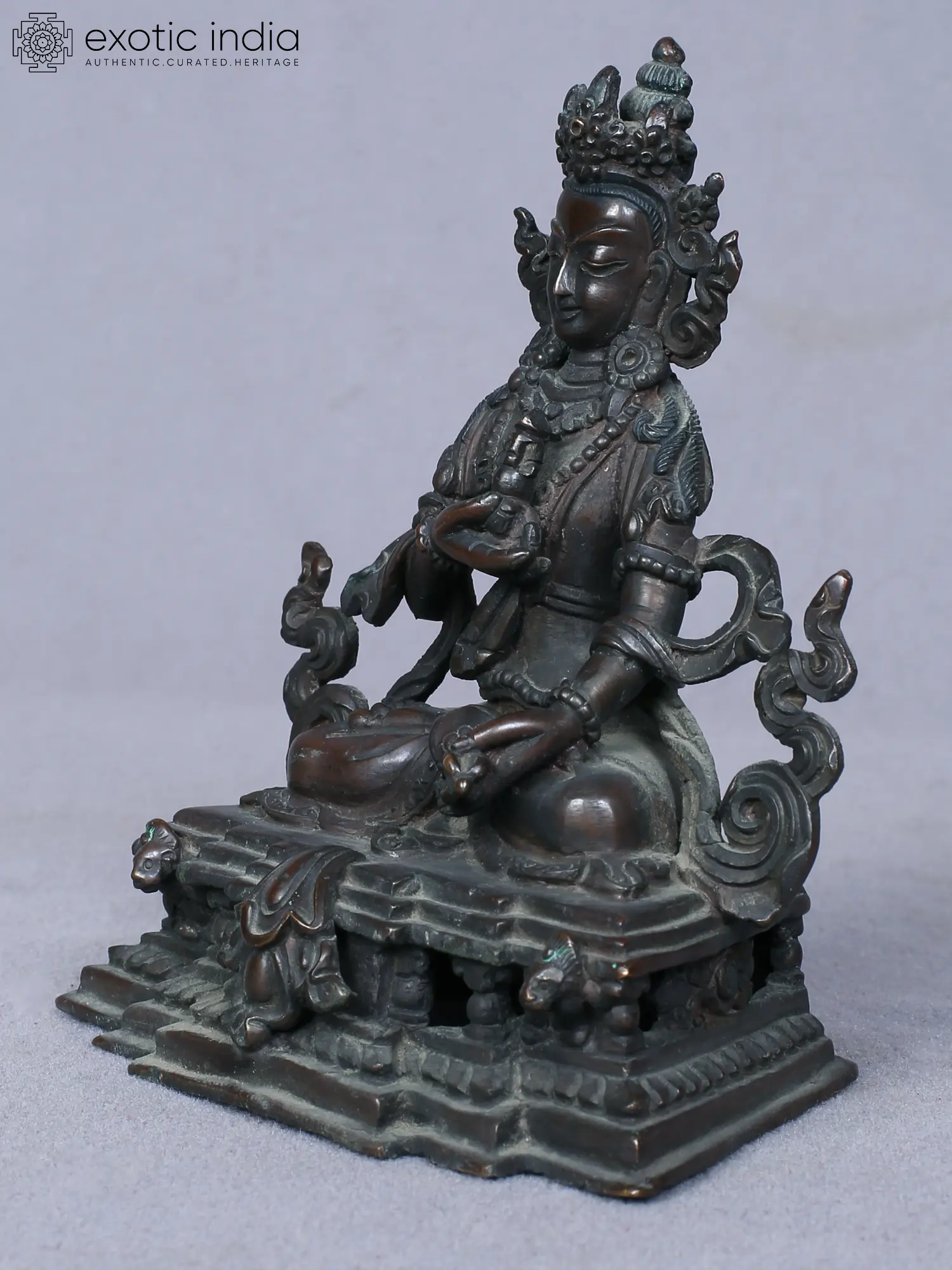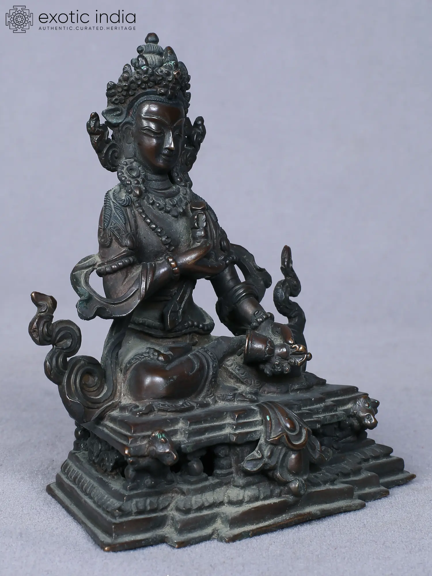 This statue captures the serene essence of Vajrasattva. He is depicted seated in the vajra posture, a symbol of unwavering stability and enlightenment. His right hand holds the vajra, a ritual implement representing indestructibility, the potency of wisdom, and the skillful means to cut through ignorance. In his left hand, he holds the bell, ghanta, representing emptiness, compassion, and the feminine principle. The bell's sound is believed to awaken beings from their slumber of delusion. The statue's detailing reveals a wealth of symbolic meaning. Adorned with a crown, necklaces, armlets, and bracelets, Vajrasattva embodies the qualities of a fully realized being. The elaborate ornamentation reflects his inherent perfection and the enlightened state. The serene expression on his face exudes compassion and wisdom, inviting the devotee to connect with their own innate potential for enlightenment. The intricate platform beneath him is decorated with mythical animals, possibly snow lions. Snow lions symbolize fearlessness, strength, and joy in Tibetan Buddhism.