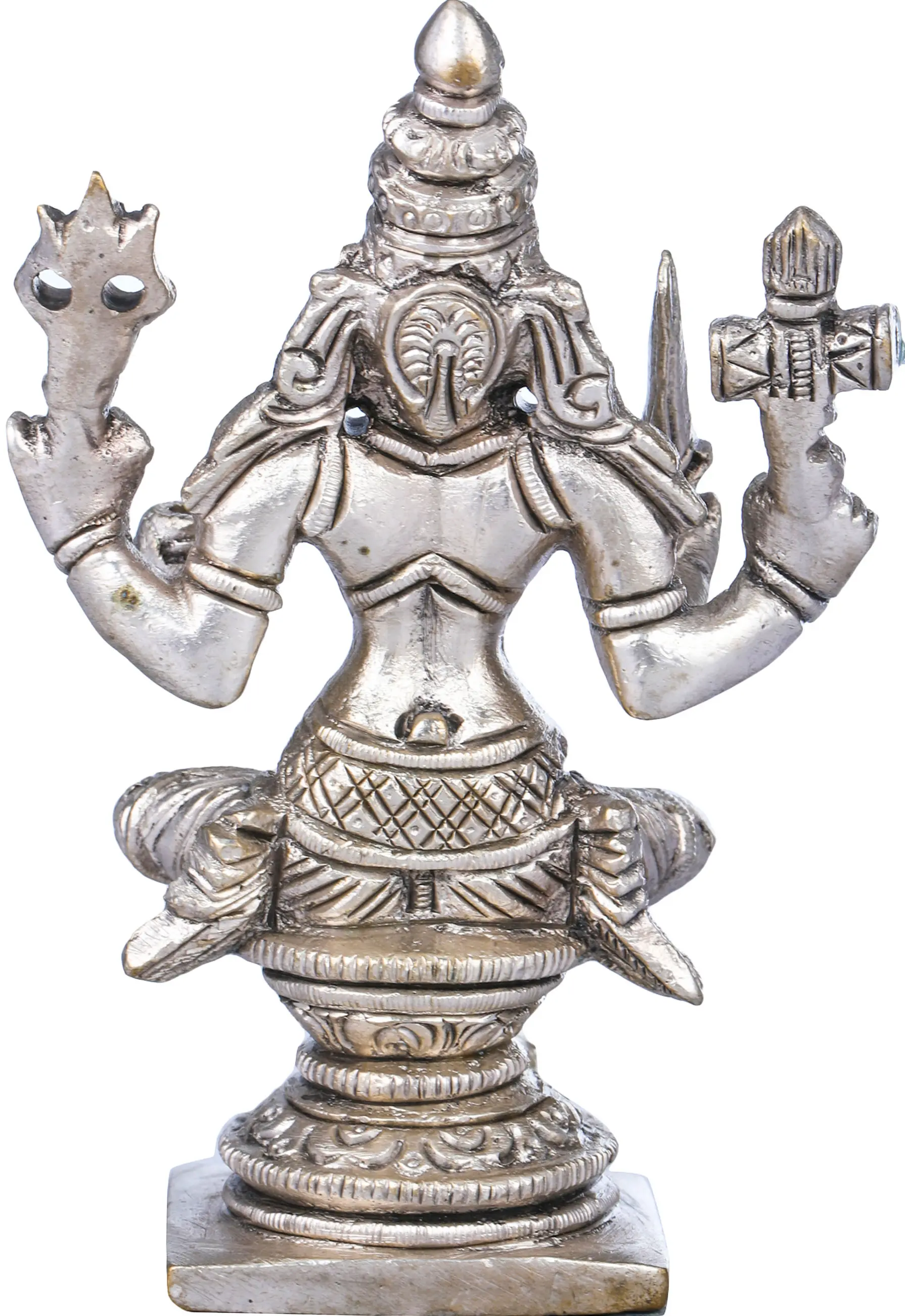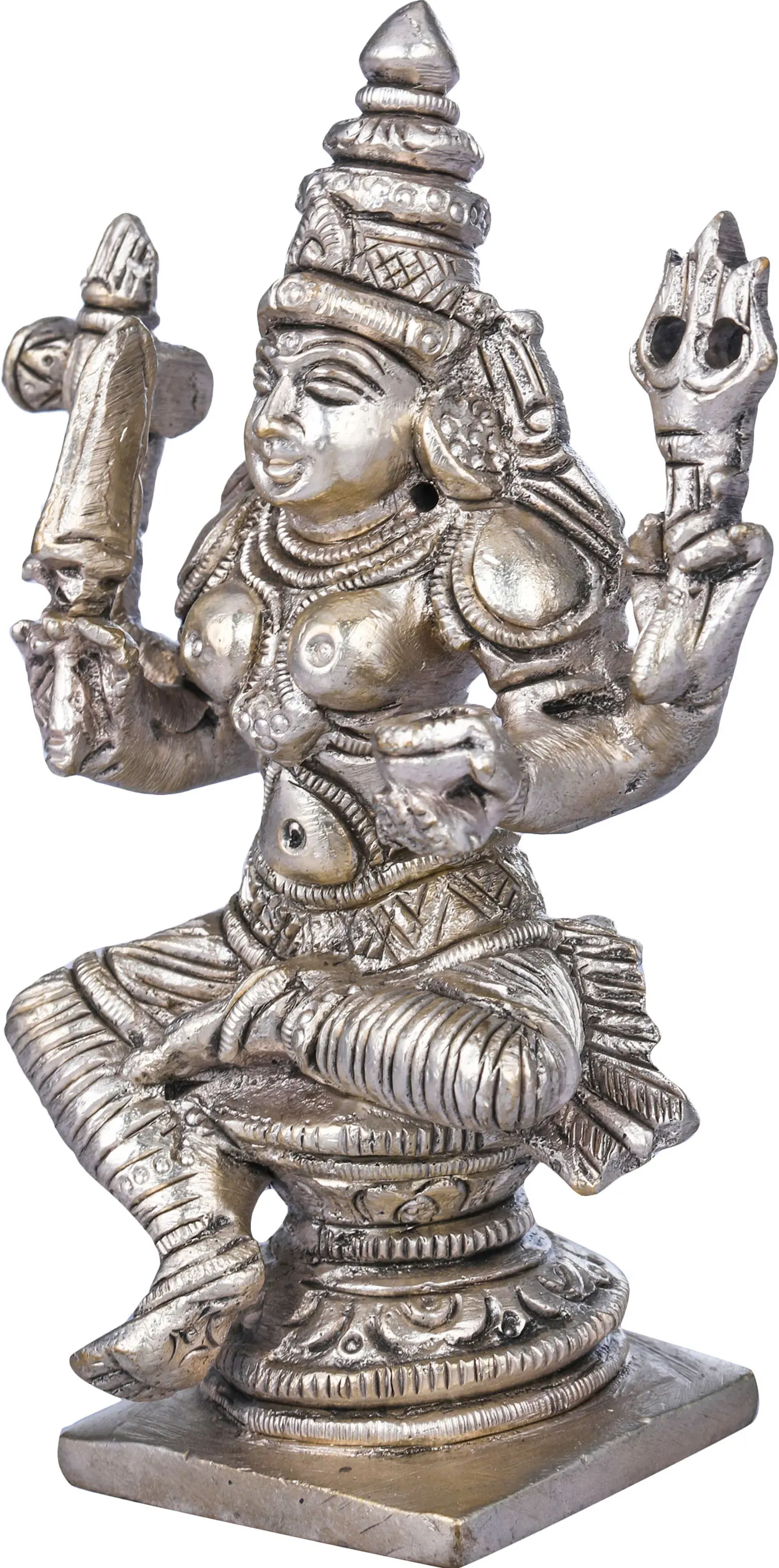 As her name signifies, Mariamman (Mari-rain, Amman-mother), is the supreme revered aspect of the goddess in Southern India, evoked by devotees as the bringer of rains and a powerful protectress. Devi Mariamman in this brass statue sits in the regal Lalitasana, in her four-armed form, carrying a trident, damru, and sword as attributes that associate her with warring Hindu goddesses such as Durga and Kali.