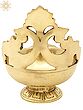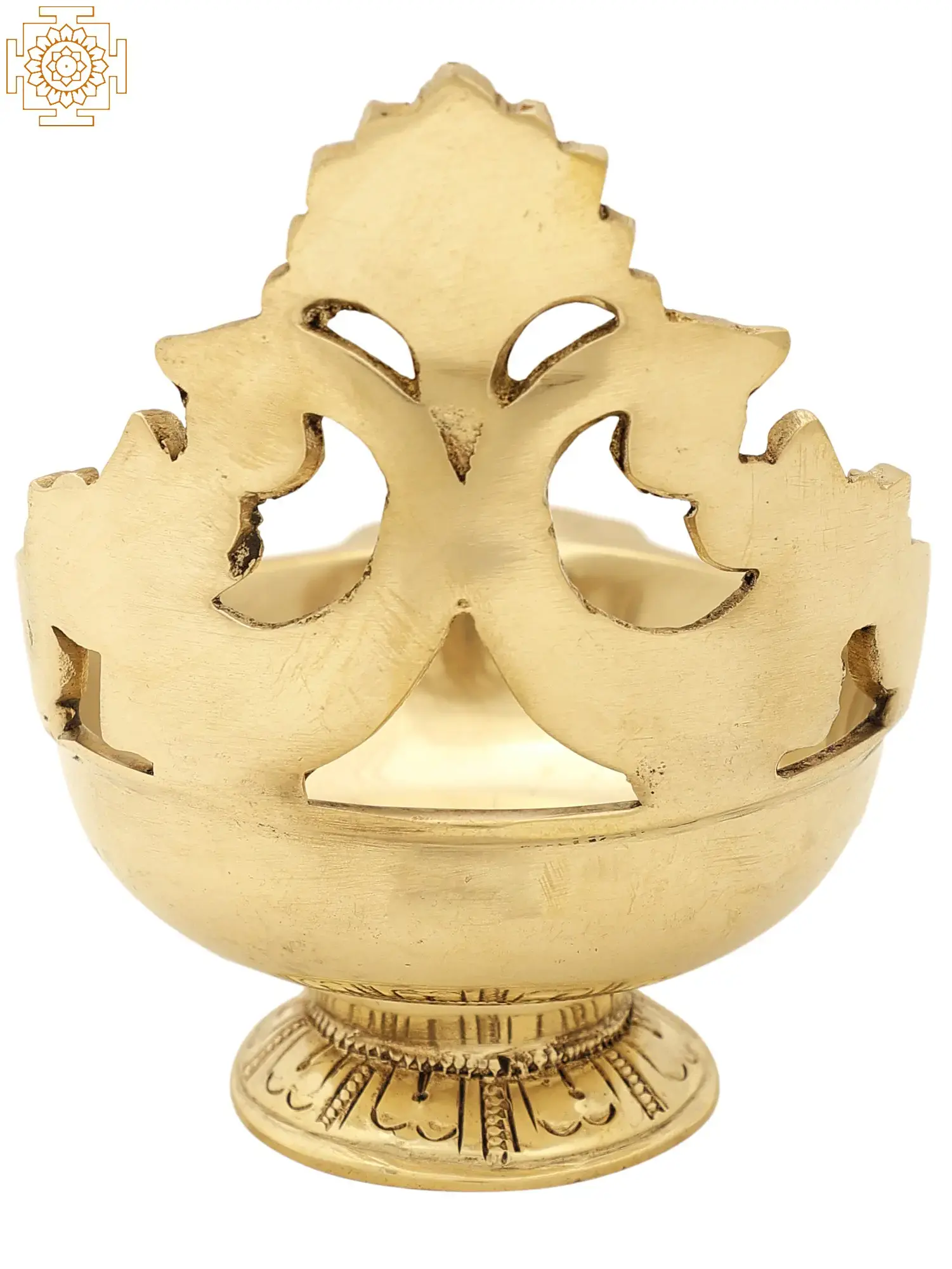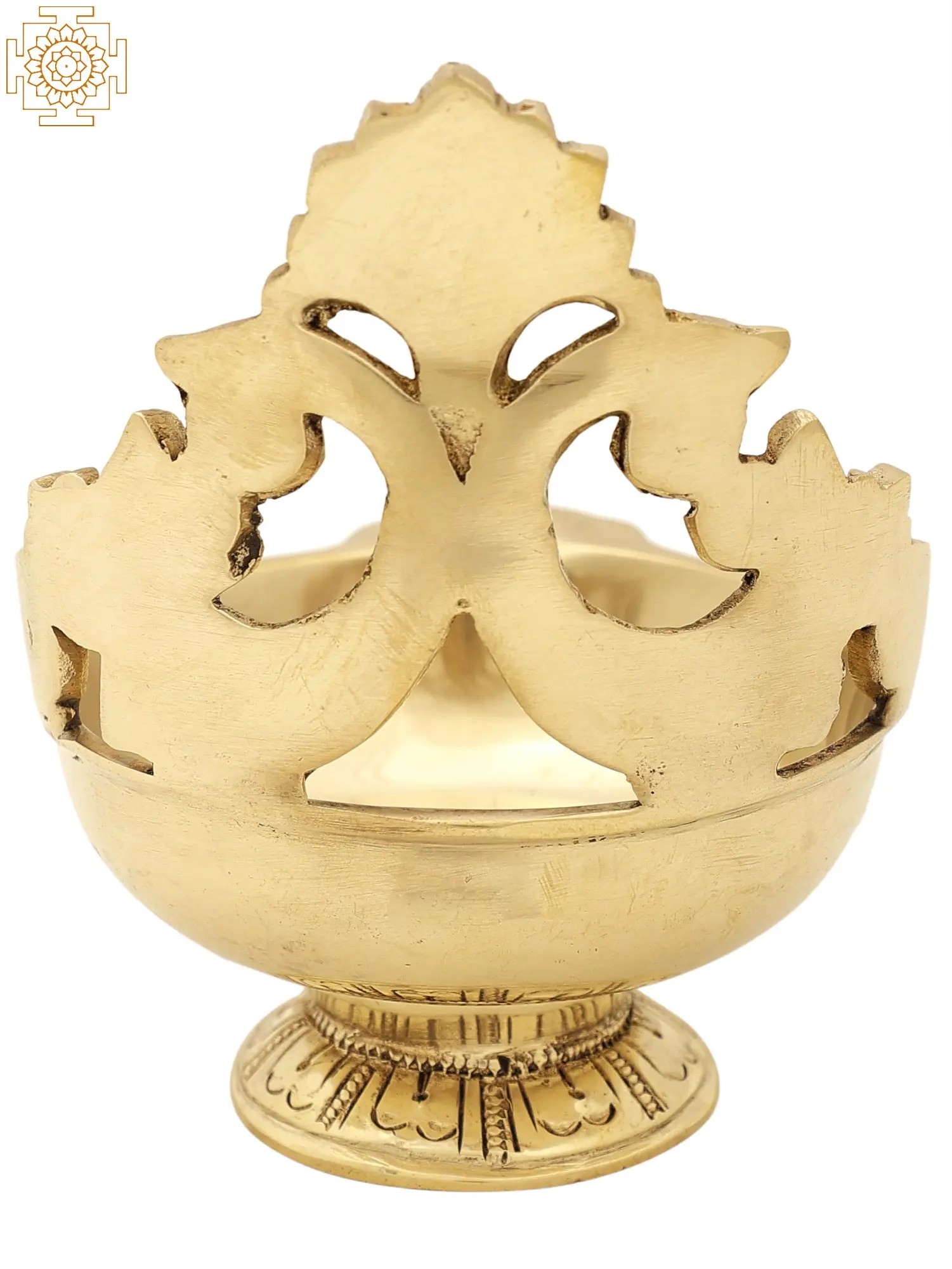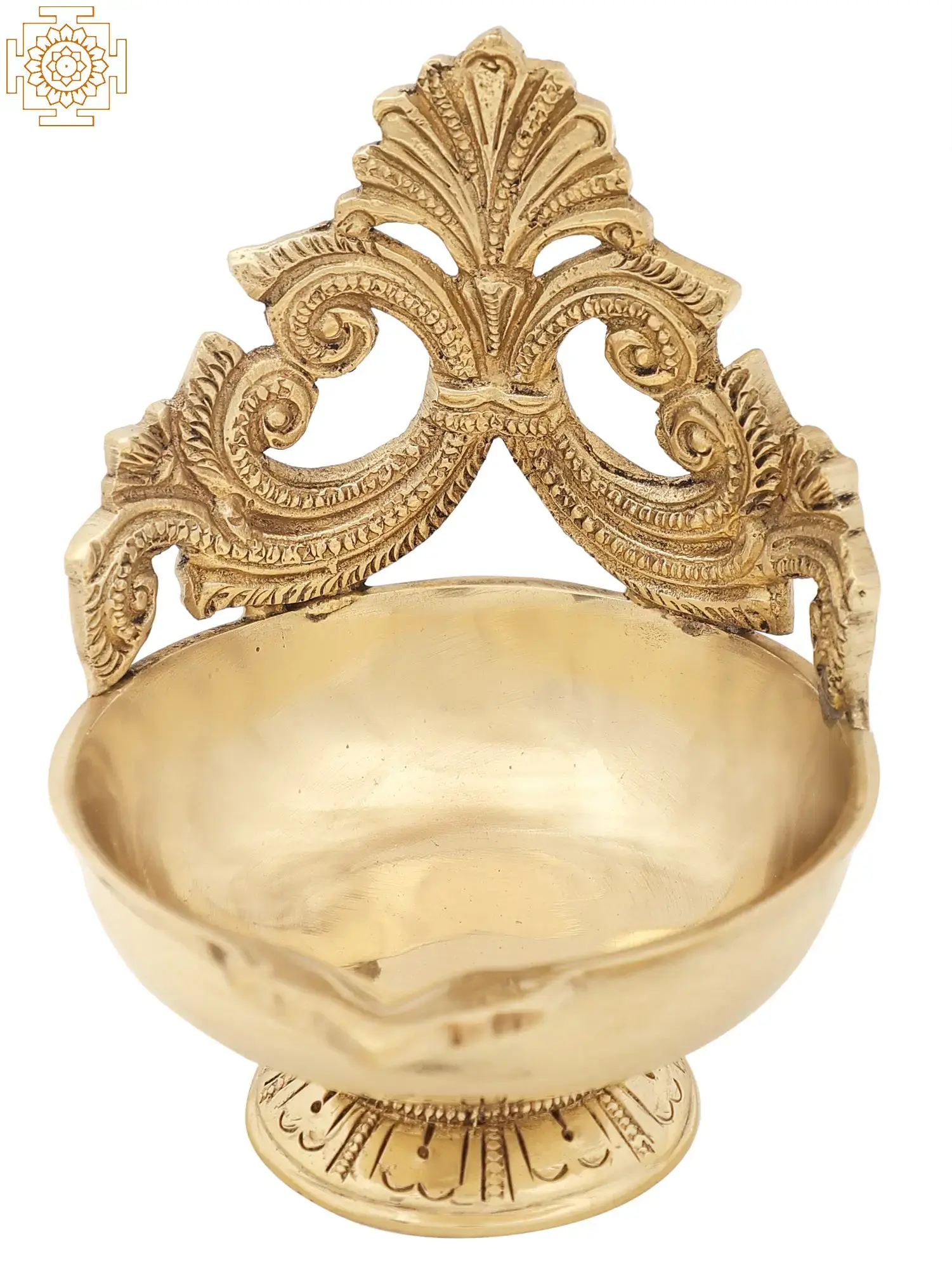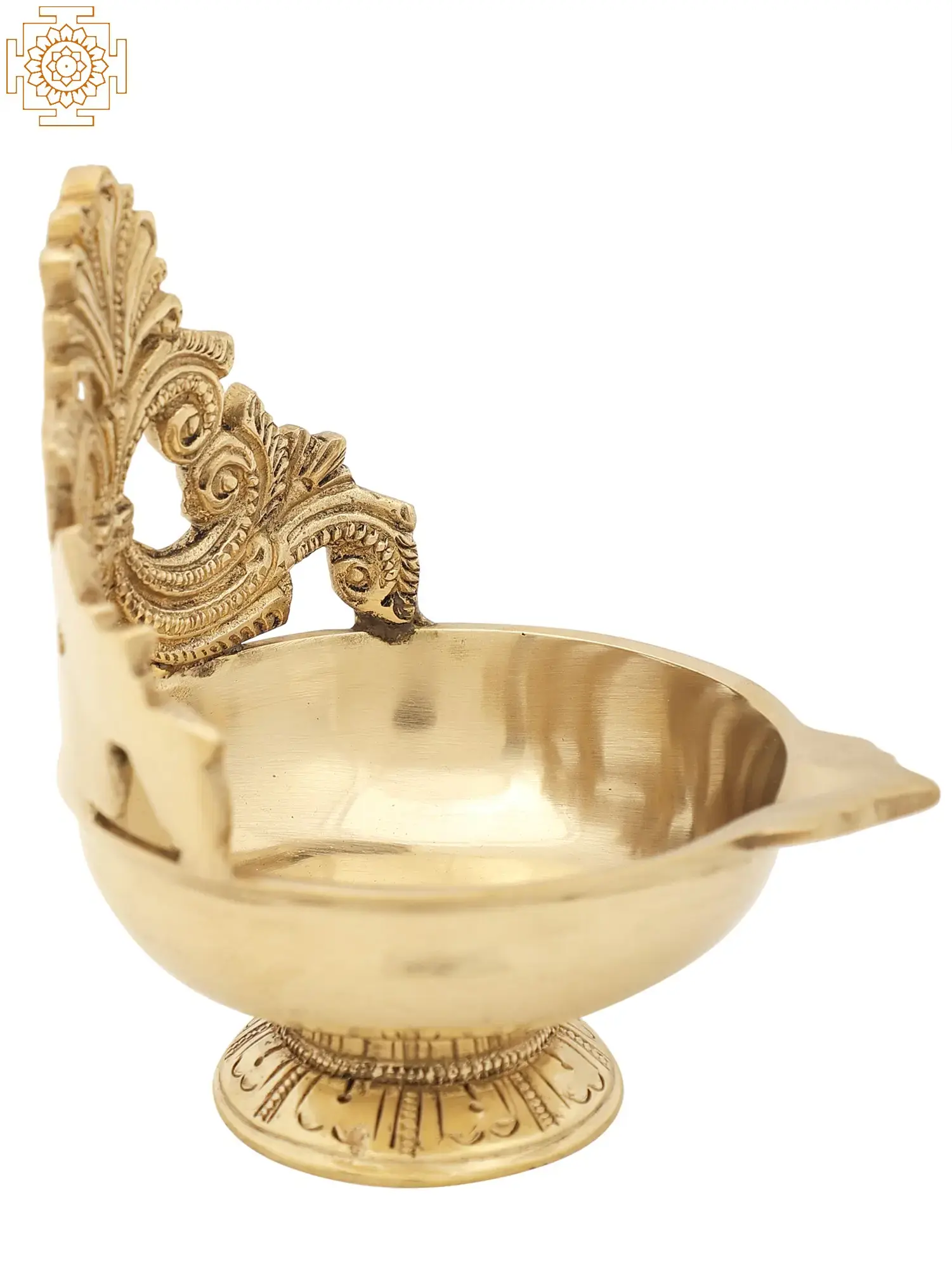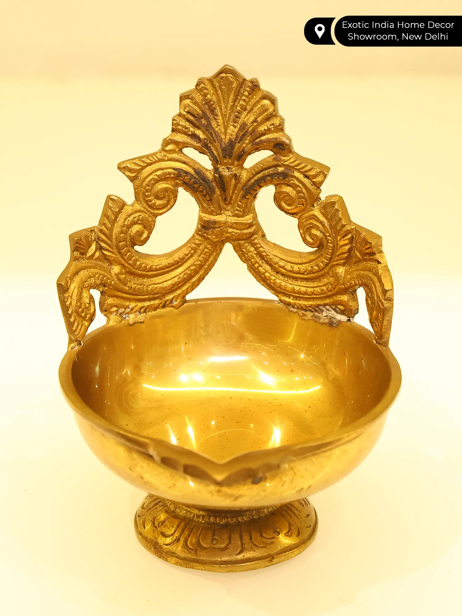 This lovely designed brass light is called an Aidai Deepam, or pedestal lamp. This lamp, made primarily of brass, is embellished with delicately coiled vines on the head or backbone of the lamp. These vine constructions are loosely based on the ornaments used to adorn the Salabhanjika, the exquisite female figures carved on the walls of Hoysala temples. This lamp's oil basin is highly elegant and wide, extending the standard leaf-shaped oil basin construction a step further. This lamp is a one-of-a-kind home décor piece that may also be utilized for ceremonial reasons to draw the almighty's blessings.
