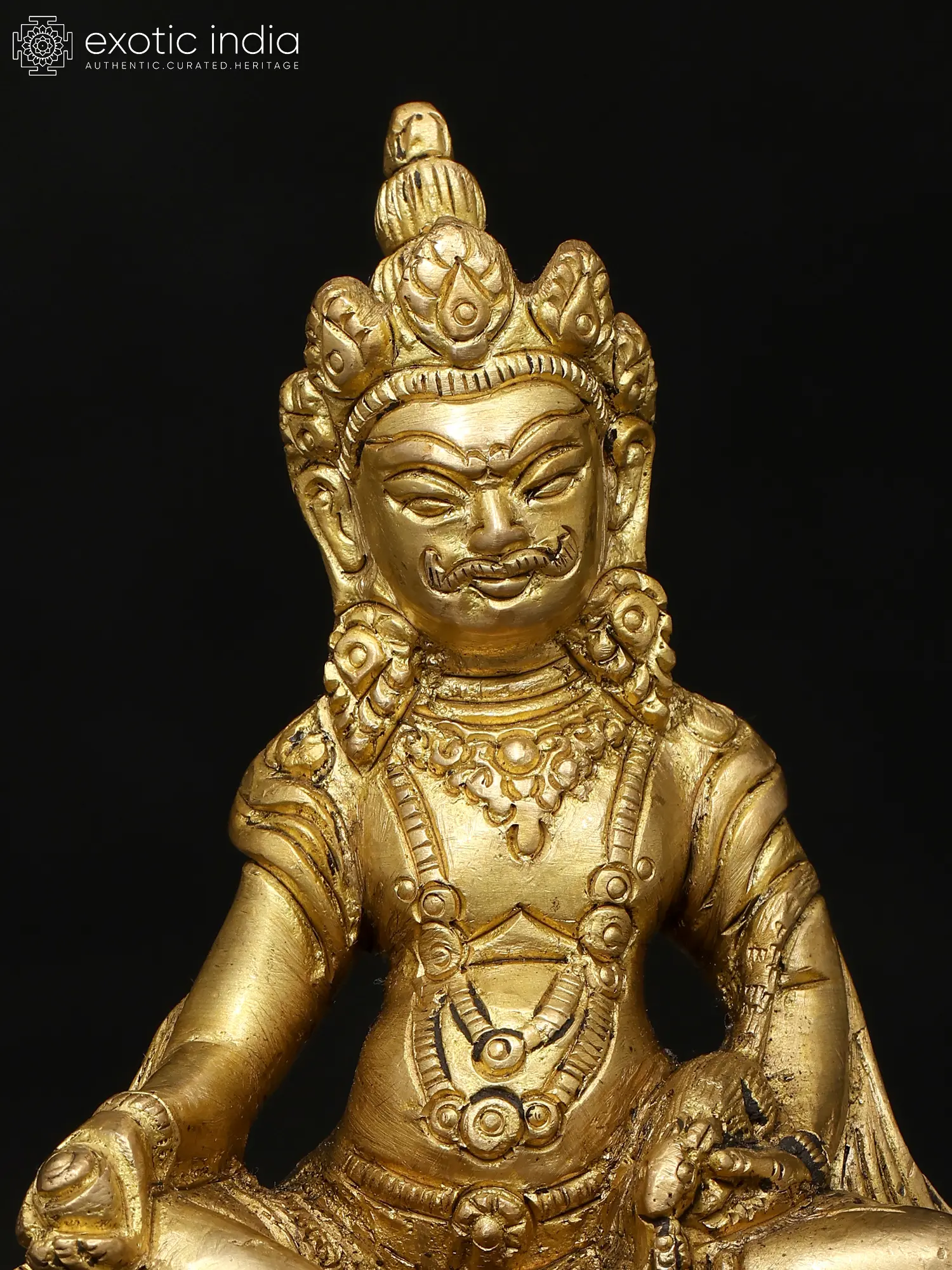 This exquisite brass statue depicts a revered figure in Tibetan Buddhism, embodying the essence of wealth, abundance, and spiritual fortune. Crafted with meticulous detail, the statue captures the serene yet powerful presence of a deity associated with the acquisition and distribution of treasures, both material and spiritual. The figure is seated in a meditative posture, a common representation of enlightenment and inner peace, suggesting that true wealth is found not just in possessions but in a balanced and enlightened mind.