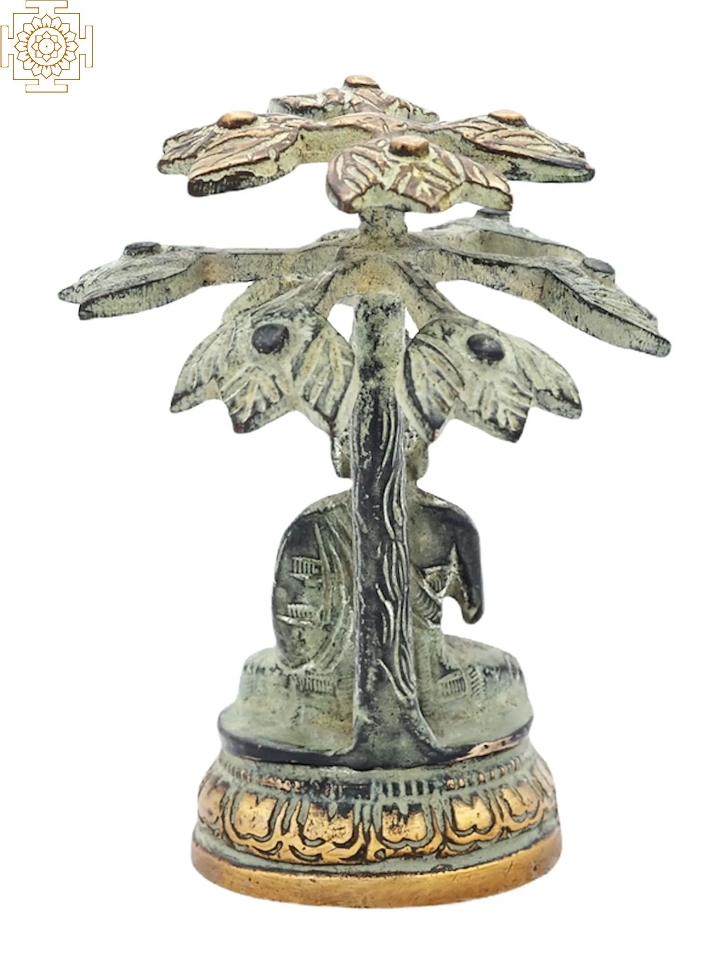 Beneath the sheltering embrace of the Bodhi tree, Siddhartha Gautama found enlightenment, becoming the Buddha. "The mind is everything. What you think, you become," he proclaimed. The Tibetan Buddhist Lord Buddha Seated Under a Tree sculpture is a remembrance of this transformative moment. The statue crafted in brass portrays the Buddha's serene contemplation. With eyes closed and hands in the Bhumisparsha Mudra, his touch signifies calling the earth to witness his enlightenment. Each delicate detail in this piece invites reflection, connecting us to the Buddha's heavenly journey.
