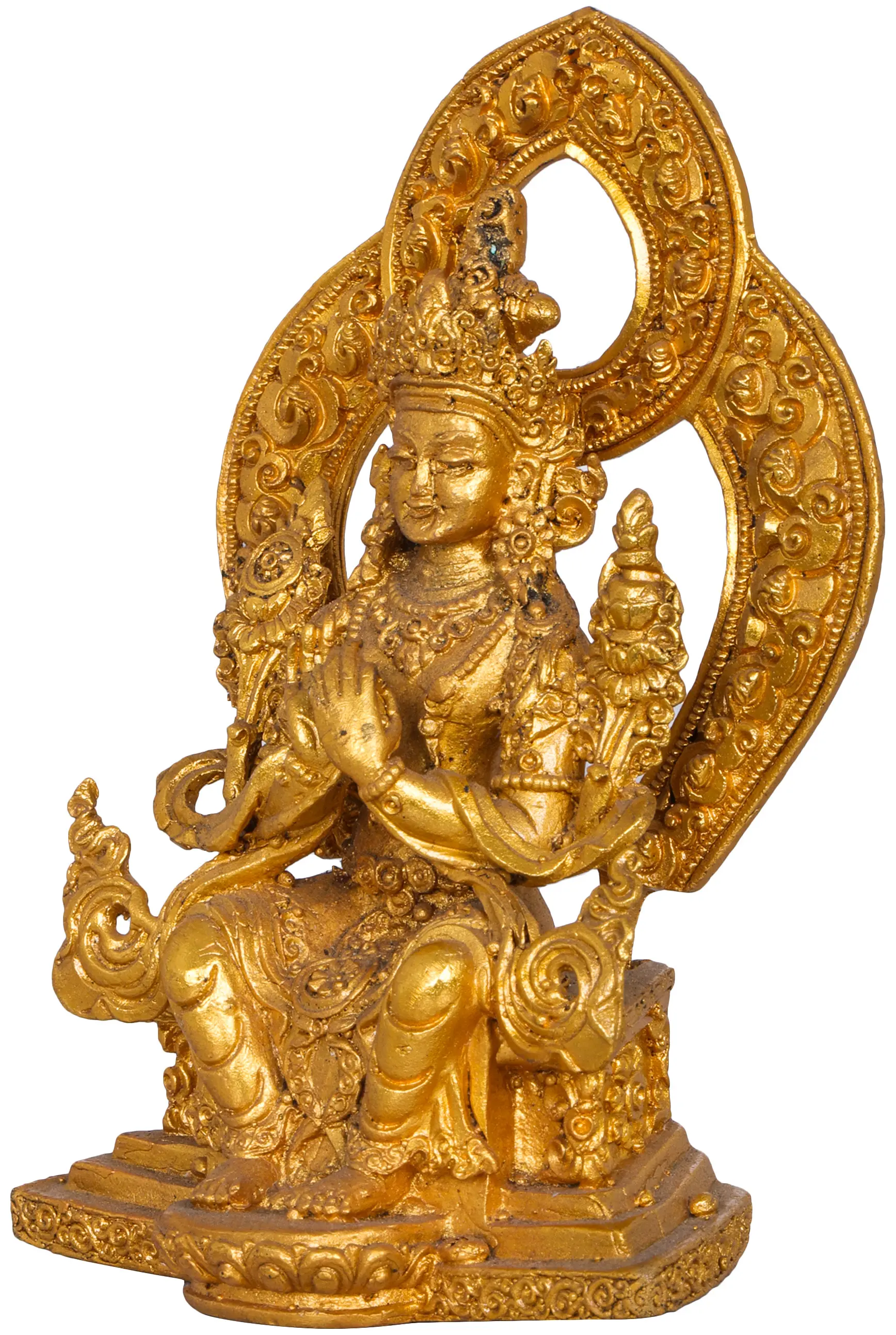 Whether placed in a personal meditation space, a place of worship, or as a focal point in your home, this Buddha statue serves as a constant reminder of the Buddha's teachings and the path to inner peace. Its compact size makes it versatile for various settings, allowing you to invite the tranquil energy of the Dharma into your life. The golden hue of the brass adds a touch of opulence and spiritual radiance, making it a striking and meaningful addition to any sacred collection or devotional practice. Its presence encourages mindfulness, compassion, and a deeper understanding of Buddhist philosophy.