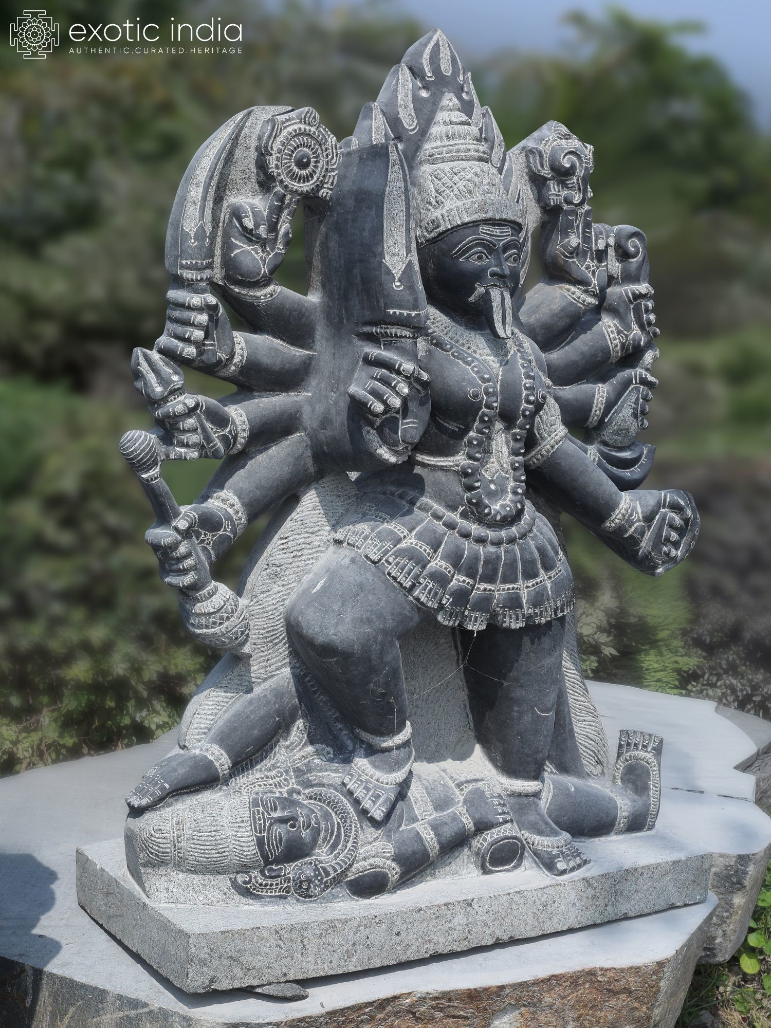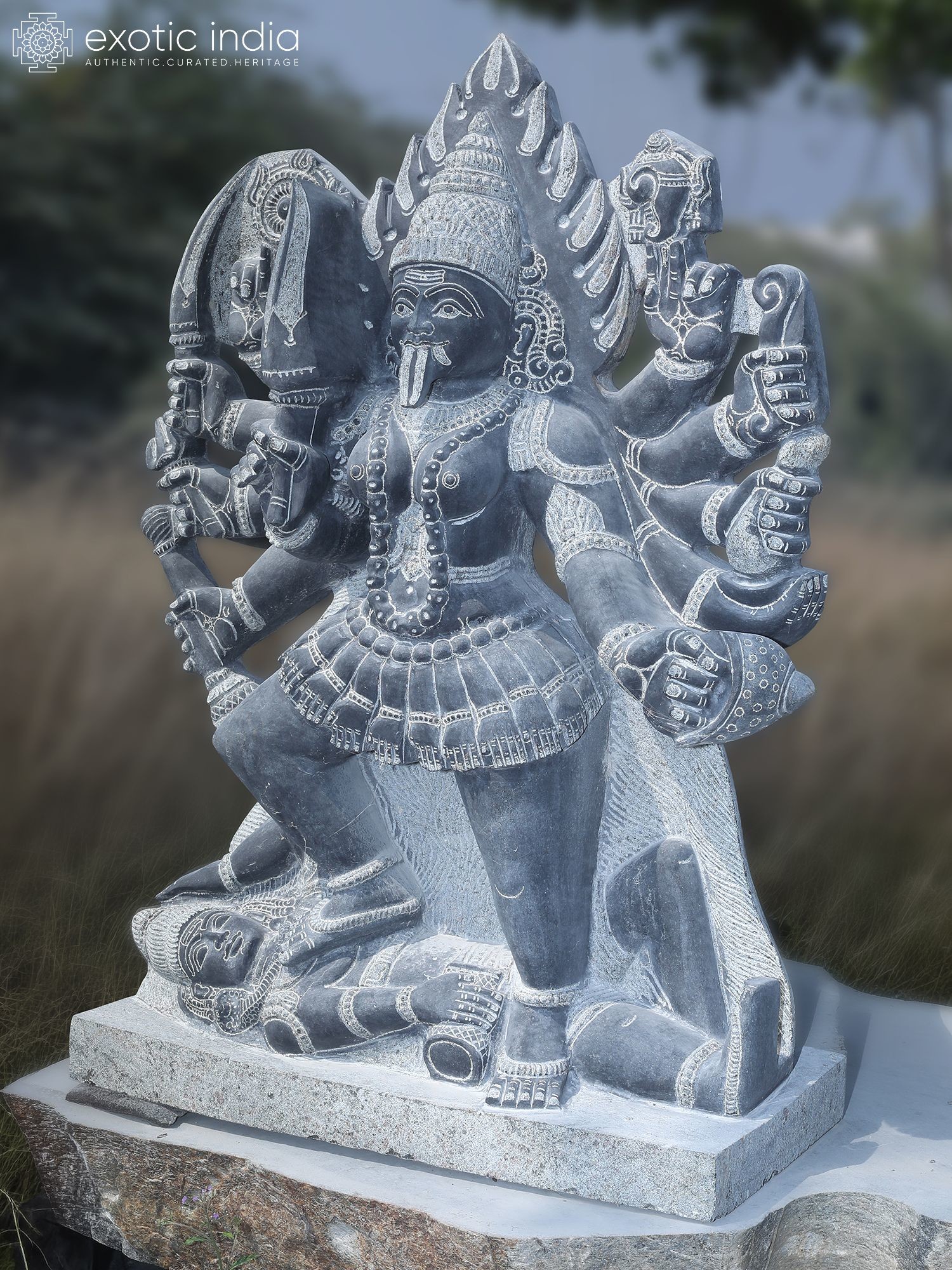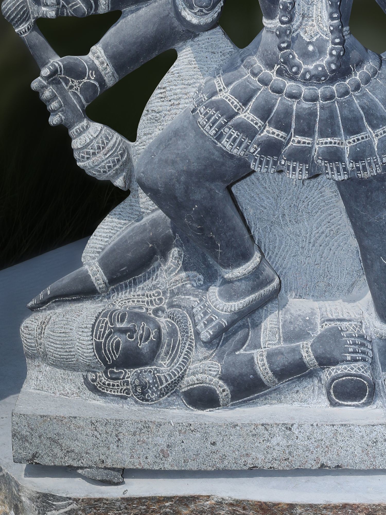 The base of the sculpture shows Kali standing upon a vanquished foe, symbolizing her triumph over evil.